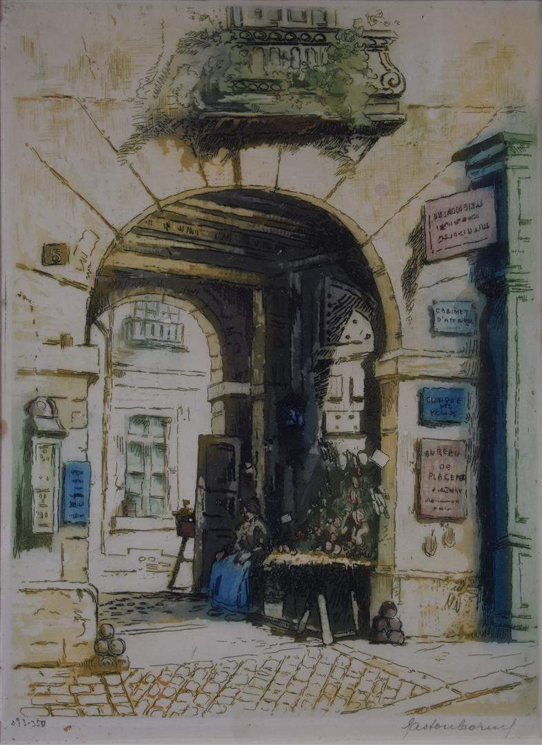 École de la fin du XIXe ou du début du XXe siècle. Échoppe dans un passage. Lithographie en couleurs portant une signature en bas à droite et numérotée 273/350 en bas à gauche (papier légèrement jauni). 31 x 23 cm (à vue).