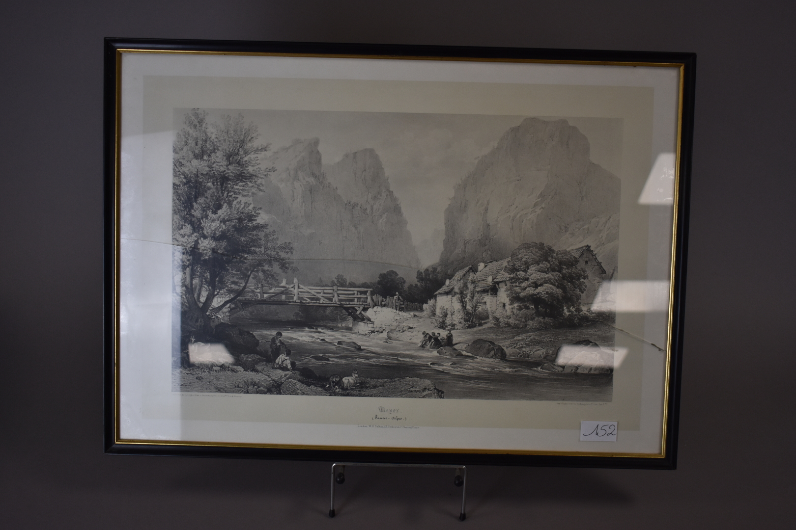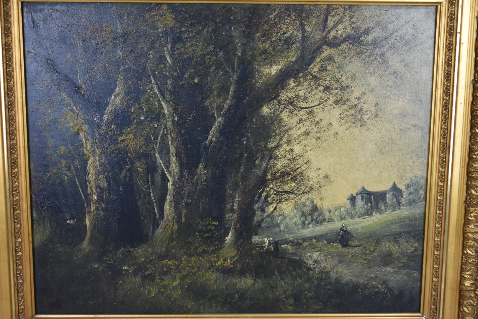 Ecole de la fin du XIXe ou du début du XXe siècle. Paysage aux arbres et château dans le lointain. Huile sur toile portant une signature en bas à gauche (quelques accros). On joint un ensemble de pièces encadrées, principalement des reproductions et des gravures.