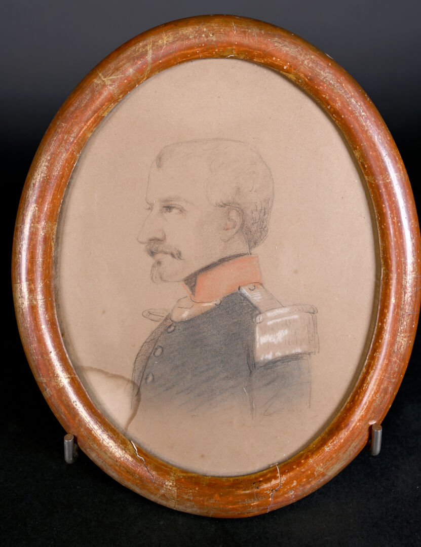 Ecole de la fin du XIXe ou du début du XXe siècle. Portrait de militaire. Dessin à vue ovale au crayon, craie et pastel (mouillures, papier jauni). 23,5 x 18 cm à vue.