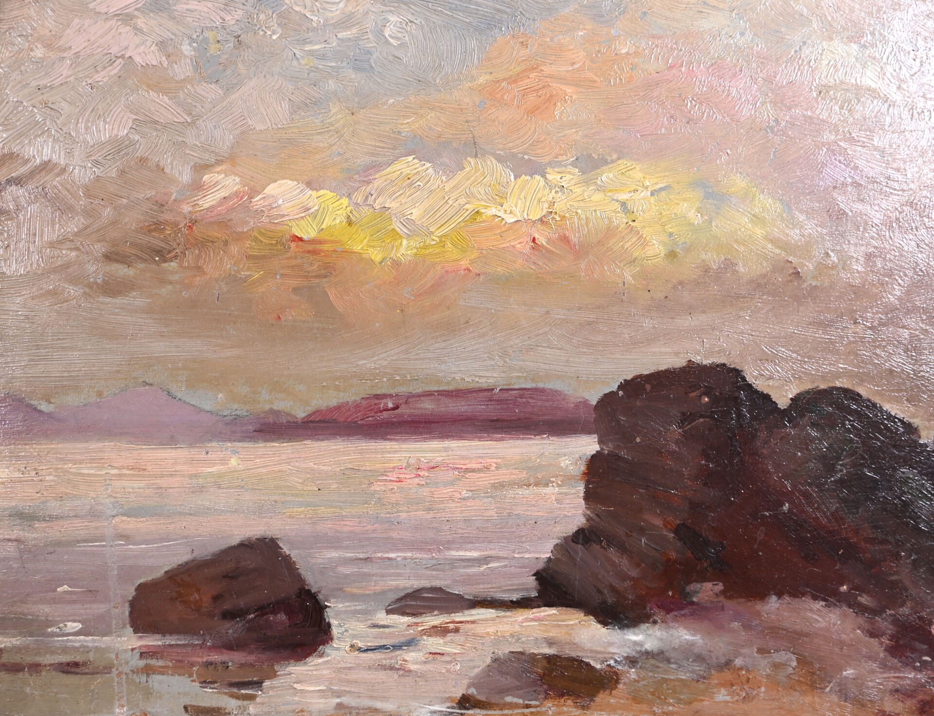 Ecole de la fin du XIXe ou du début du XXe siècle. Rochers sur la mer au couchant; Huile sur carton. 18,5 x 24 cm.
