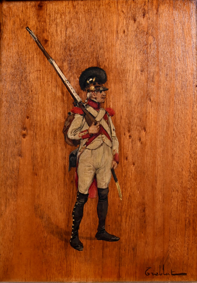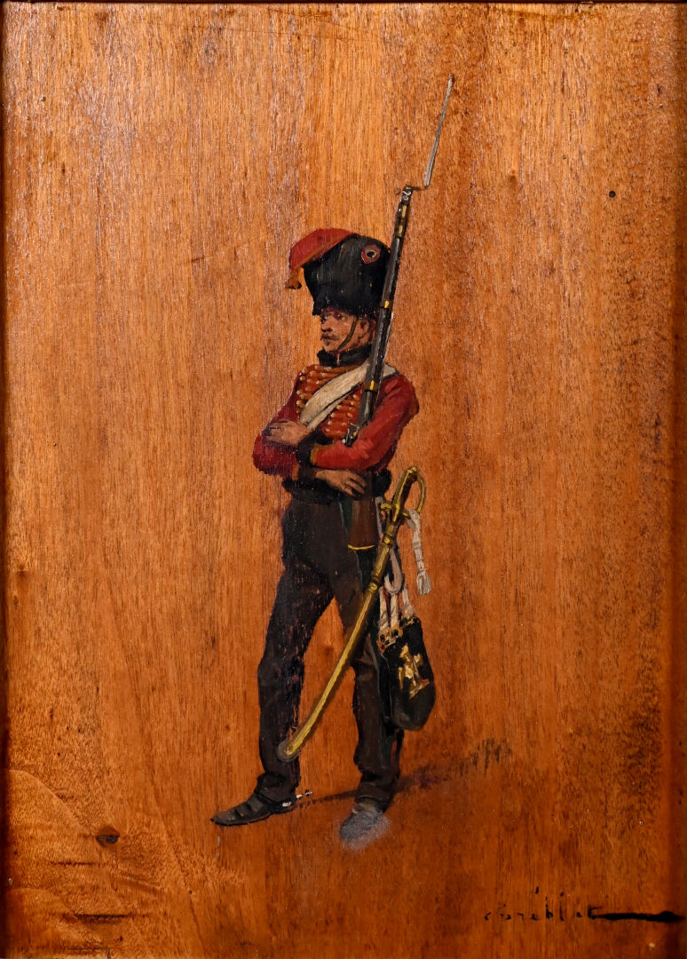 Ecole de la fin du XIXe ouu du début du XXe siècle. Militaires en tenue. Deux huiles sur panneau signées en bas à droite un légèrement gondolé. 22 x 15,5 cm.