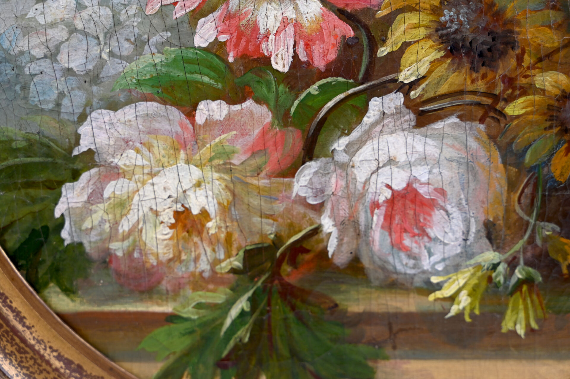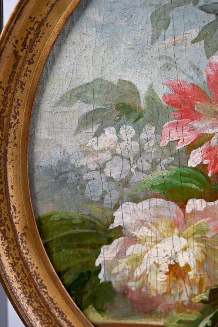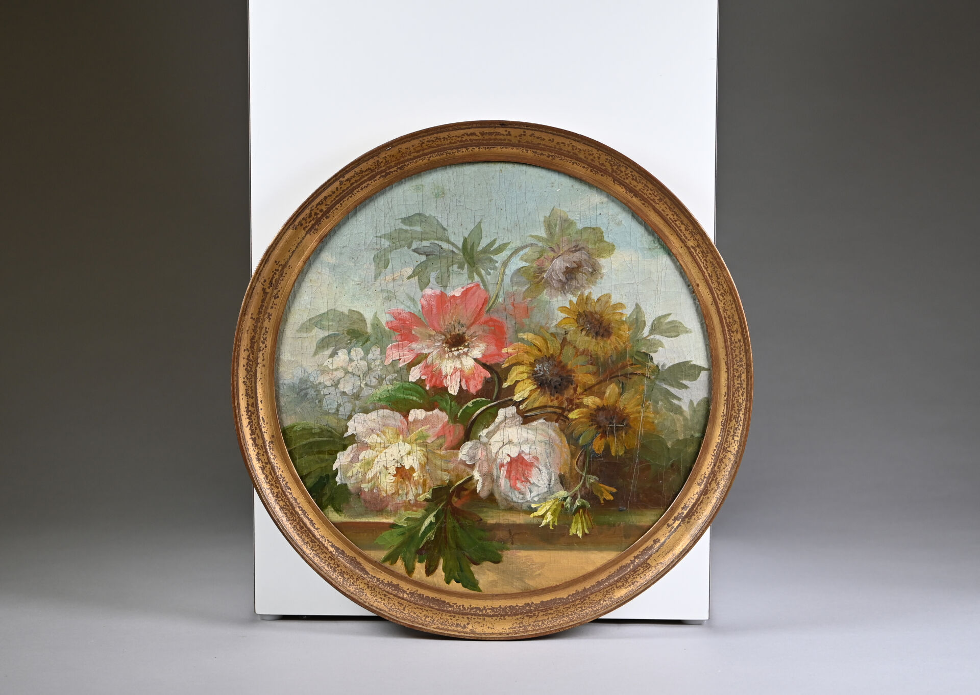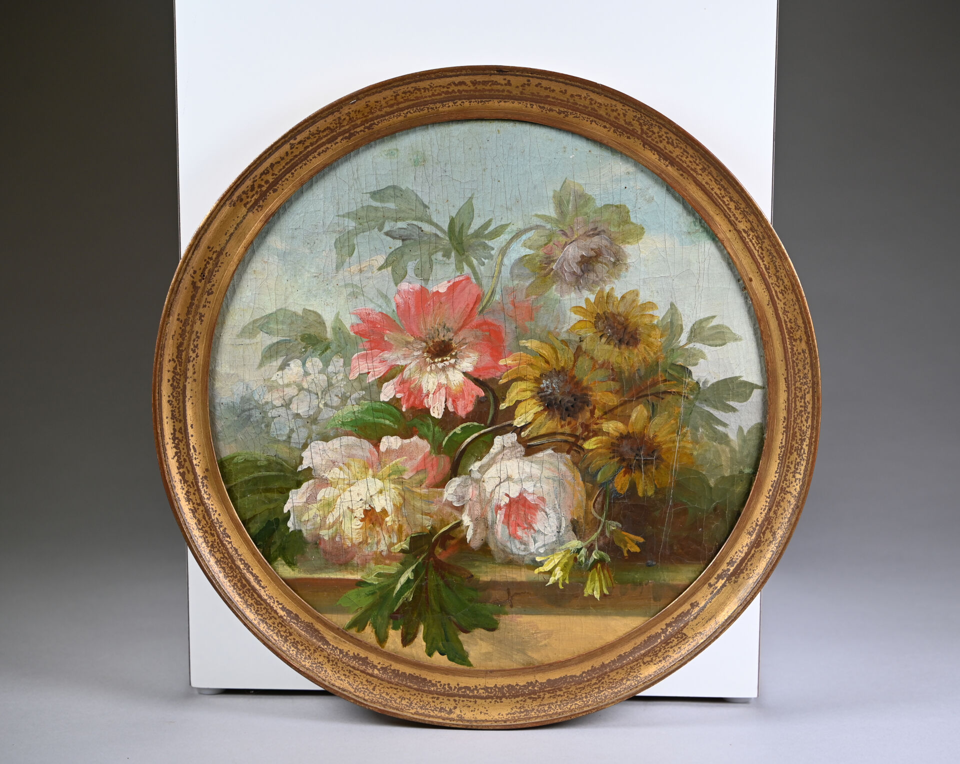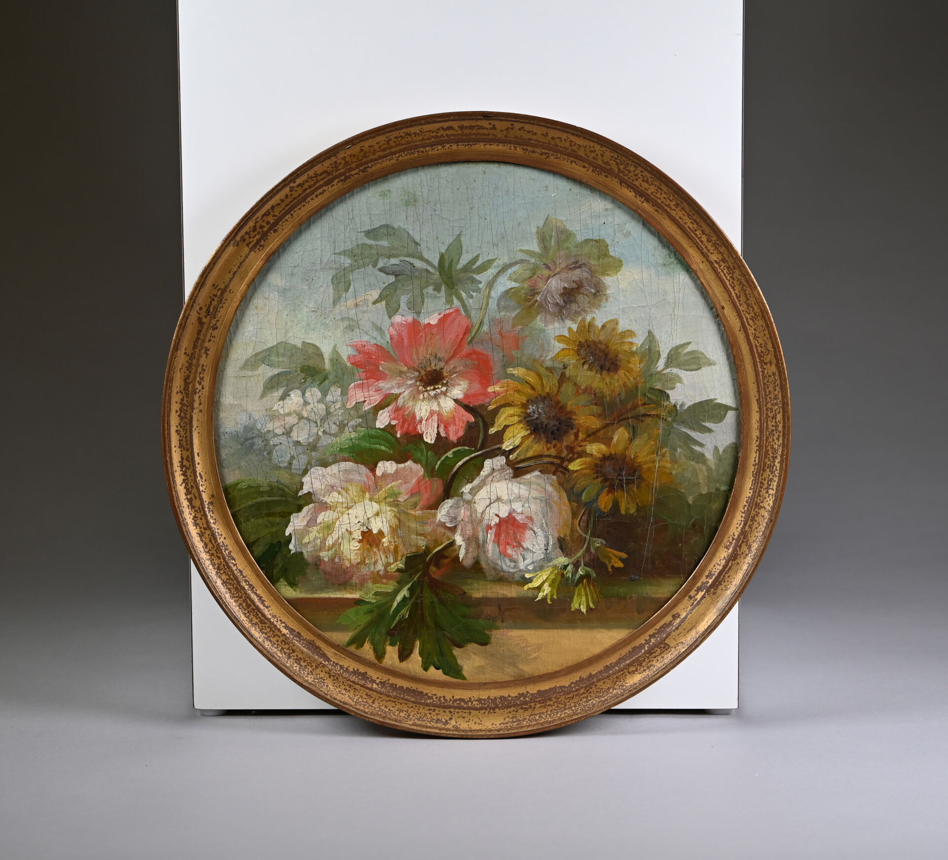 École de la fin du XIXe siècle ou du début du XXème siècle. Vers 1900. Bouquet de fleurs. Huile sur panneau à vue circulaire. Diam. : 32,5 cm.