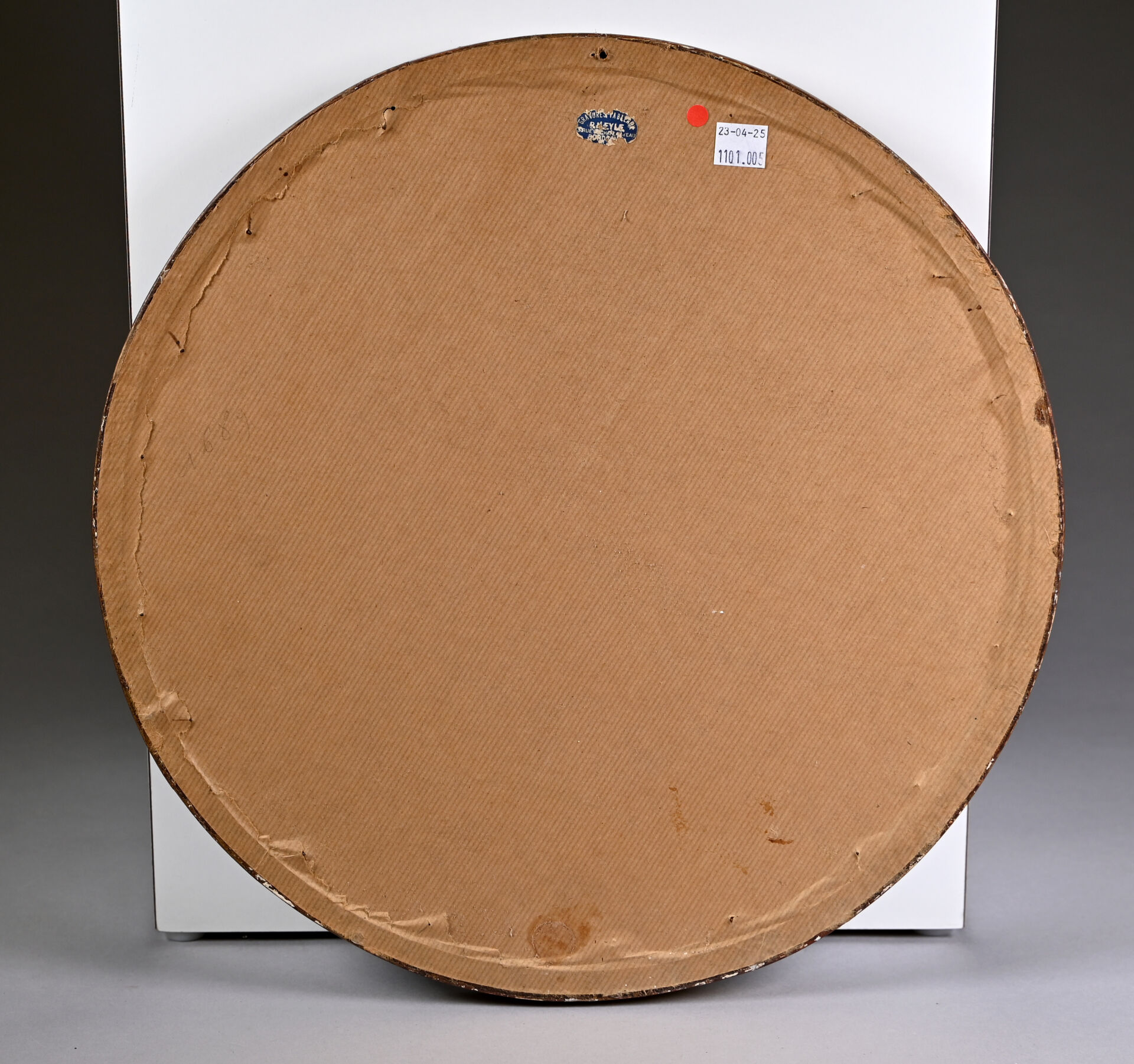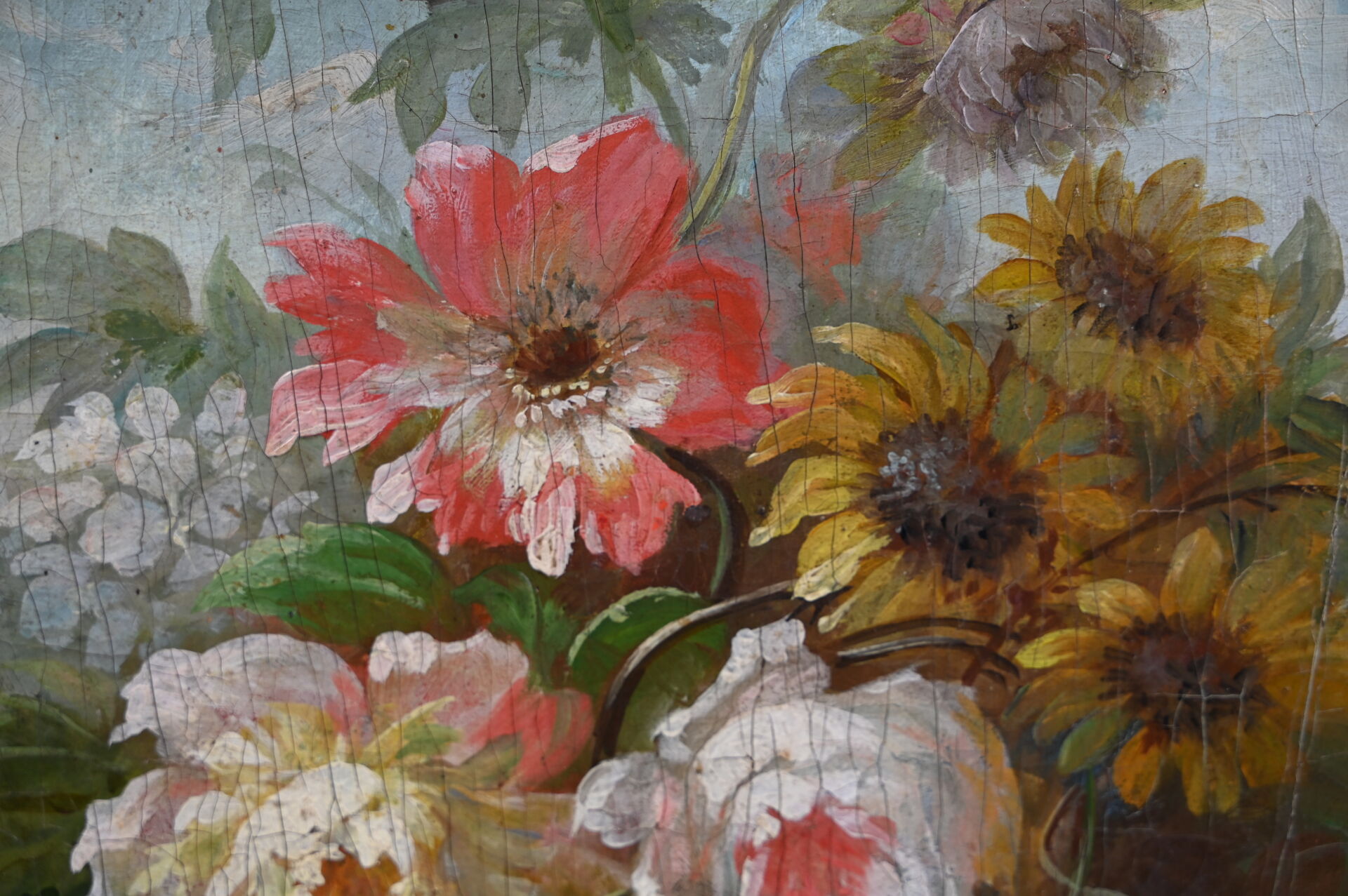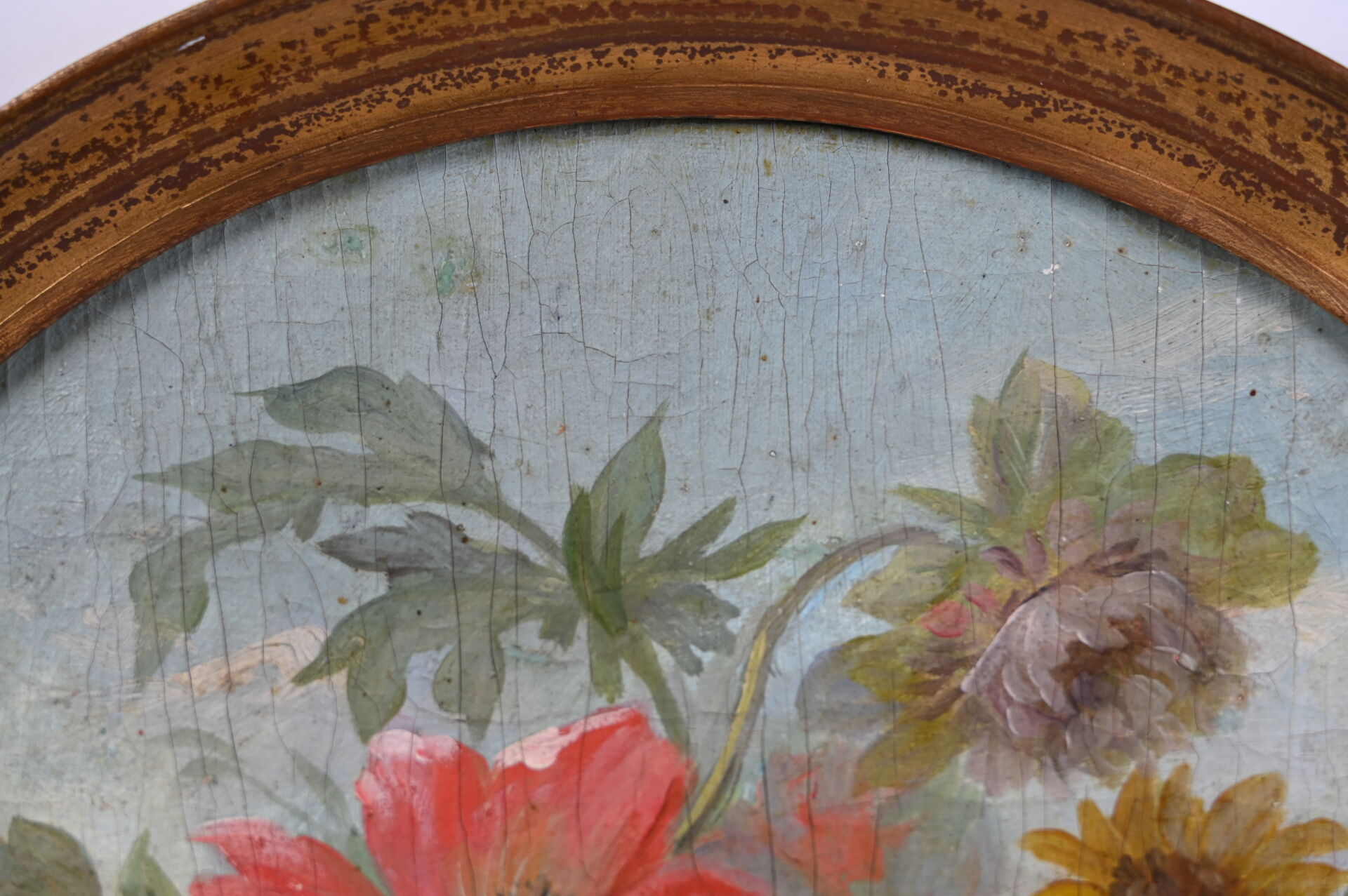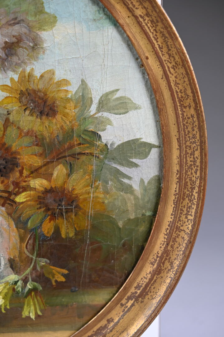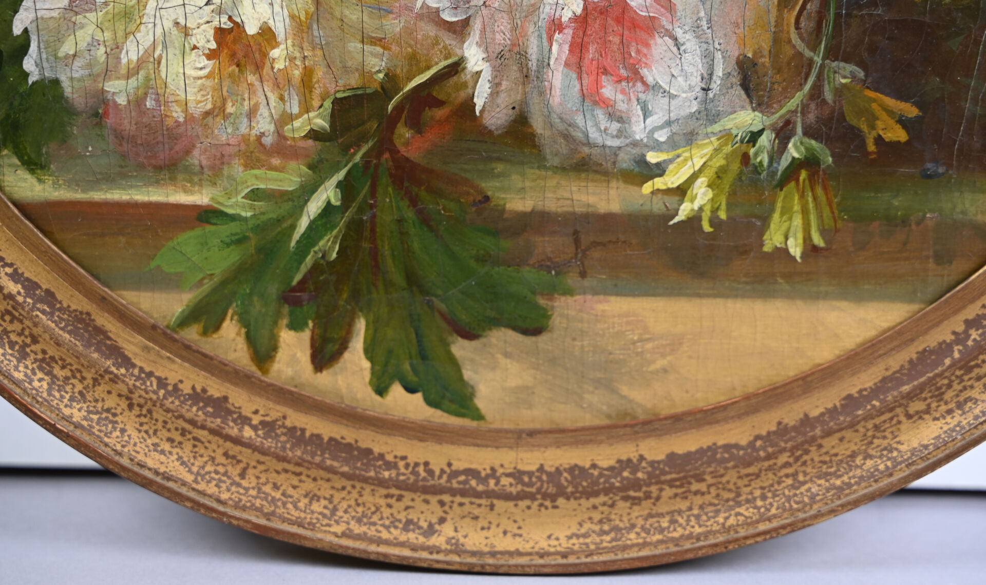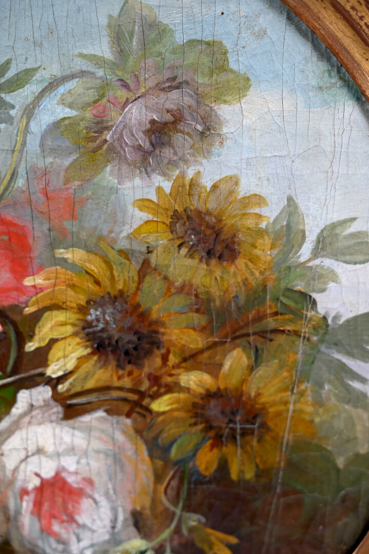 École de la fin du XIXe siècle ou du début du XXème siècle. Vers 1900. Bouquet de fleurs. Huile sur panneau à vue circulaire. Diam. : 32,5 cm.