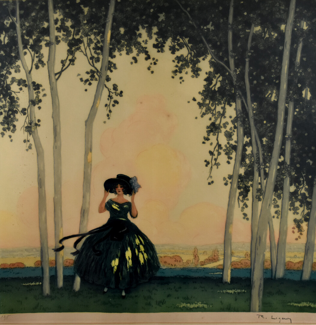Ecole du début du XXe siècle. Femme sous les arbres. Aquathinte par la société les Graveurs modernes à Paris. SIgnée en bas à droite et numérotée 138 en bas à gauche (papier légèrement gondolé). 50 x 49,5 cm (à vue).