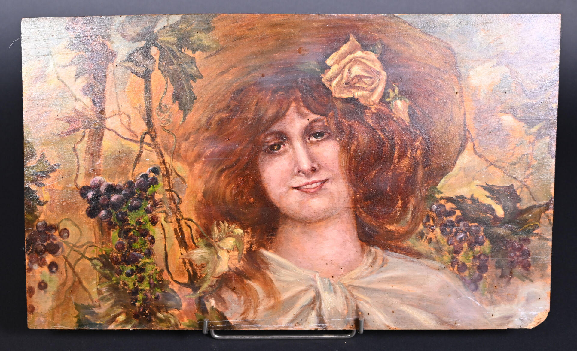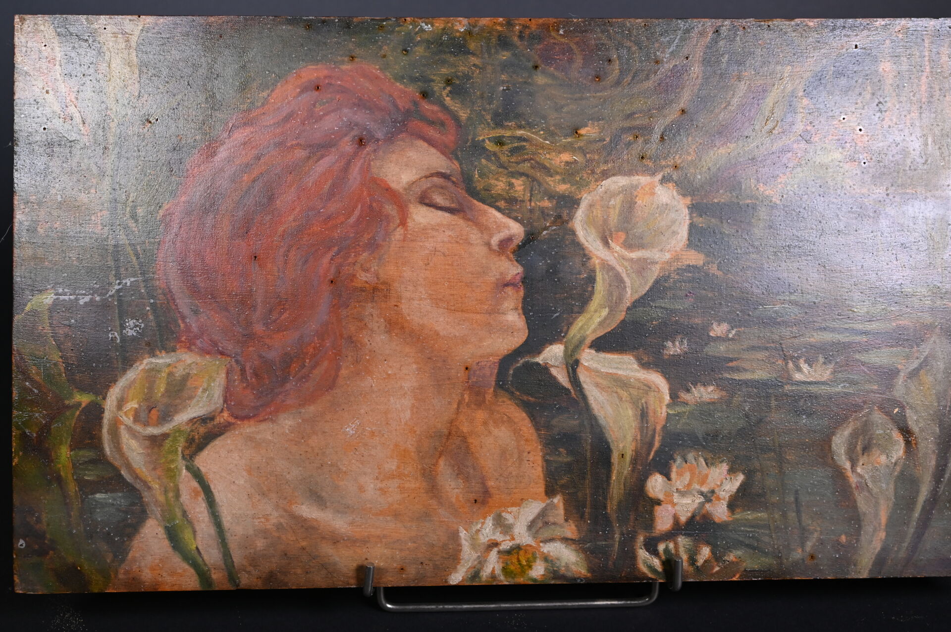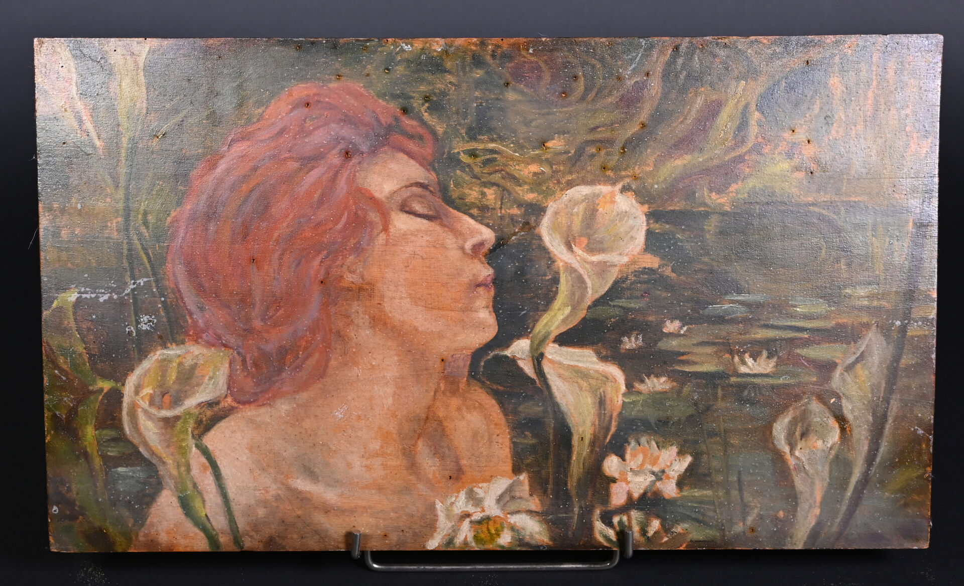 Ecole du début du XXe siècle. Femmes aux fleurs. Deux huiles sur panneau (traces d’insectes xylophages). 32 x 53,5 cm et 30 x 51,5 cm.