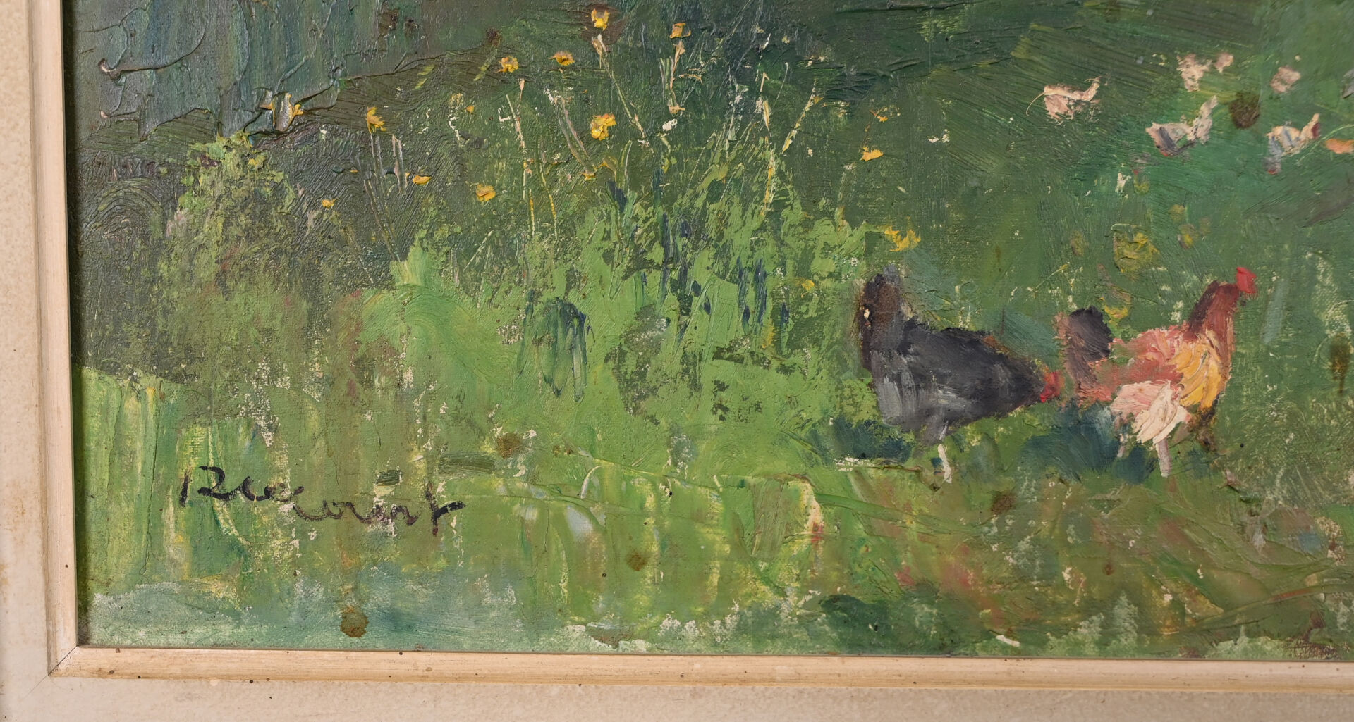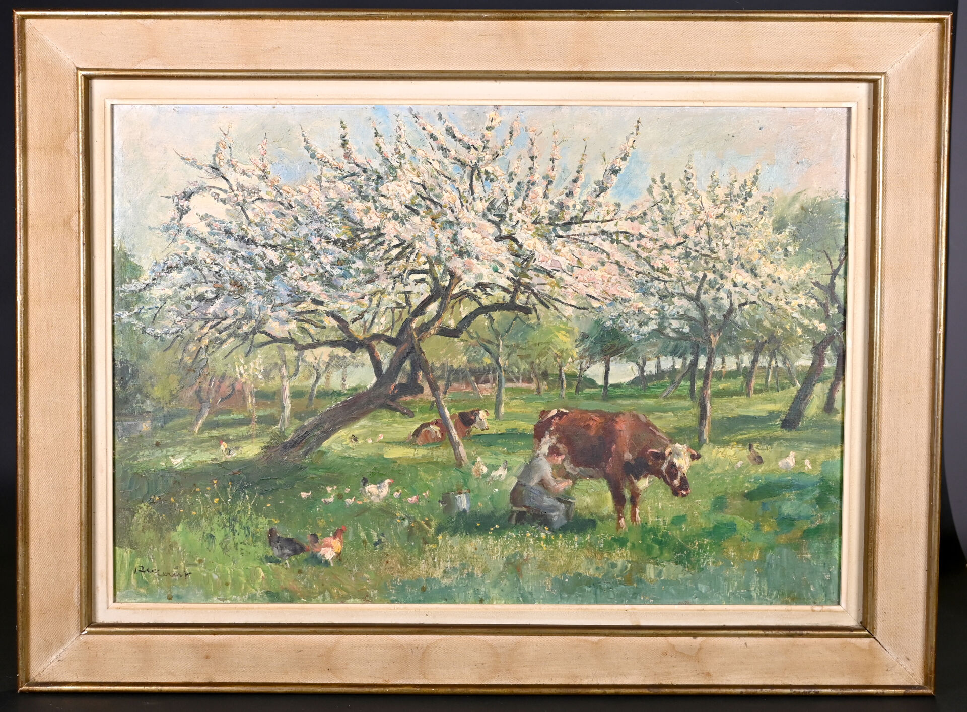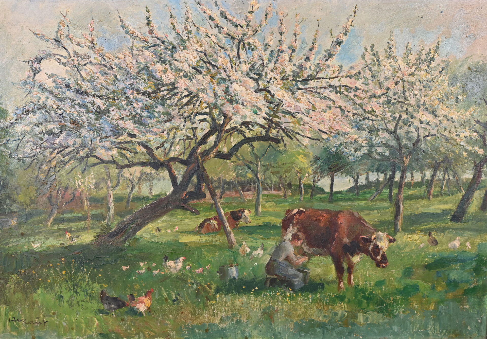 Ecole du début du XXe siècle. La traite dans le verger en fleurs. Huile sur toile marouflée sur panneau, signée en bas à gauche. 50 x 73,5 cm.
