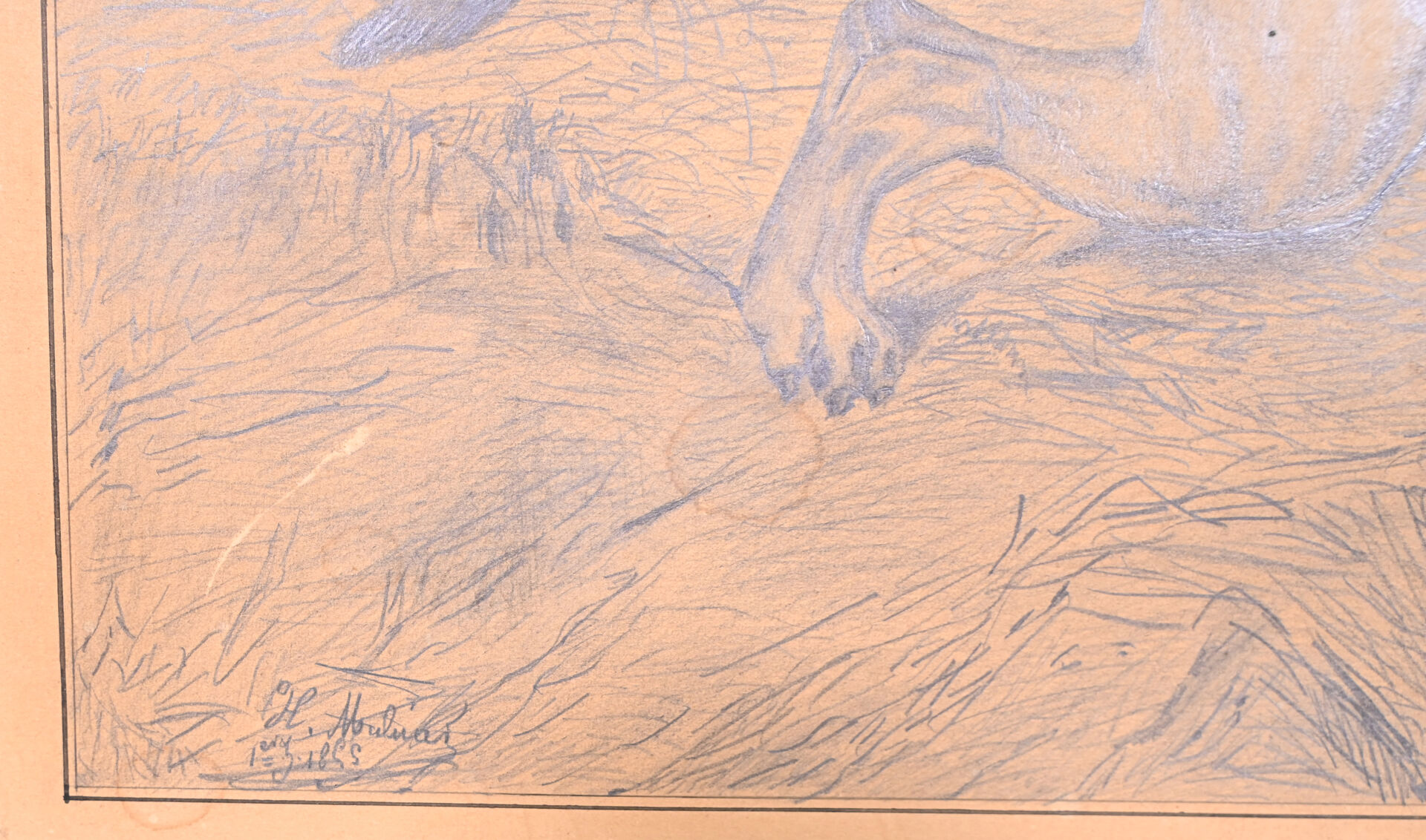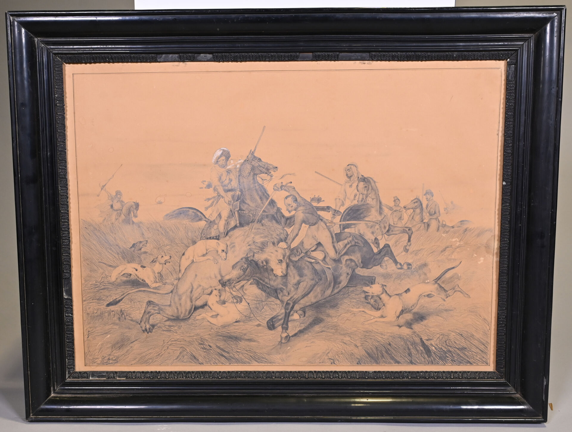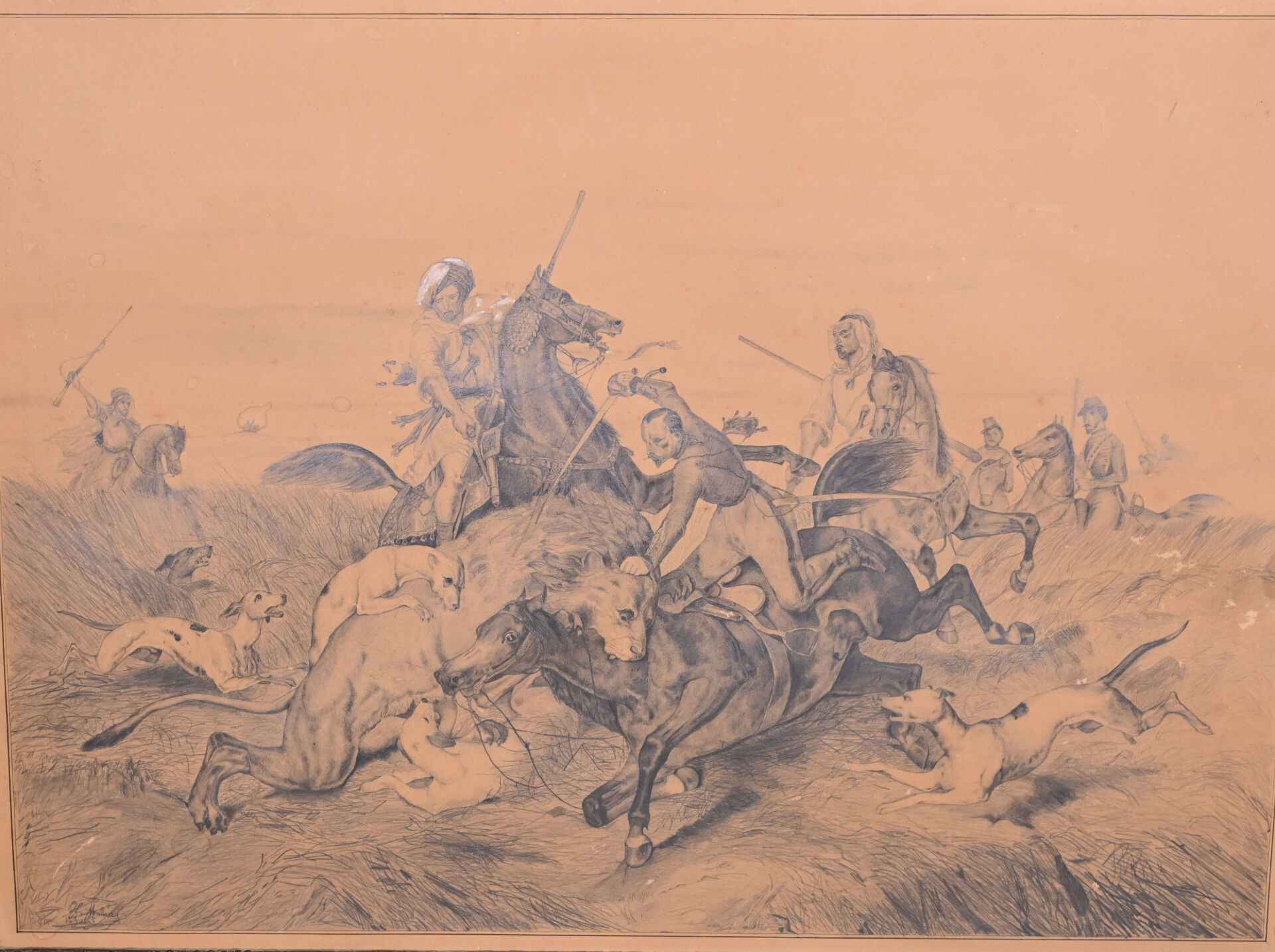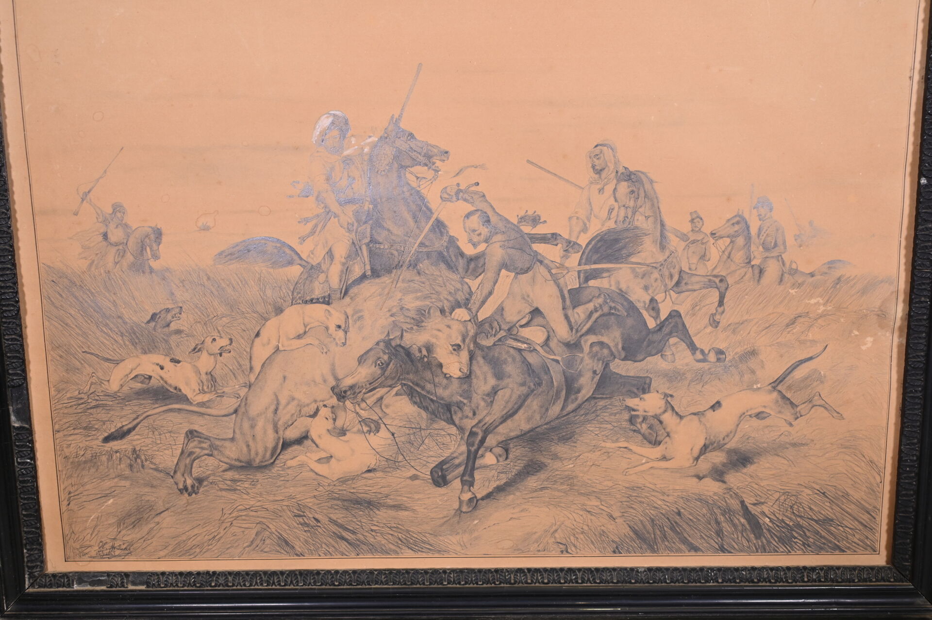 Ecole du XIXe siècle. Chasse au lion par L’empereur Napoléon III. Dessins au crayon et rehauts de craie, signé et daté 1855 en bas à gauche. 45 x 62,5 cm.