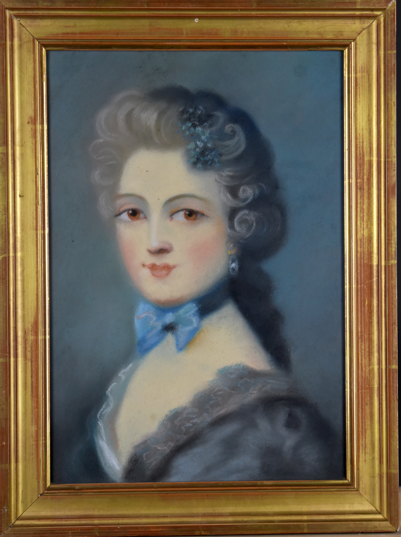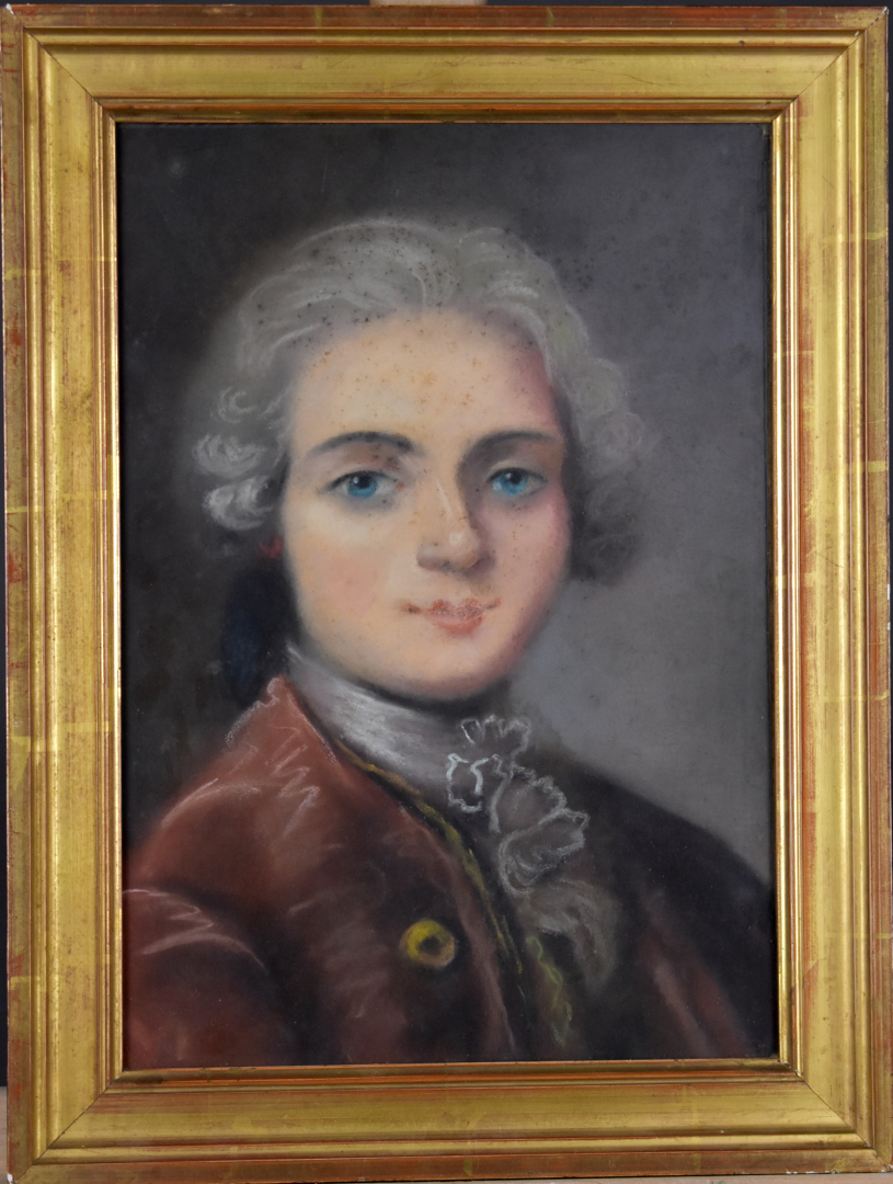 École du XIXe siècle dans le goût du XVIIIe siècle. Couple d’élégants. Deux dessins au pastel formant pendant (piqûres). 33,5 x 23 cm à vue.