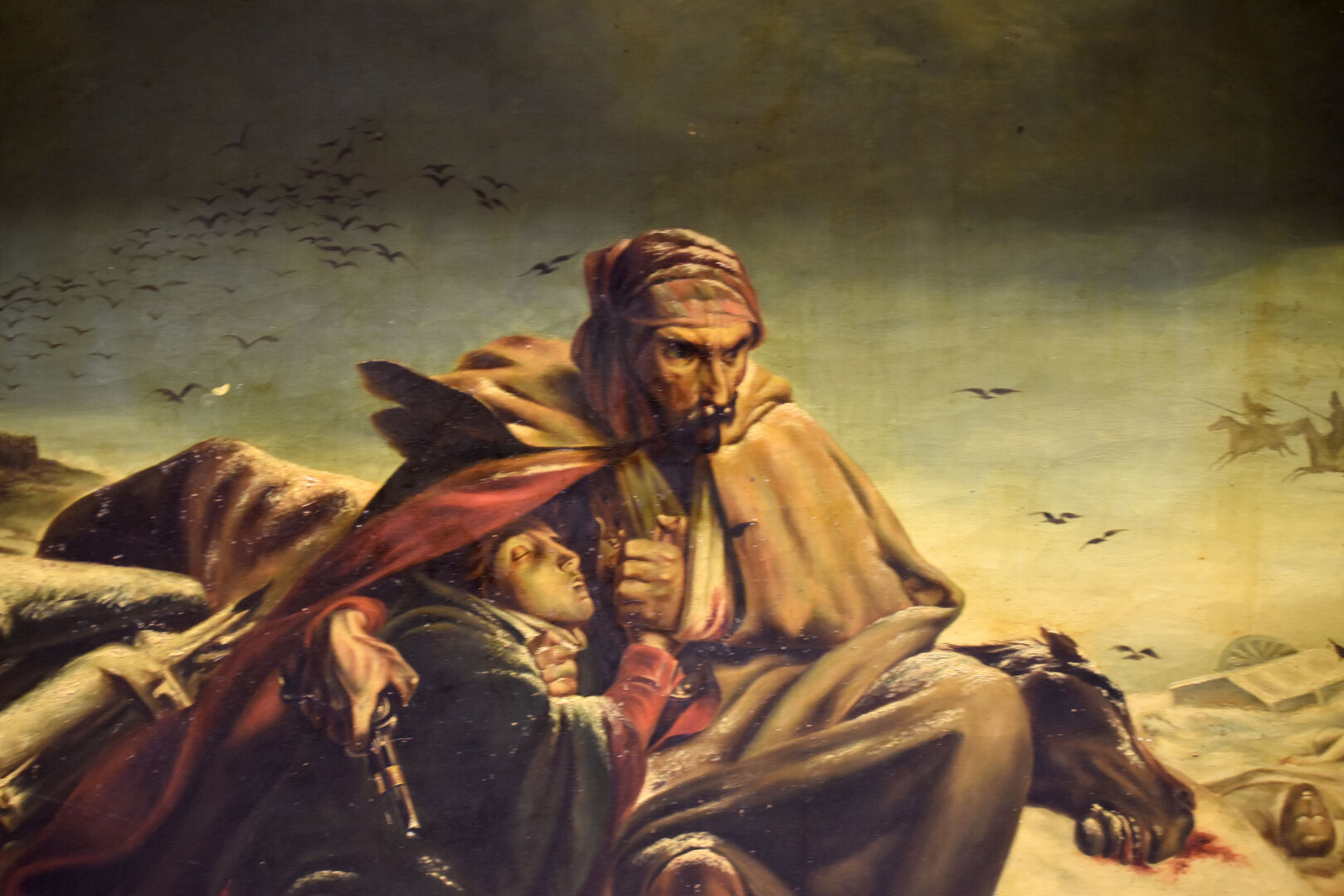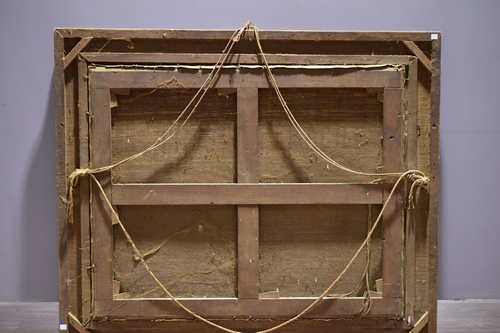 École du XIXe siècle d’après Henri-Félix-Emmanuel PHILIPPOTEAUX (1815-1884), Scène de champs de bataille sous la neige. Huile sur toile signée et datée 1887 en bas à droite. 80 x 100 cm. Cadre de bois stuqué doré (manques).