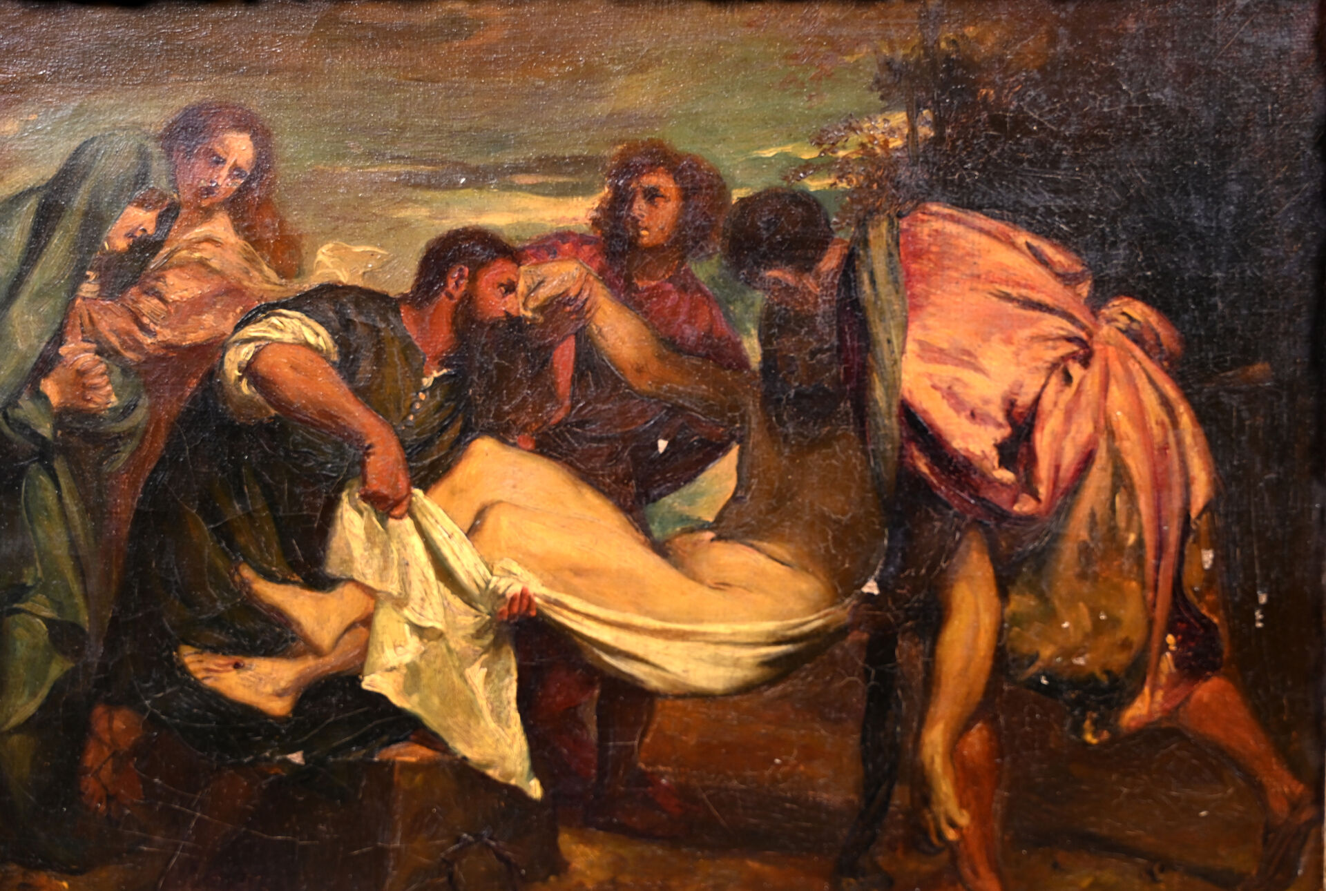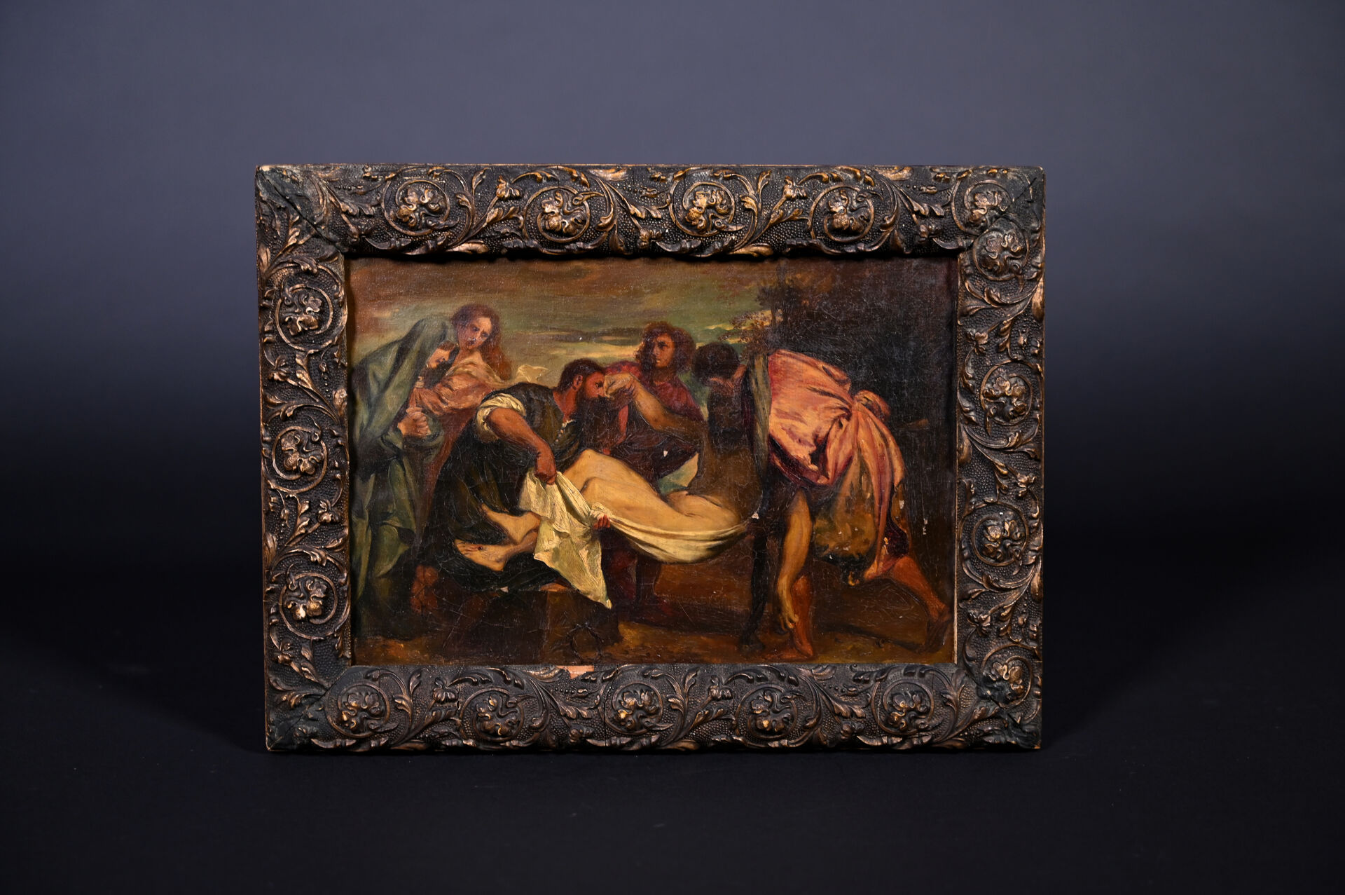 Ecole du XIXe siècle d’après Titien. La mise au tombeau. Huile sur toile (éclats de peinture). 22 x 33 cm.
