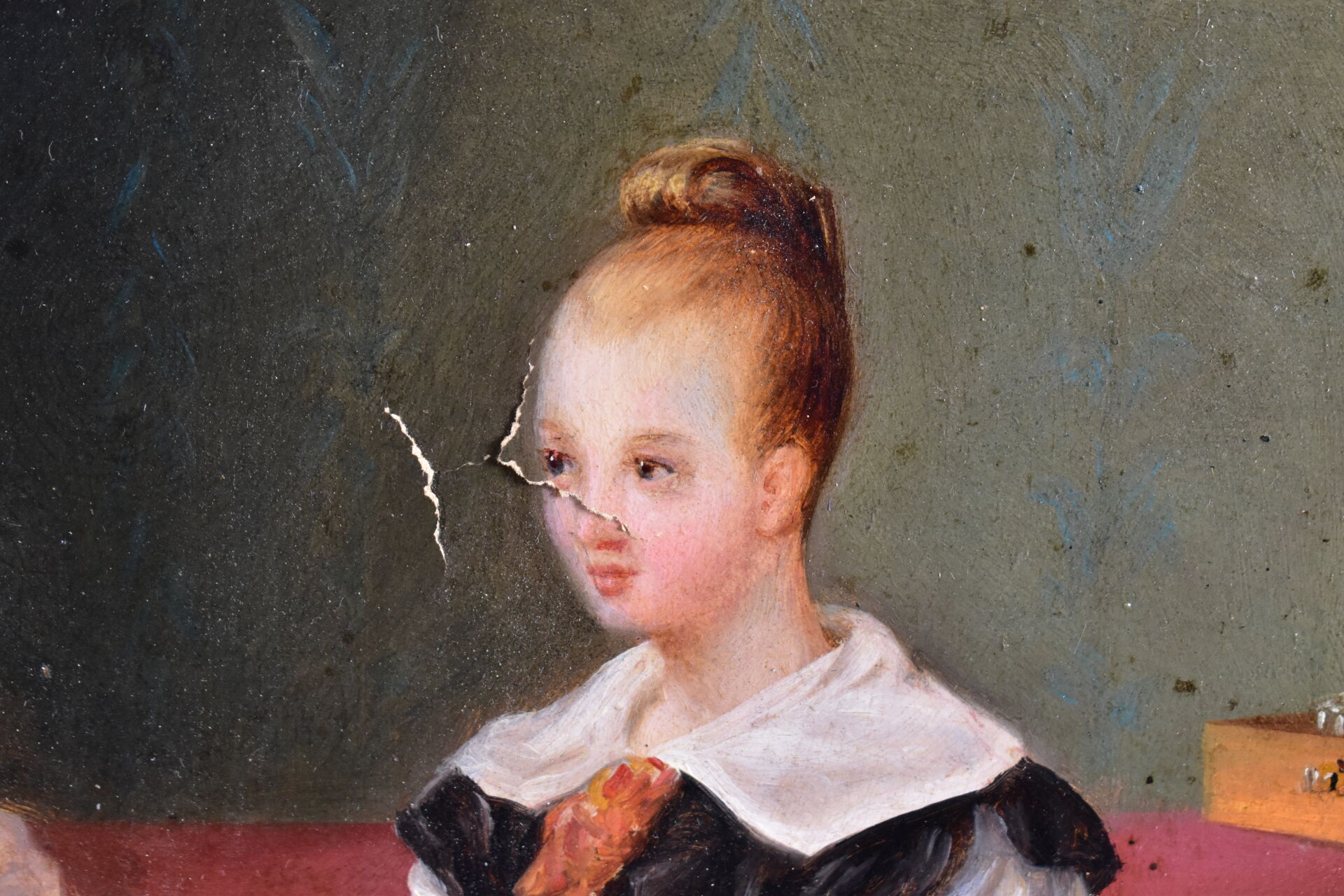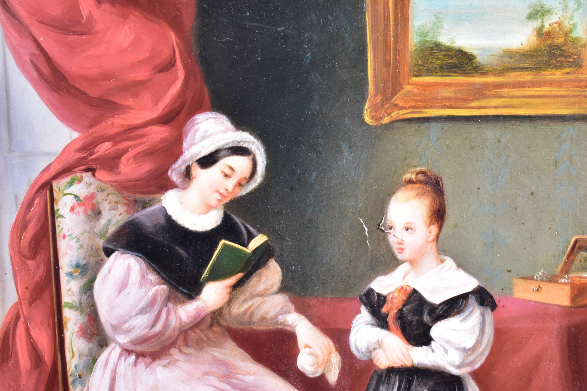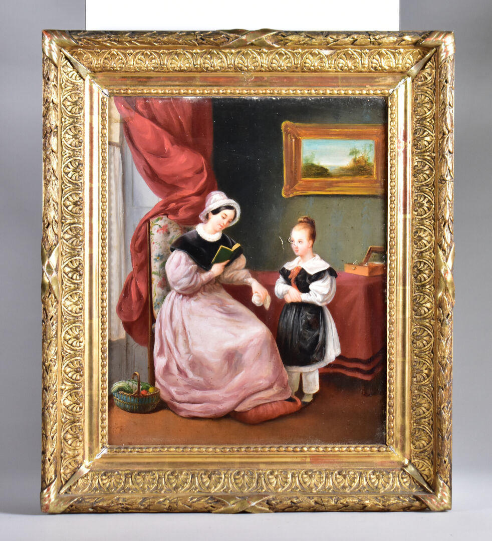 Ecole du XIXe siècle. La leçon. Huile sur toile (un enfoncement). 40 x 32 cm.
