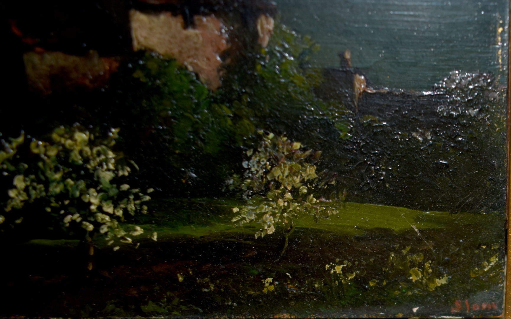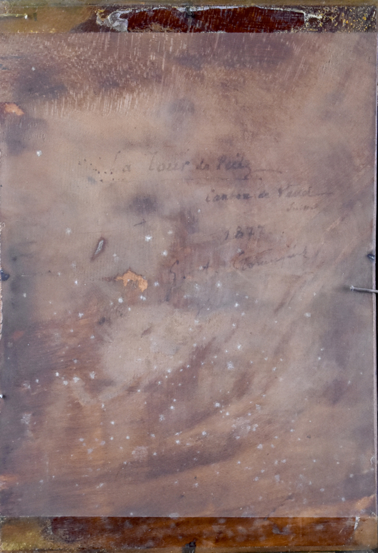 École du XIXe siècle. La tour de Pieda. Huile sur panneau portant une signature en bas à droite. Contre signée, située et datée 1877 au dos. 22,5 x 15,5 cm.