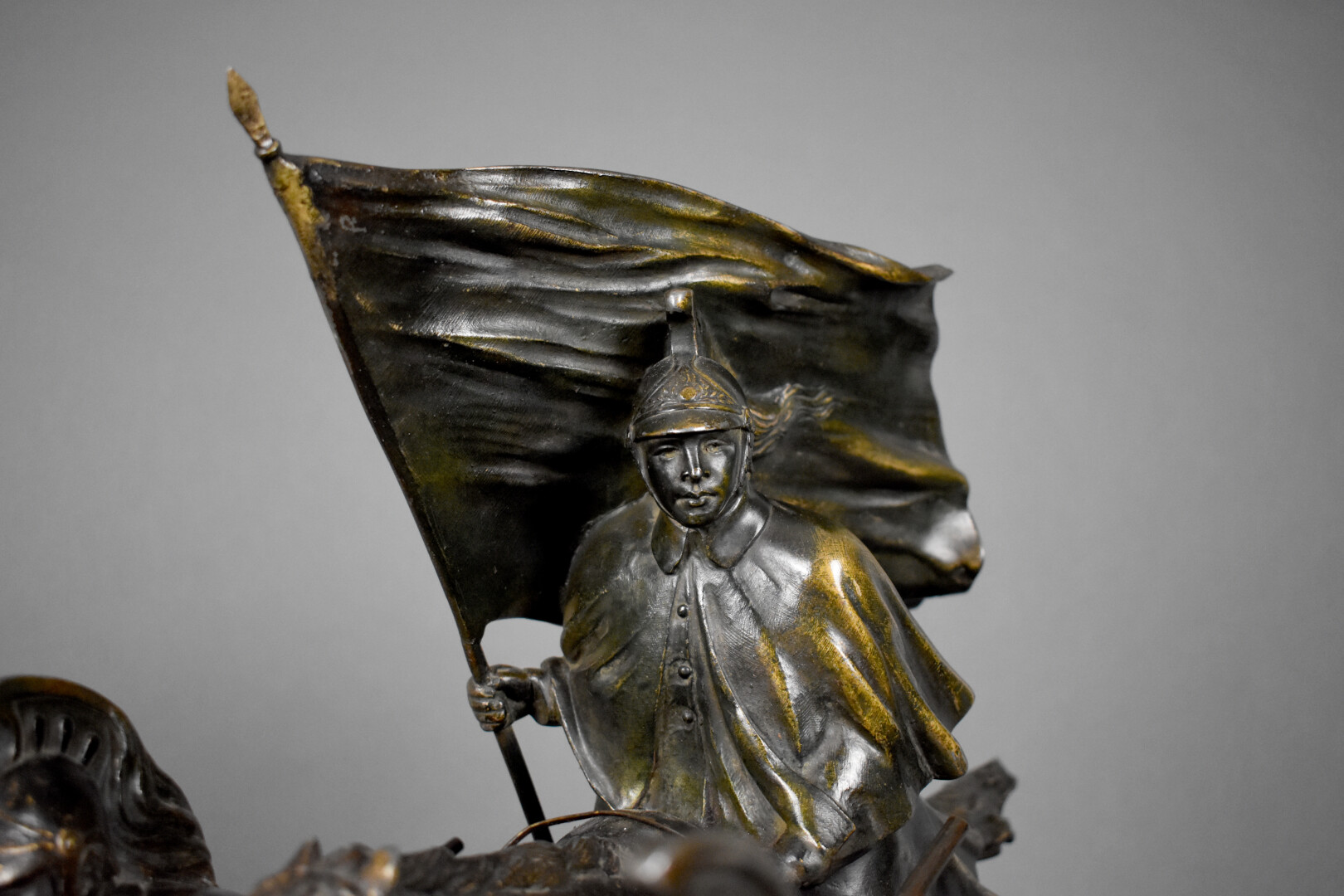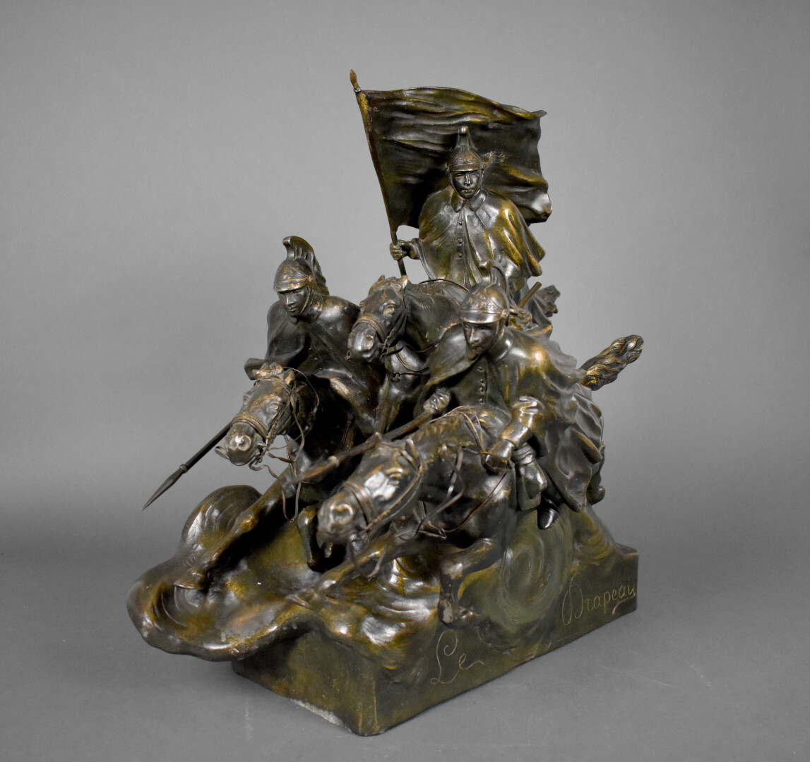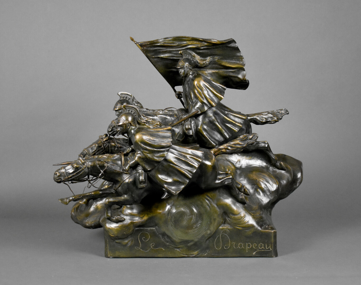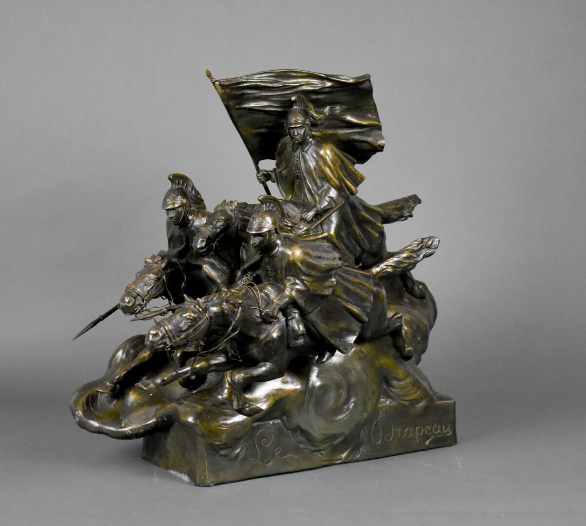 École du XIXe siècle. « Le drapeau ». Groupe en régule patiné brun et or (plein, très lourd). Titré et signé à la base. Haut. : 54,5 cm – Larg. : 64 cm – Prof. : 32 cm.