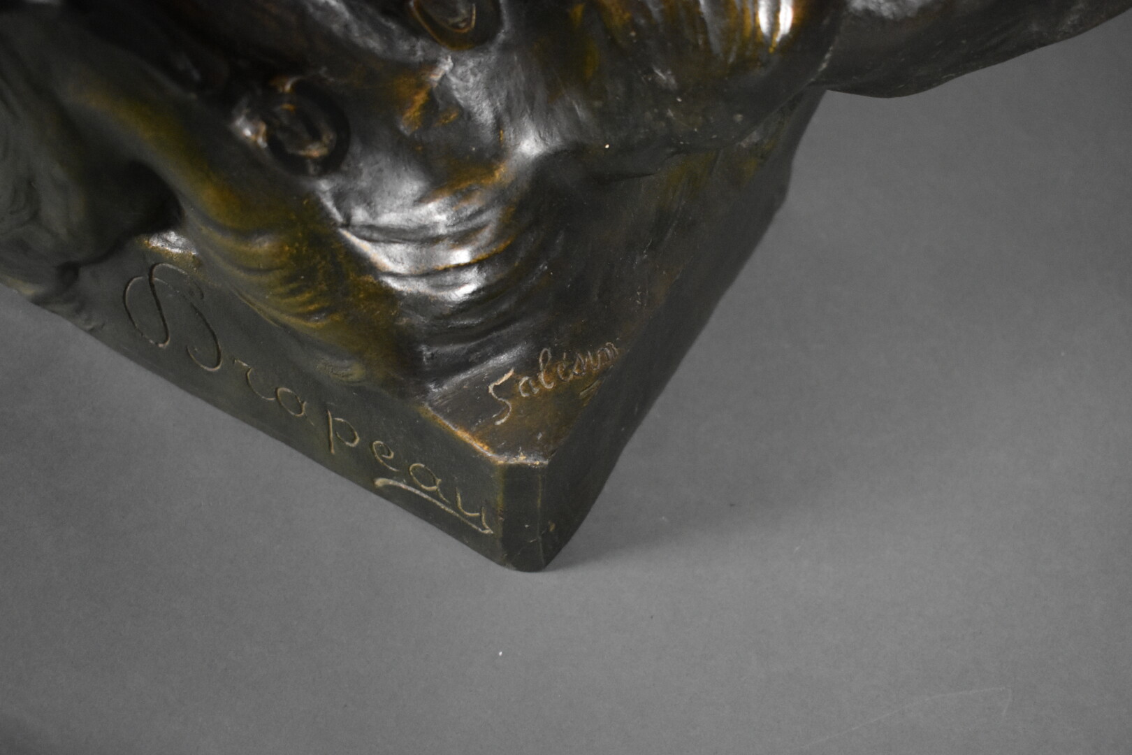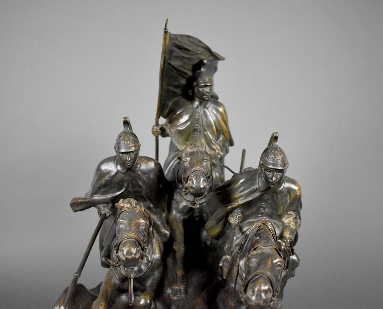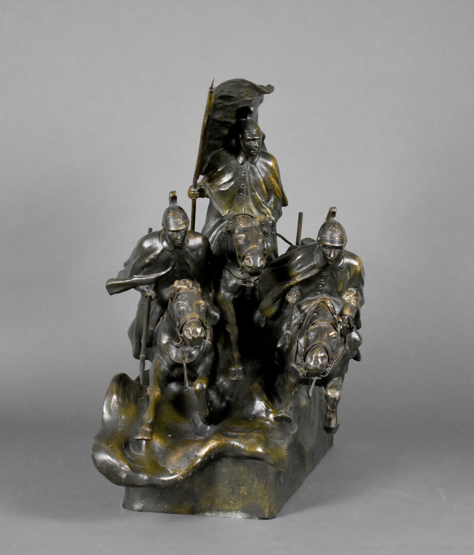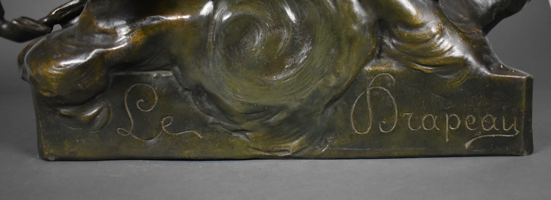 École du XIXe siècle. « Le drapeau ». Groupe en régule patiné brun et or (plein, très lourd). Titré et signé à la base. Haut. : 54,5 cm – Larg. : 64 cm – Prof. : 32 cm.