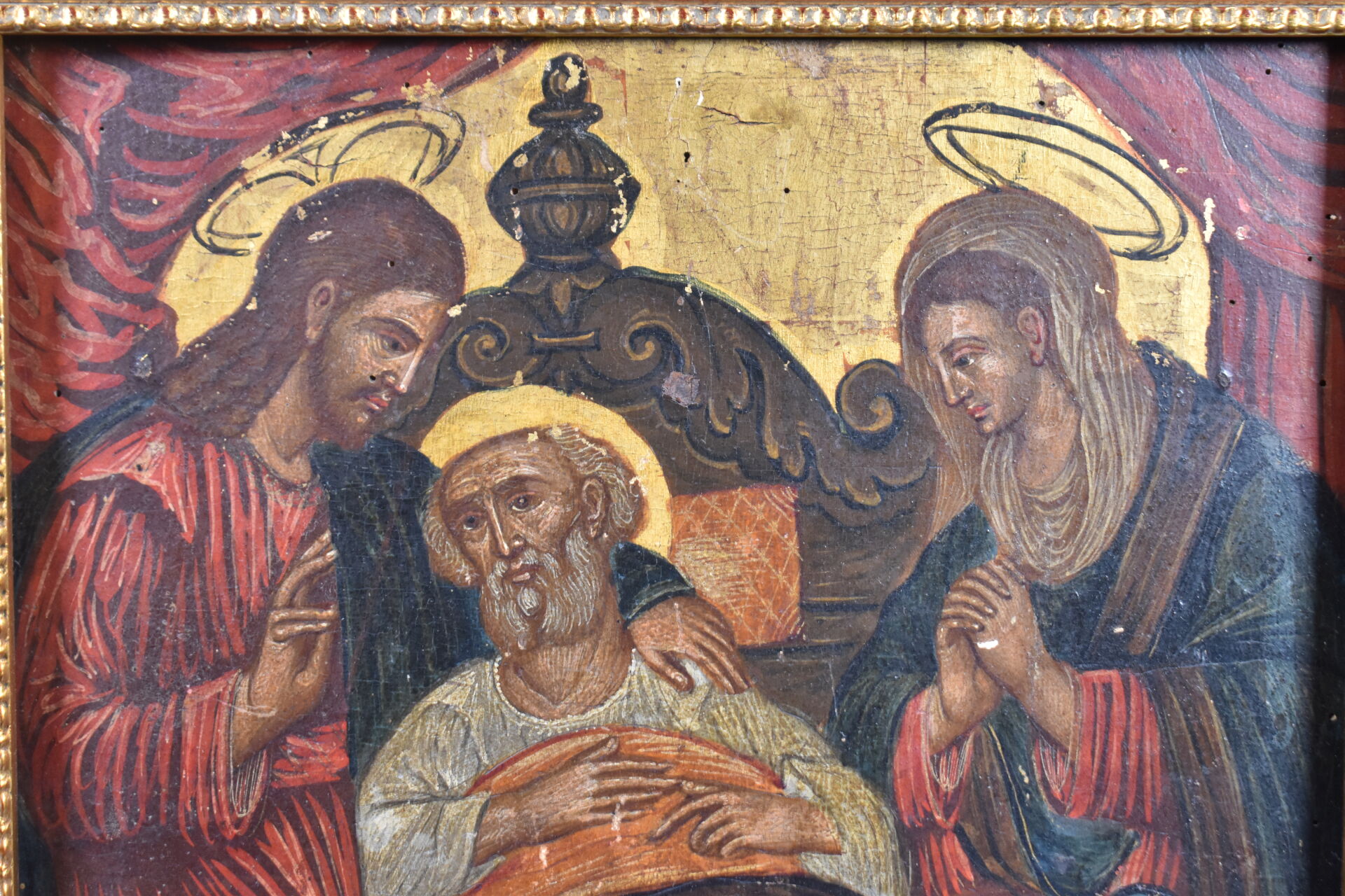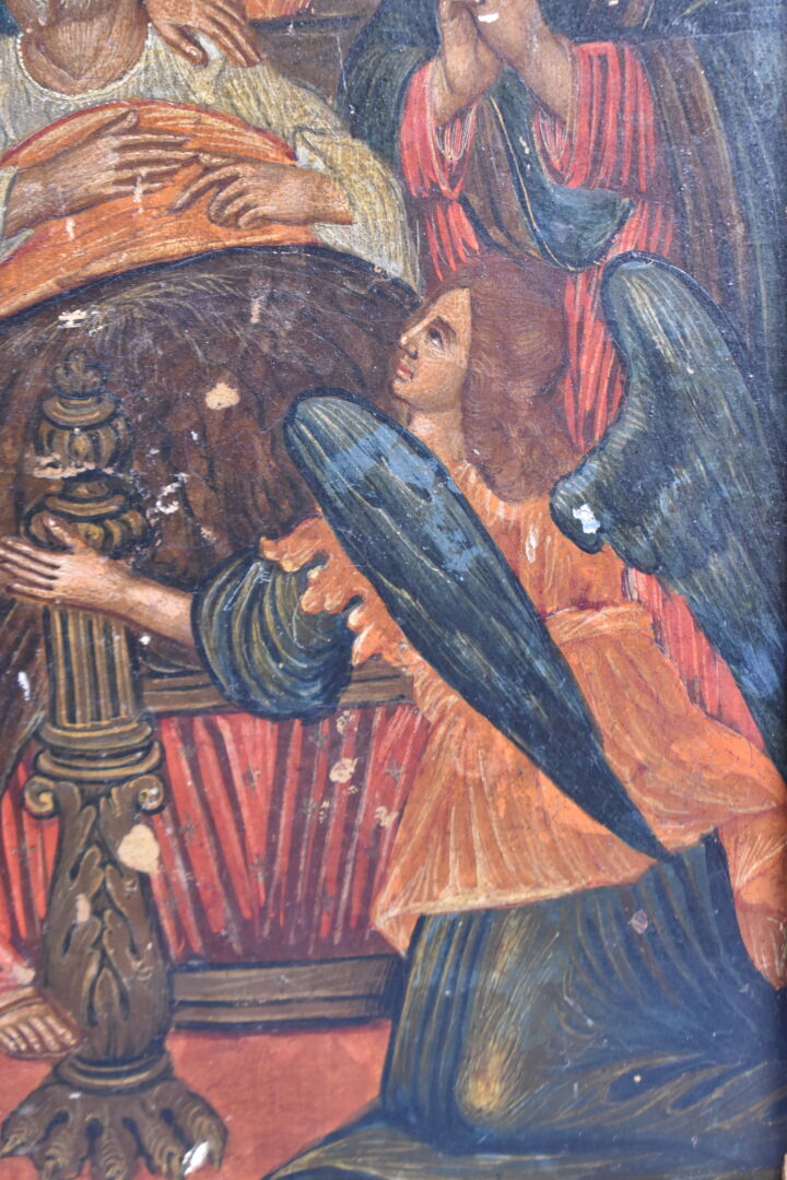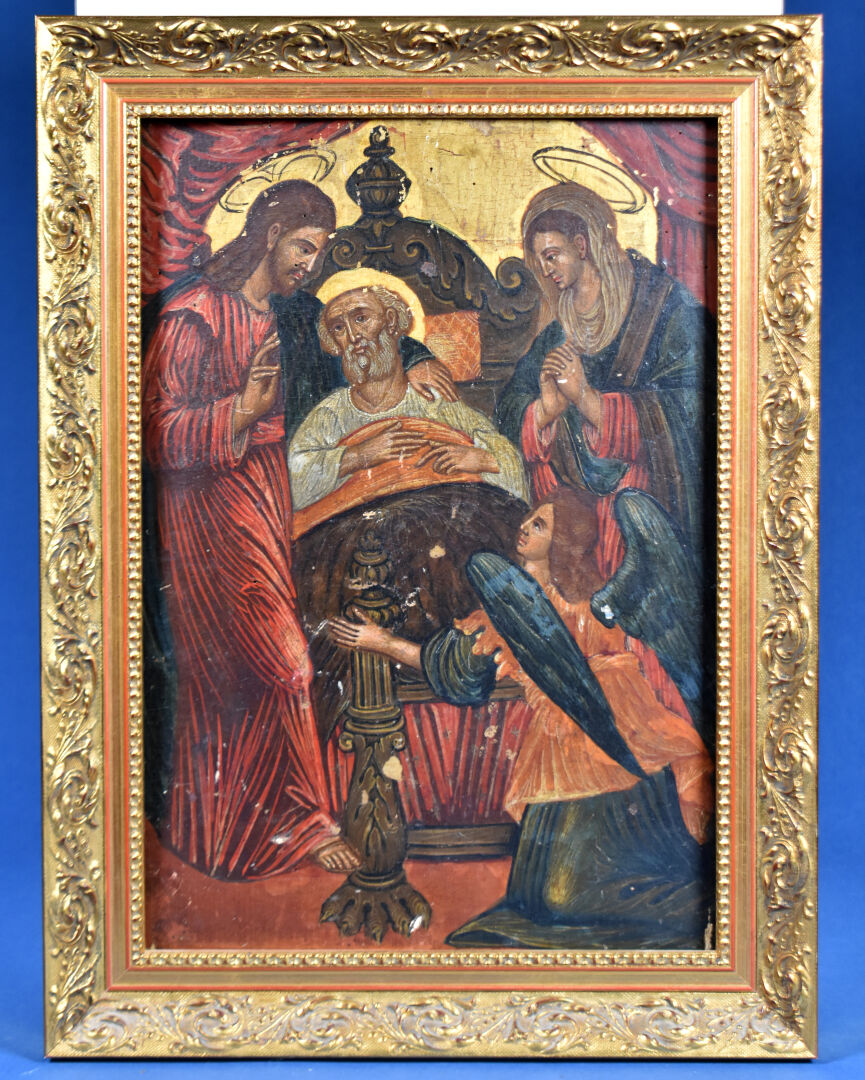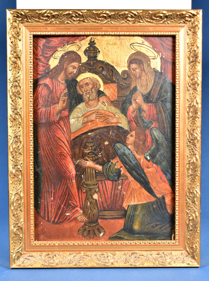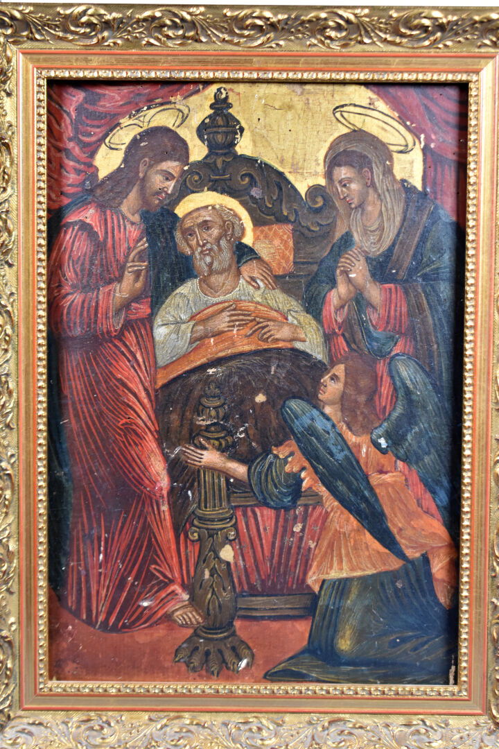 École du XIXème siècle, probablement Venise ou Europe de l’Est. La dormition de Saint Joseph. Tempera et or sur bois. 42,5 x 30 cm.