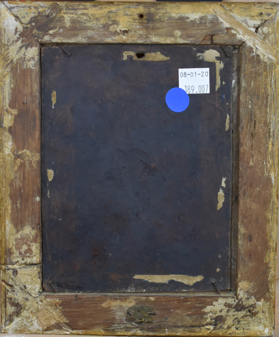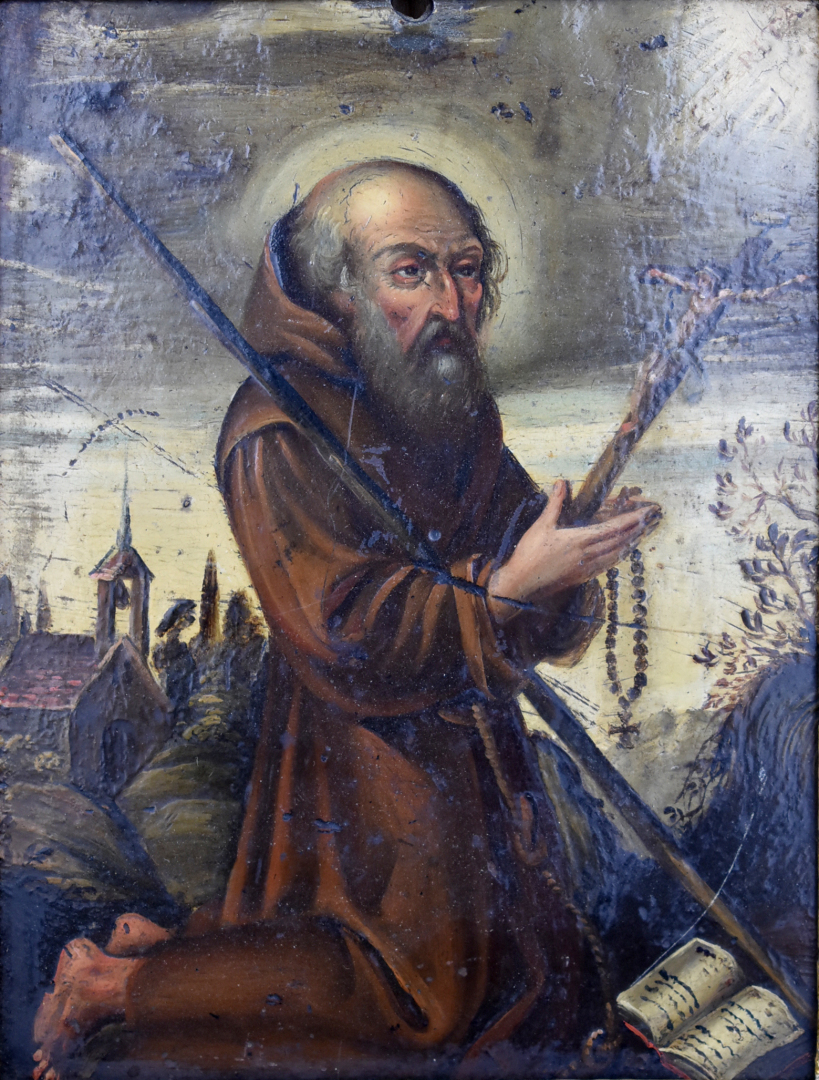 École du XVIIe siècle. Saint avec son bâton de pèlerin en prière. Huile sur cuivre (percée). 16,3 x 12,3 cm. Cadre en bois sculpté doré (un accident recollé) du XVIIIe siècle.