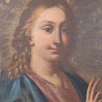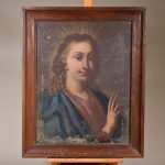 Ecole du XVIIIe siècle. Figure du Christ levant la main droite en signe de bénédiction. Huile sur toile (rentoilée, éclats et manques). 49 x 37,5 cm.