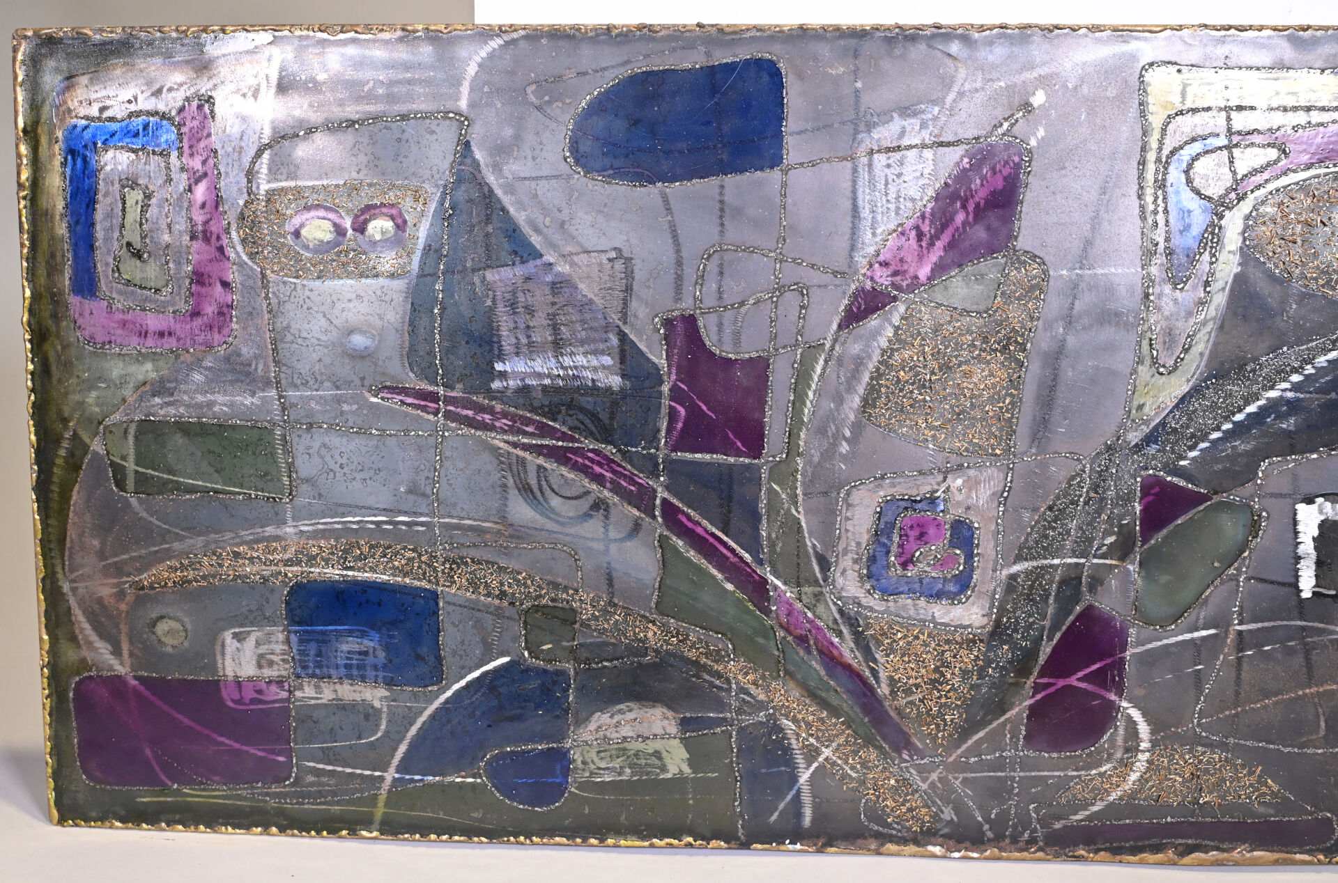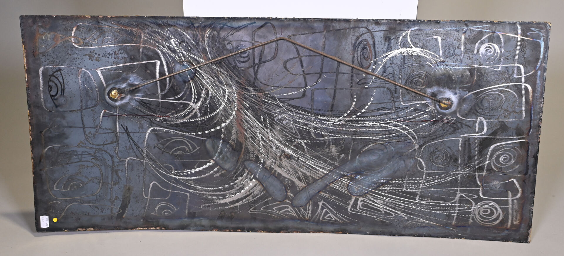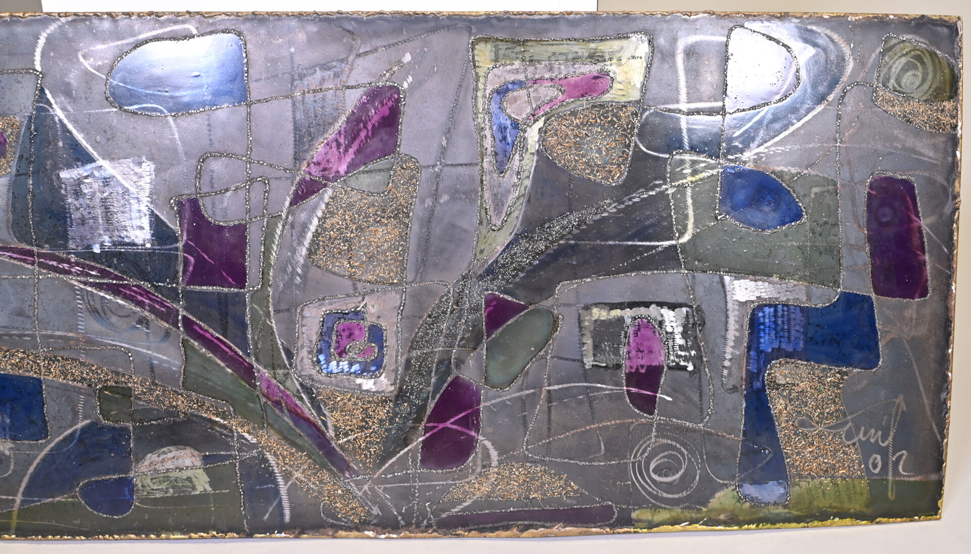 Ecole du XXe siècle. Composition abstraite. Technique mixte sur métal signée et datée 2002 en bas à droite. 44,5 x 102 cm.