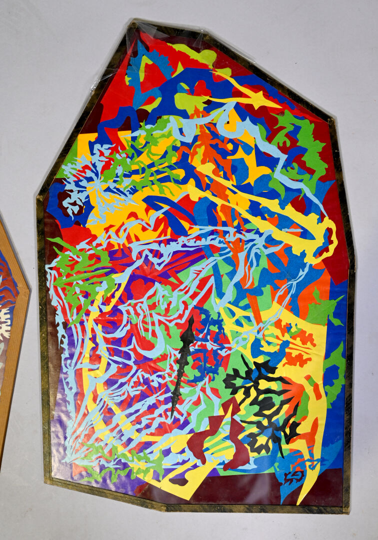 Ecole du XXe siècle. Compositions abstraites. Deux découpages/collage sous vitre, les deux bi-face. Dim. du plus grand : 61 x 38 cm.