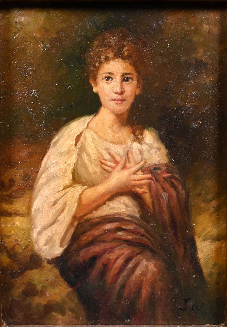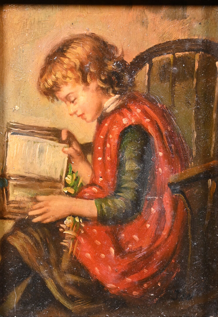 Ecole du XXe siècle. Jeune fille à l’antique et Jeune garçon à la lecture. Deux huiles sur panneau signées J.L. 16,5 x 11,5 cm à vue.