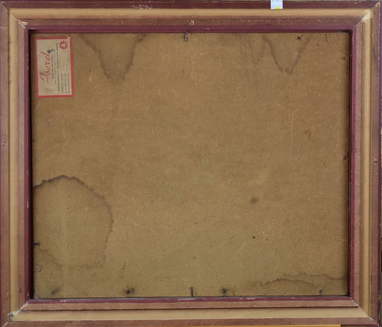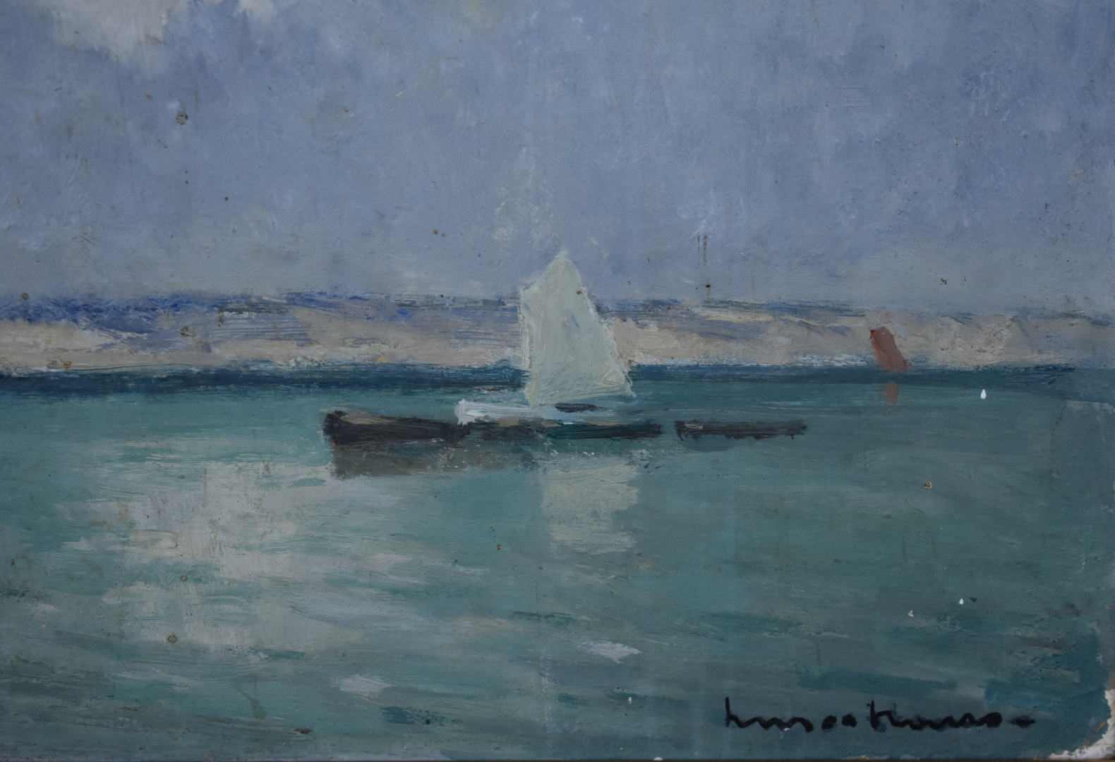 Ecole du XXe siècle. Marine par temps calme. Huile sur isorel signée en bas à droite. 46 x 54,5 cm.