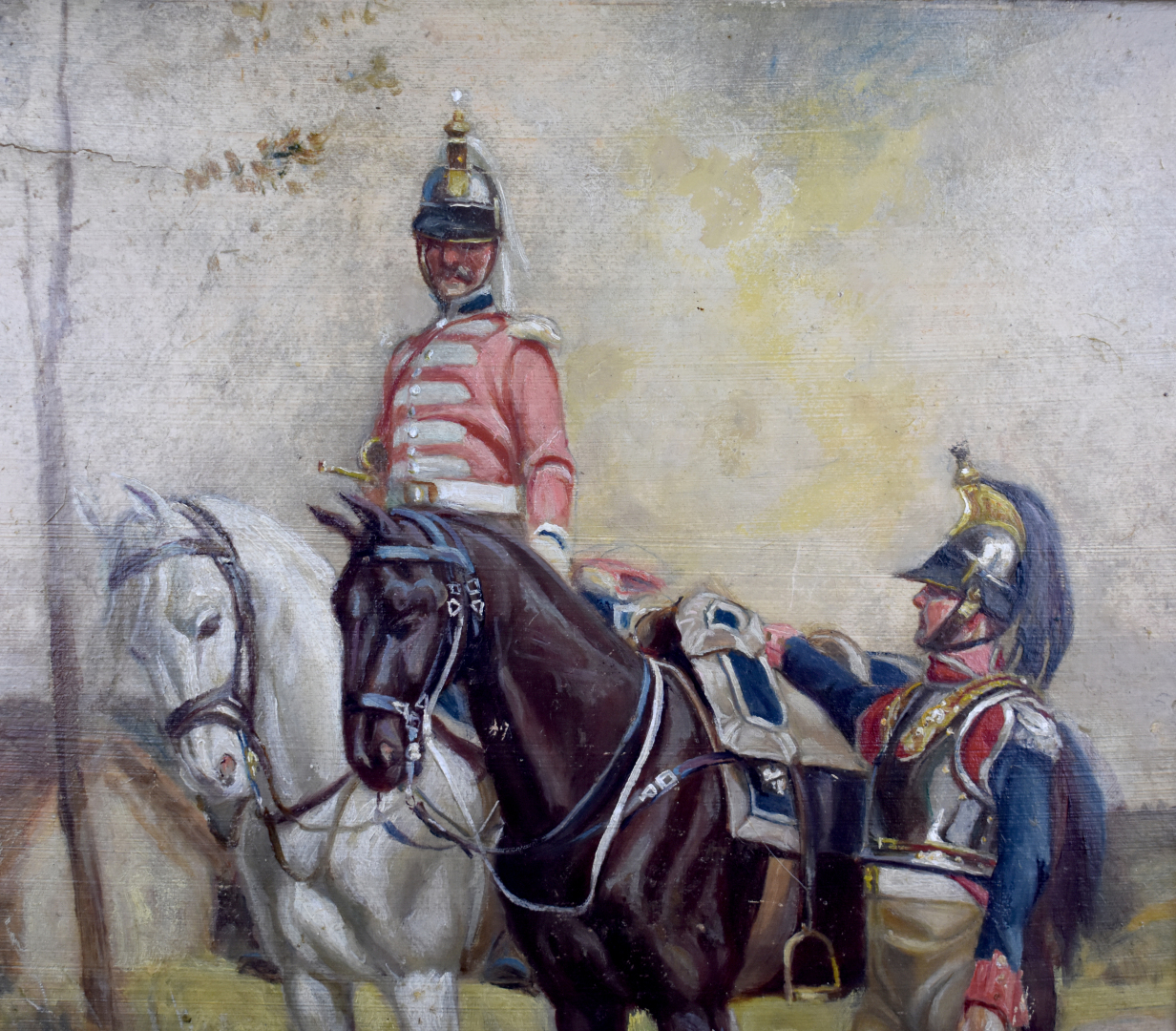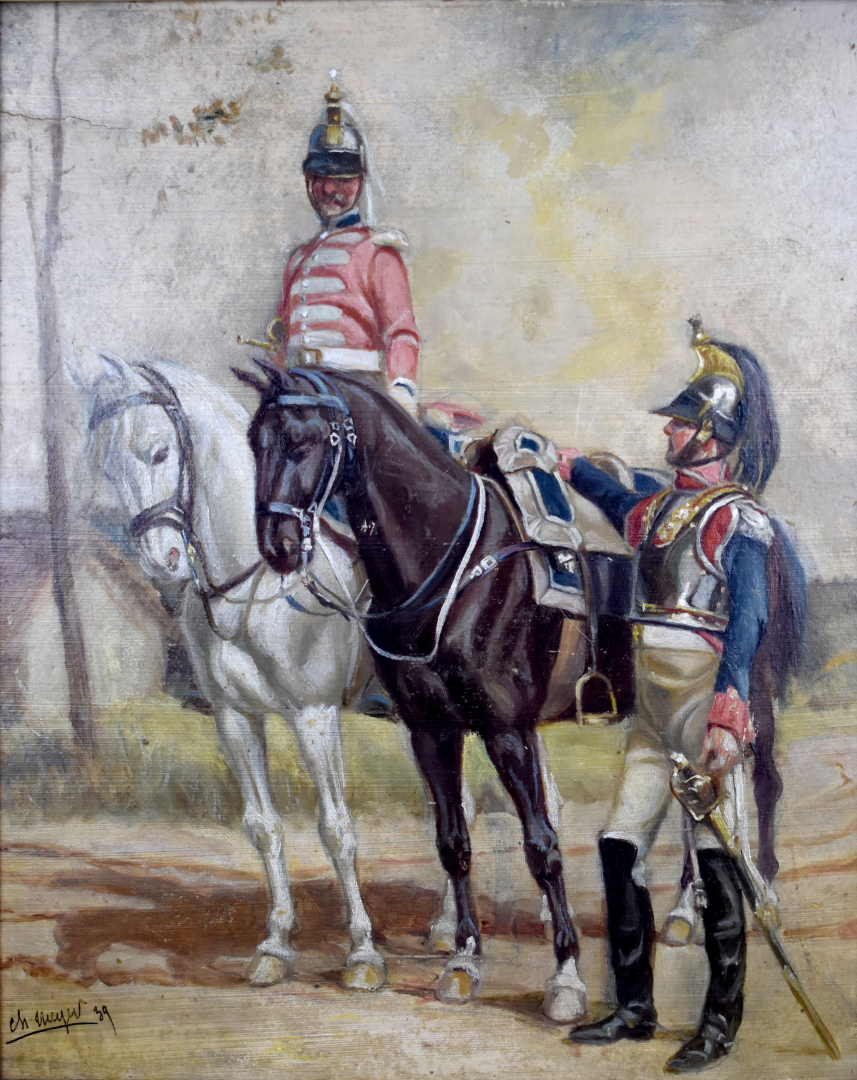 École du XXe siècle (MEYER ?). Deux cavaliers (dragons ?) en uniforme. Huile sur panneau contreplaqué signée et datée (19)39 en bas à gauche. 46 x 37 cm.