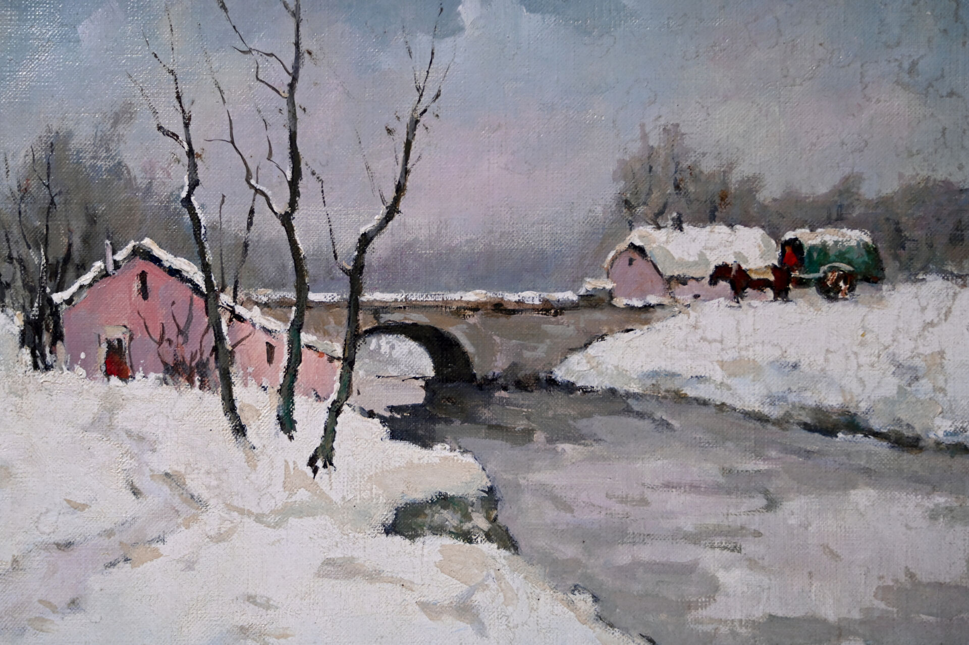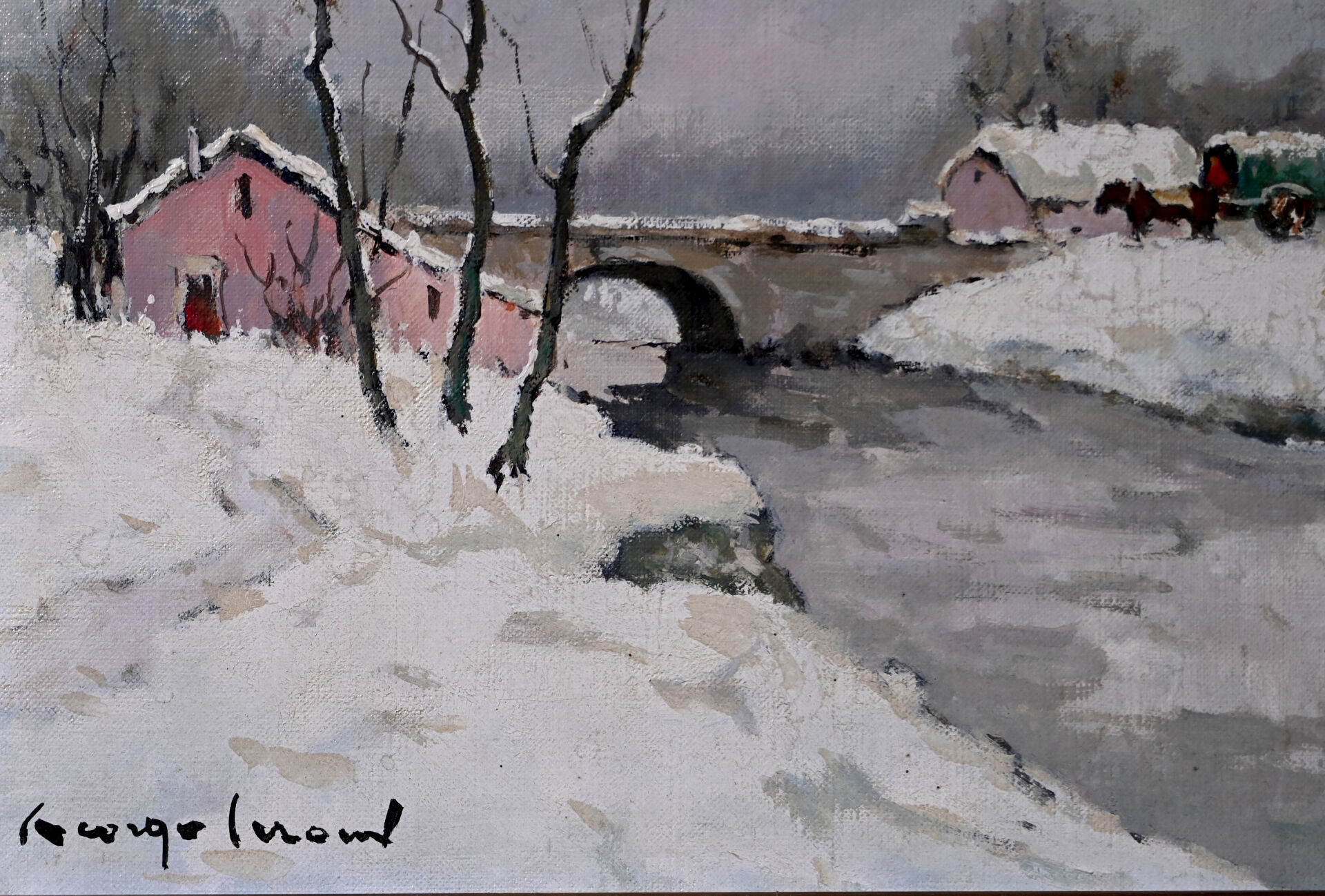 Ecole du XXe siècle. Paysage à la rivière sous la neige. Huile sur toile signée en bas à gauche. 22 x 27,5 cm.