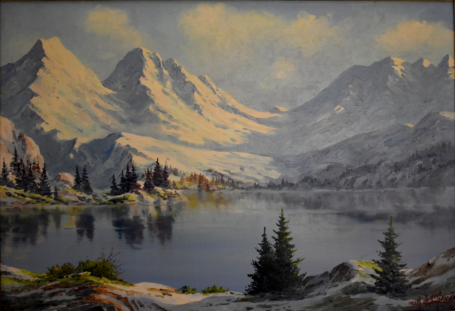 Ecole du XXe siècle (R de St Georges). Paysage au lac de montagne. Huile sur toile signé et daté 1968 en bas à droite. 38 x 55,5 cm.