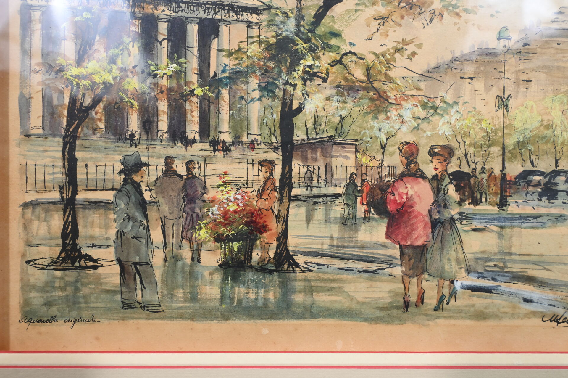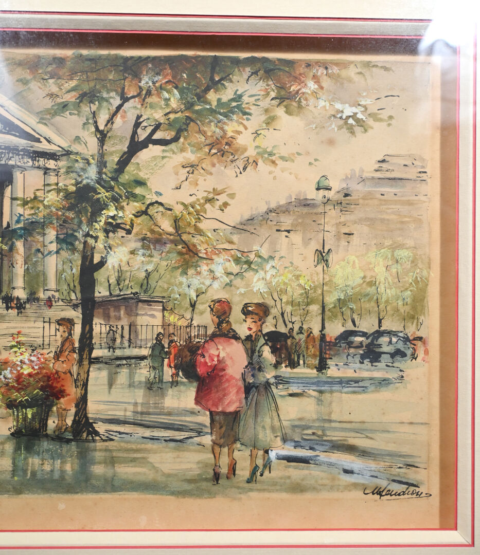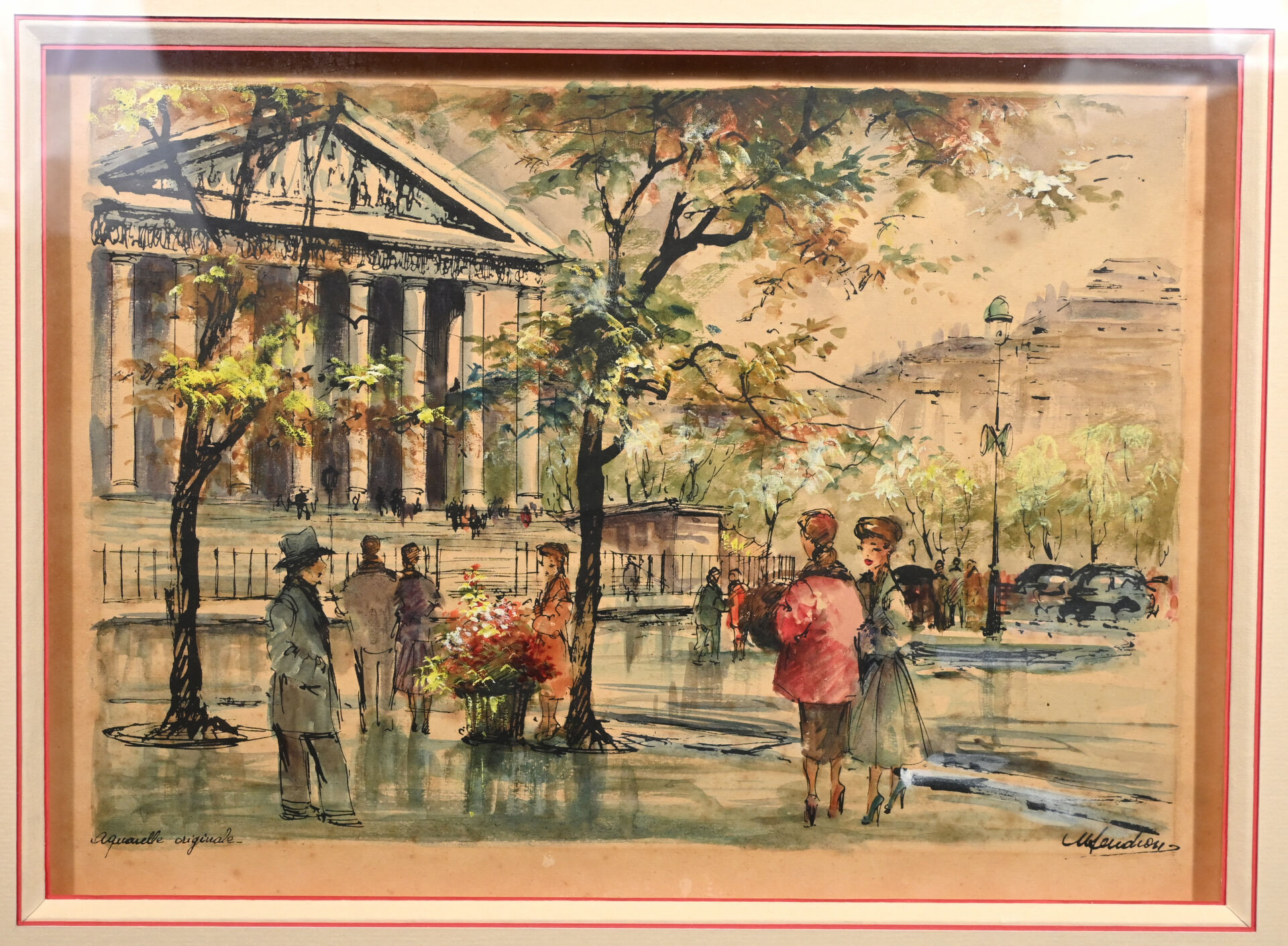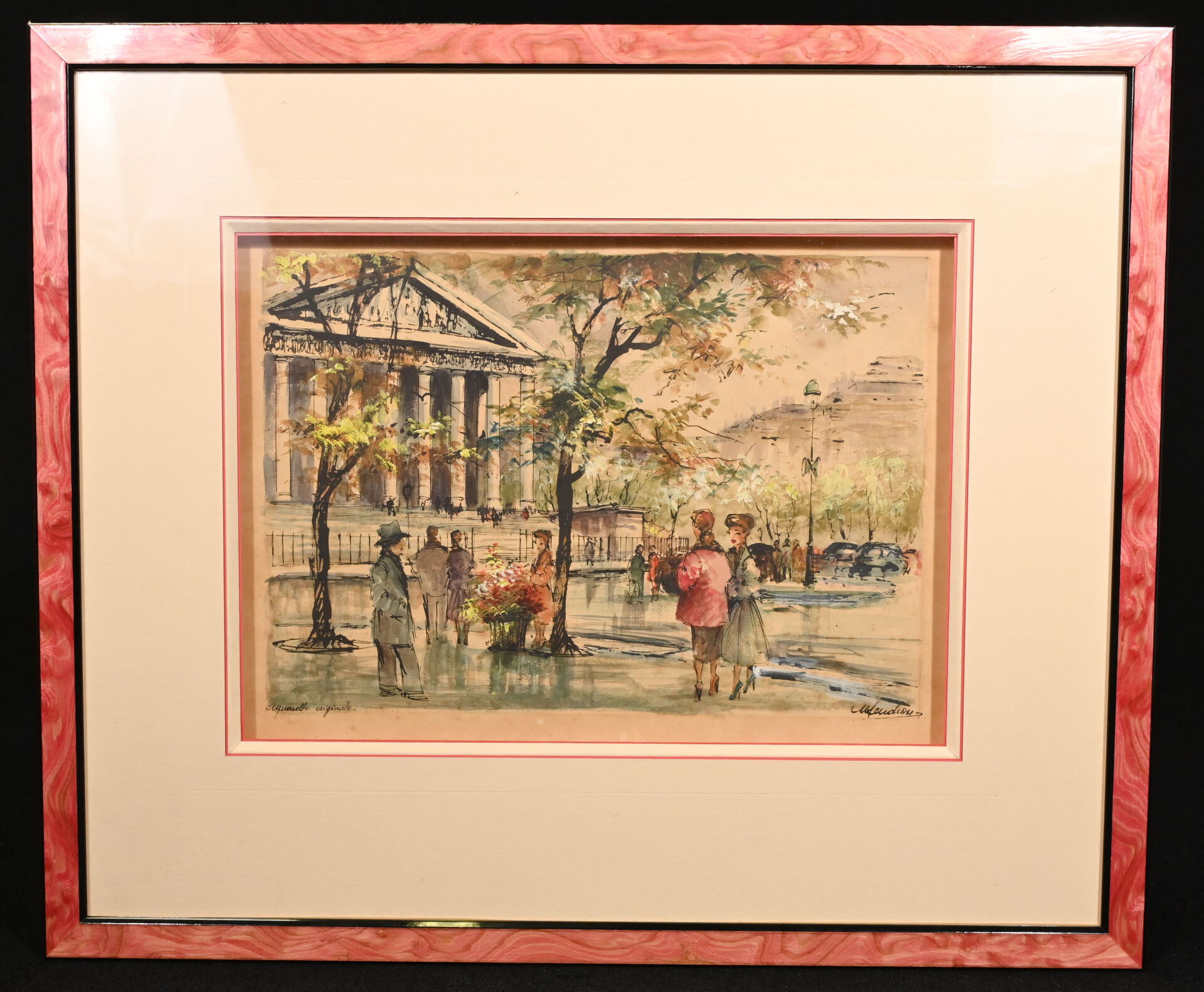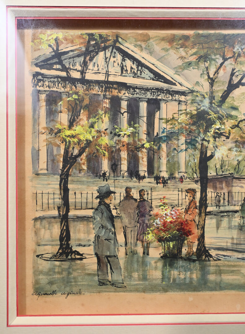 Ecole du XXe siècle, vers 1950. Place de la Madeleine, Paris. Aquarelle portant une signature en bas à droite (papier insolé). 21,5 x 31,5 cm ( à vue).