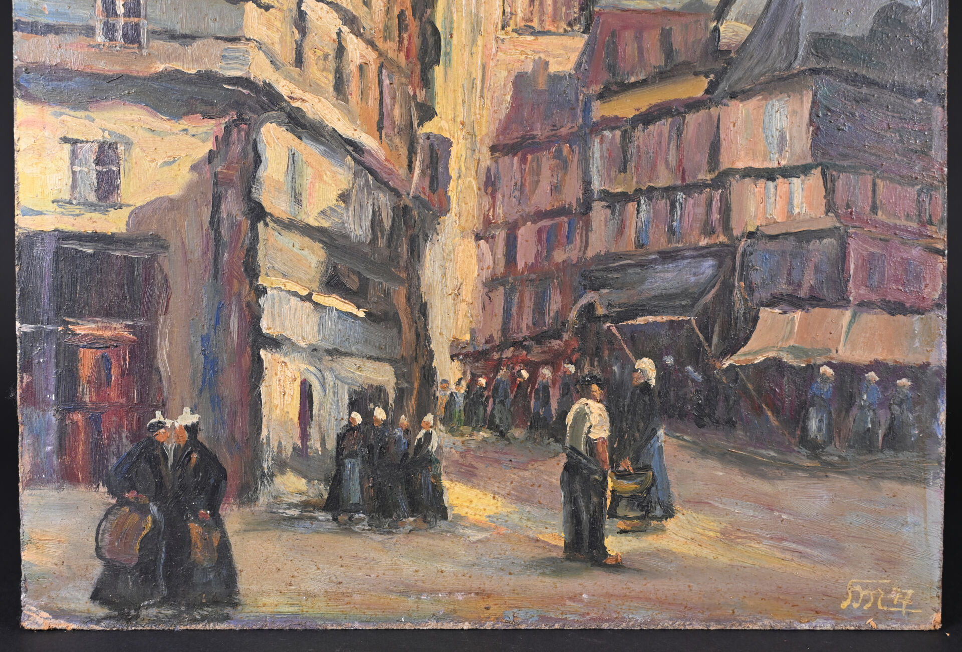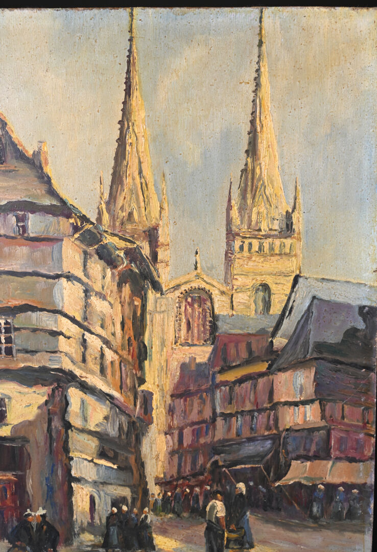 Ecole du XXe siècle. Vue de la cathédrale. Huile sur isorel signée en bas à droite.