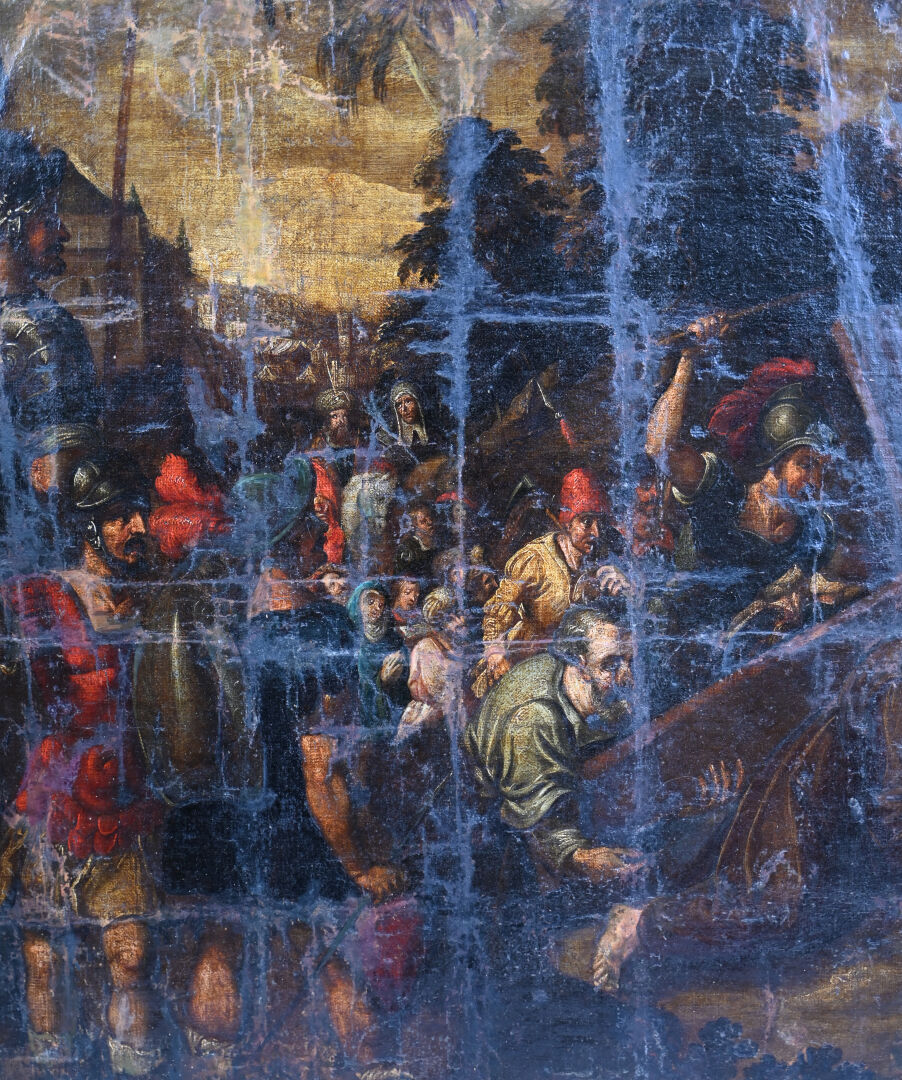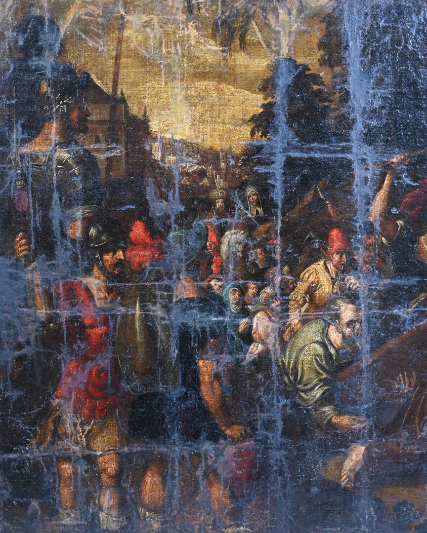 École flamande du XVIIe siècle ? Le Christ portant la croix. Huile sur toile marouflée sur panneau. Nombreuses restaurations et rentoilée. 64 x 82 cm.