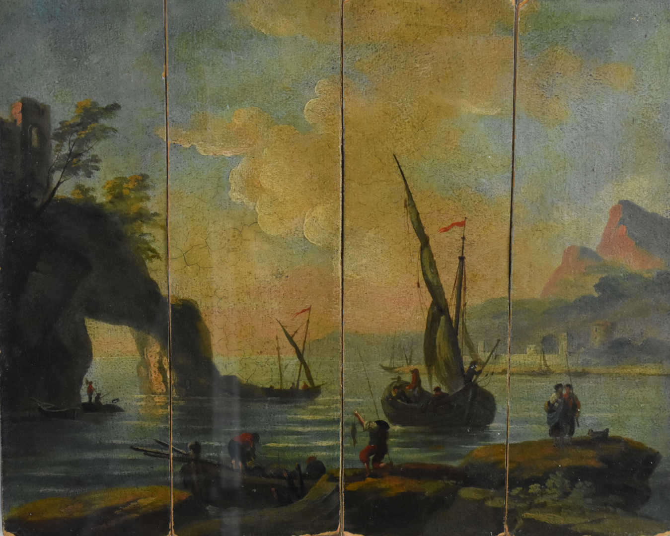 École française de la fin du XVIIIe ou du début du XIXe siècle dans le goût de VERNET. Paysages de bord de mer animé. Deux huiles sur un carton en recto verso. 34 x 42 cm.