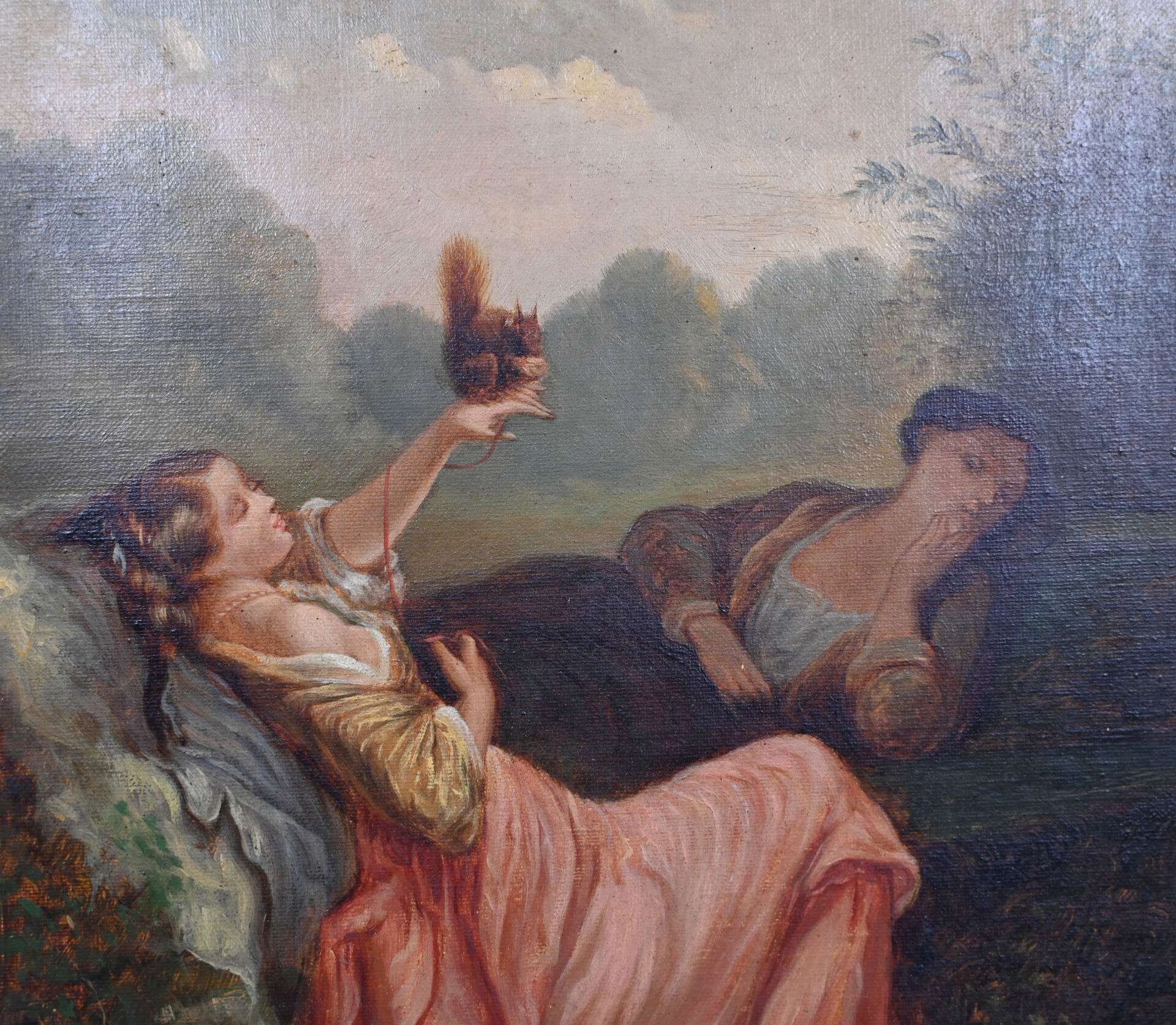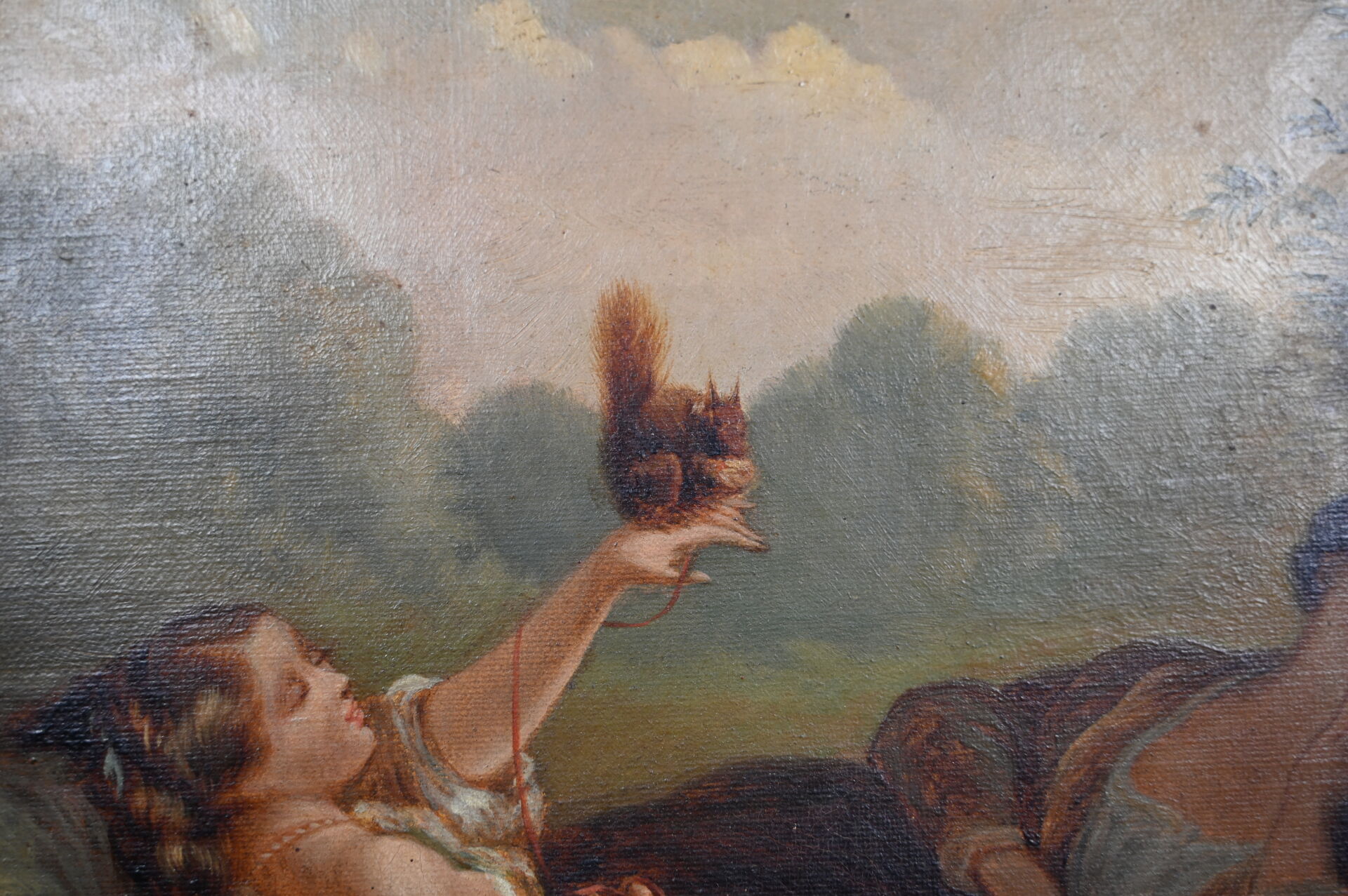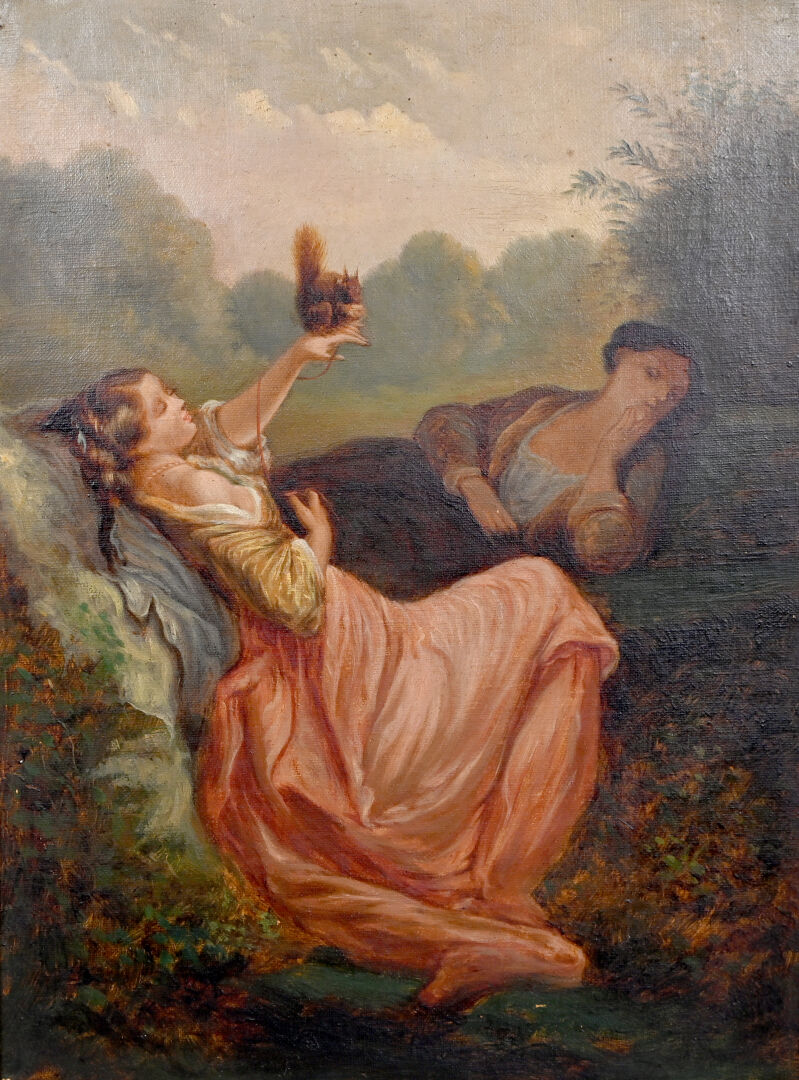 École française du XIXe siècle. L’écureuil apprivoisé. Huile sur toile. 33 x 24,5 cm.