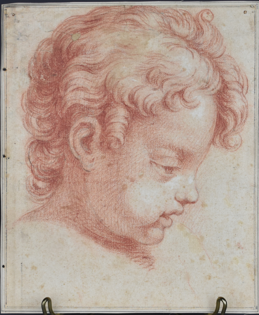 École française ou italienne du XVIIIe siècle. Tête de chérubin. Dessin à la sanguine (piqûres, un petit trou). 24 x 19,5 cm.