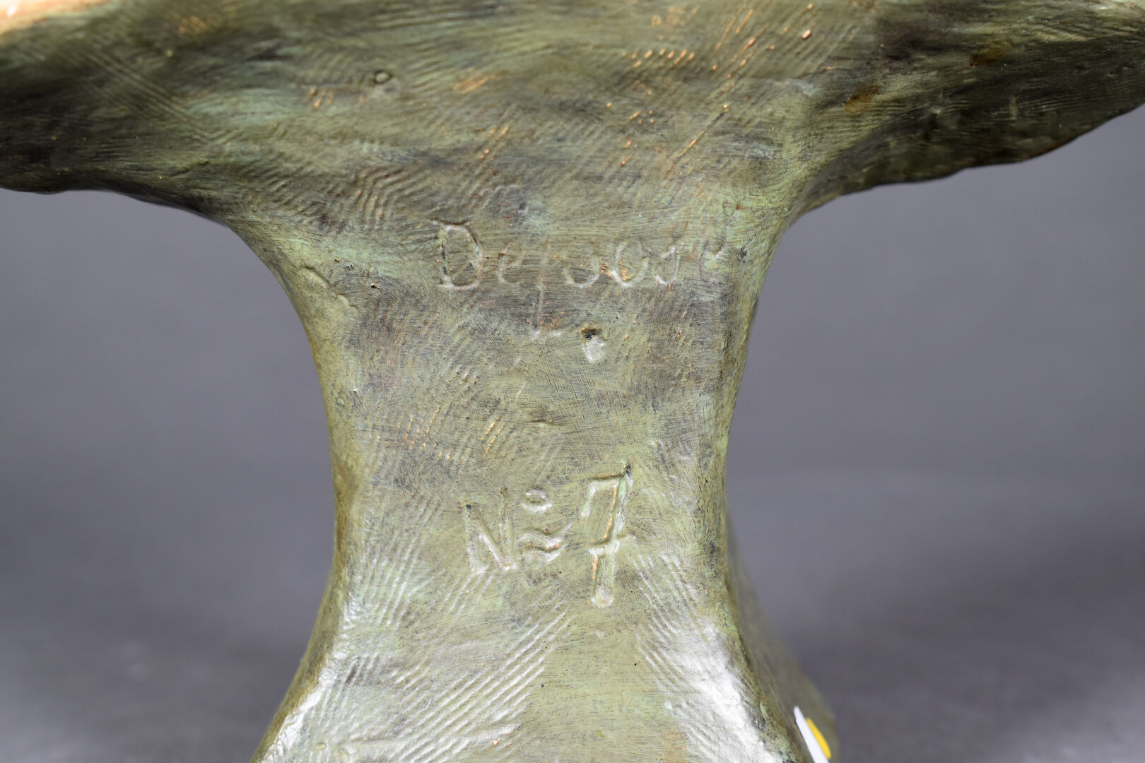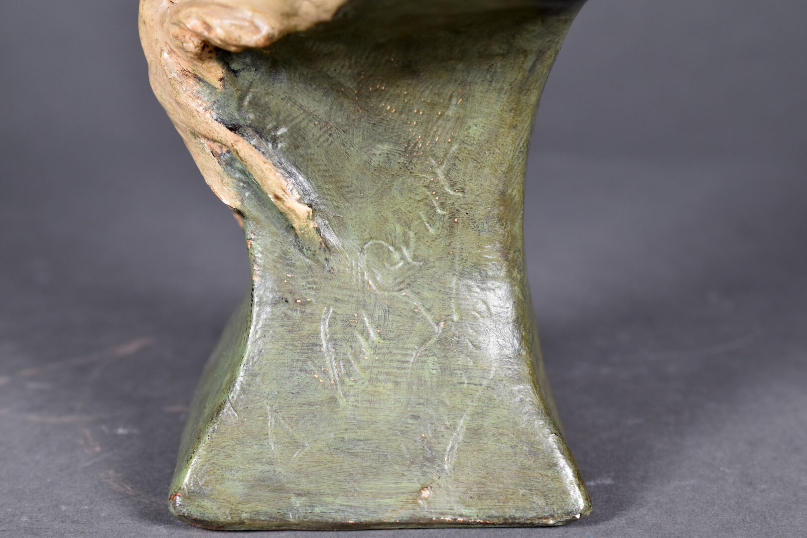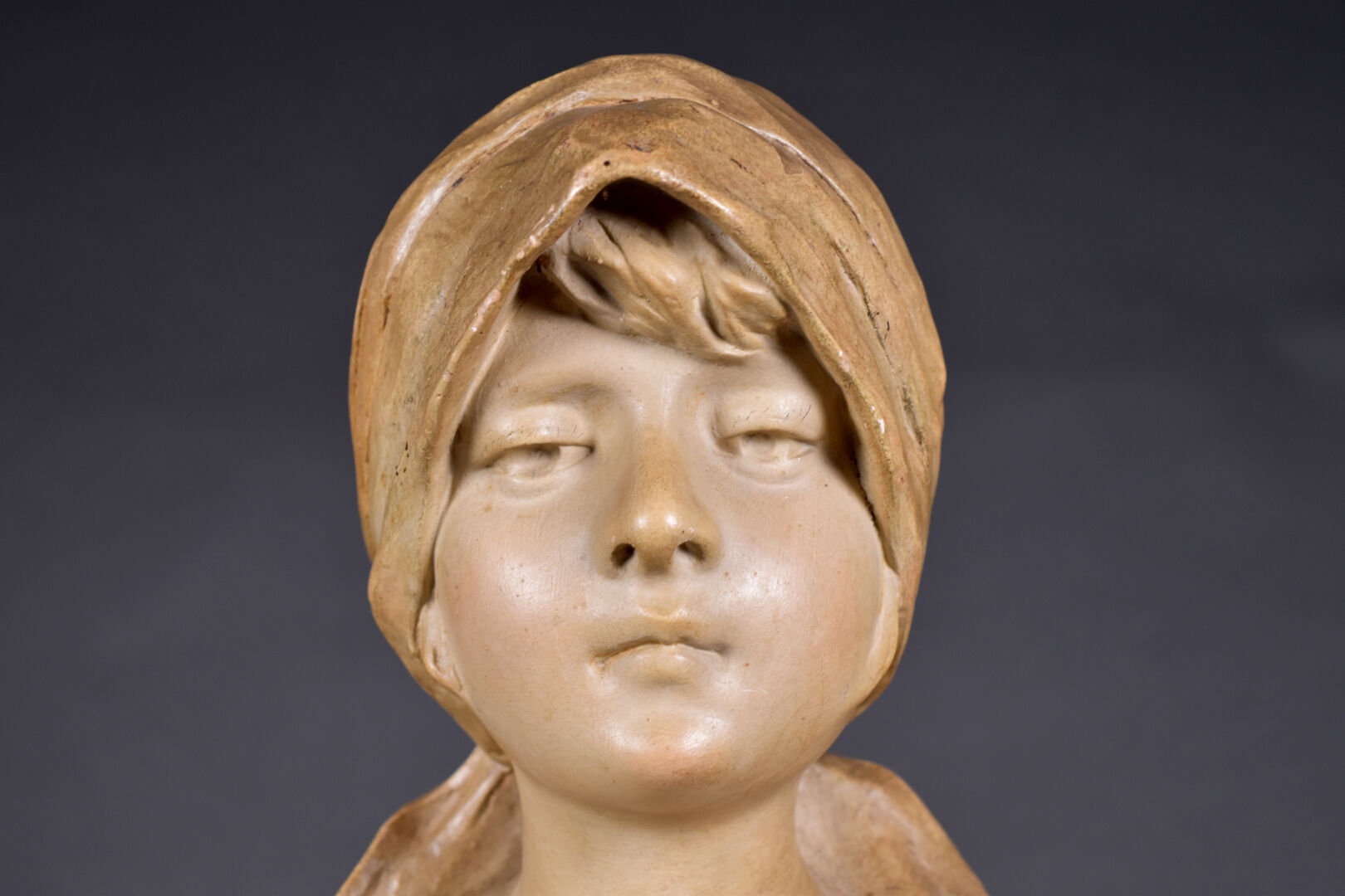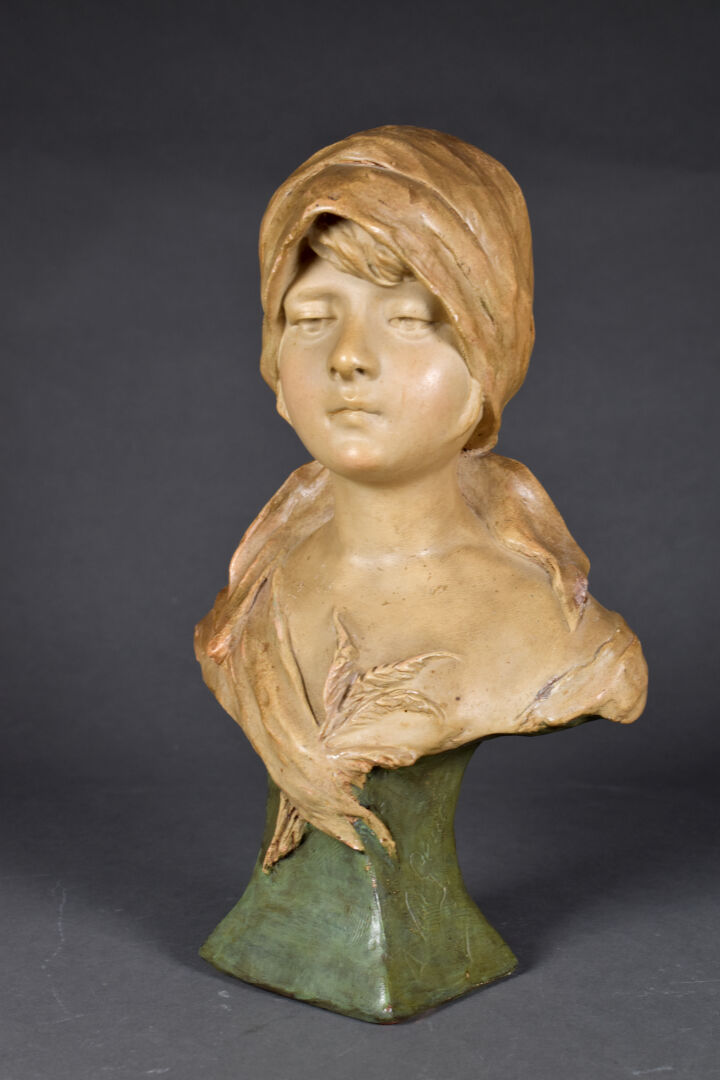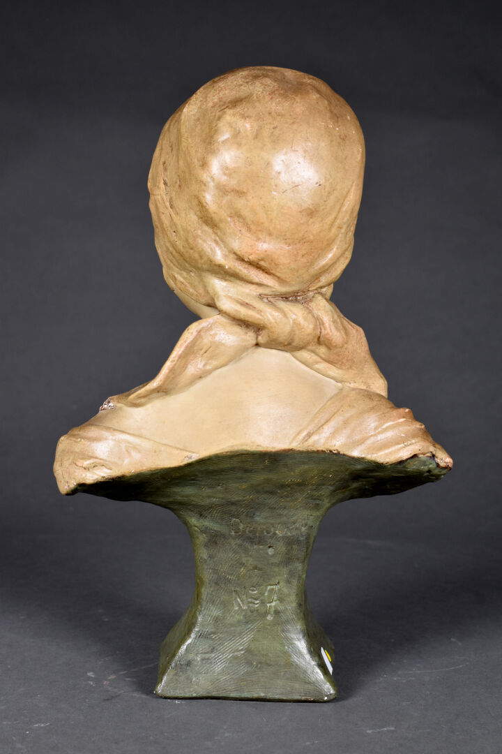 Ecole hollandaise (Van …?). Buste de paysanne en plâtre peint ocre et vert (quelques égrenures et une restauration). Signé en bas et marqué dépôt n7. Début du XXe siècle. Haut. : 41 cm.