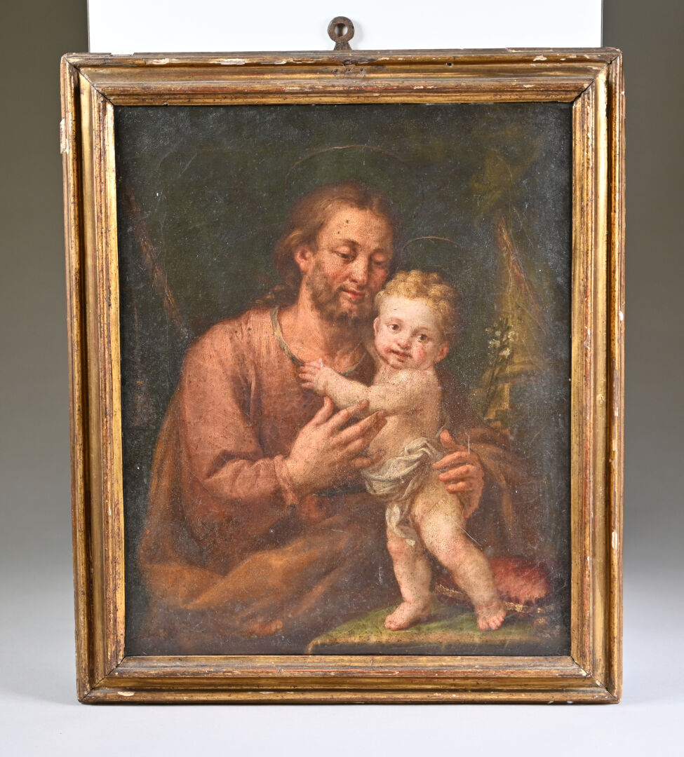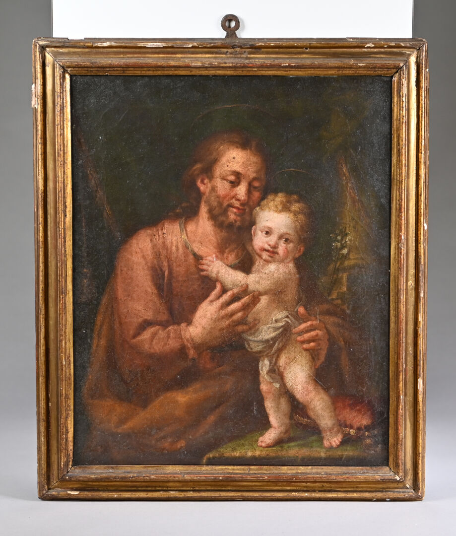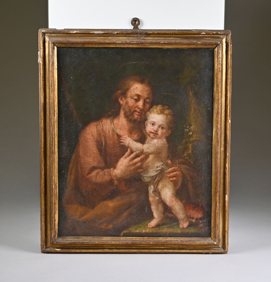École ITALIENNE du XVIIIe siècle, suiveur de Pompeo BATONI Saint Joseph et l’Enfant. Huile sur toile. 39 x 32 cm.
