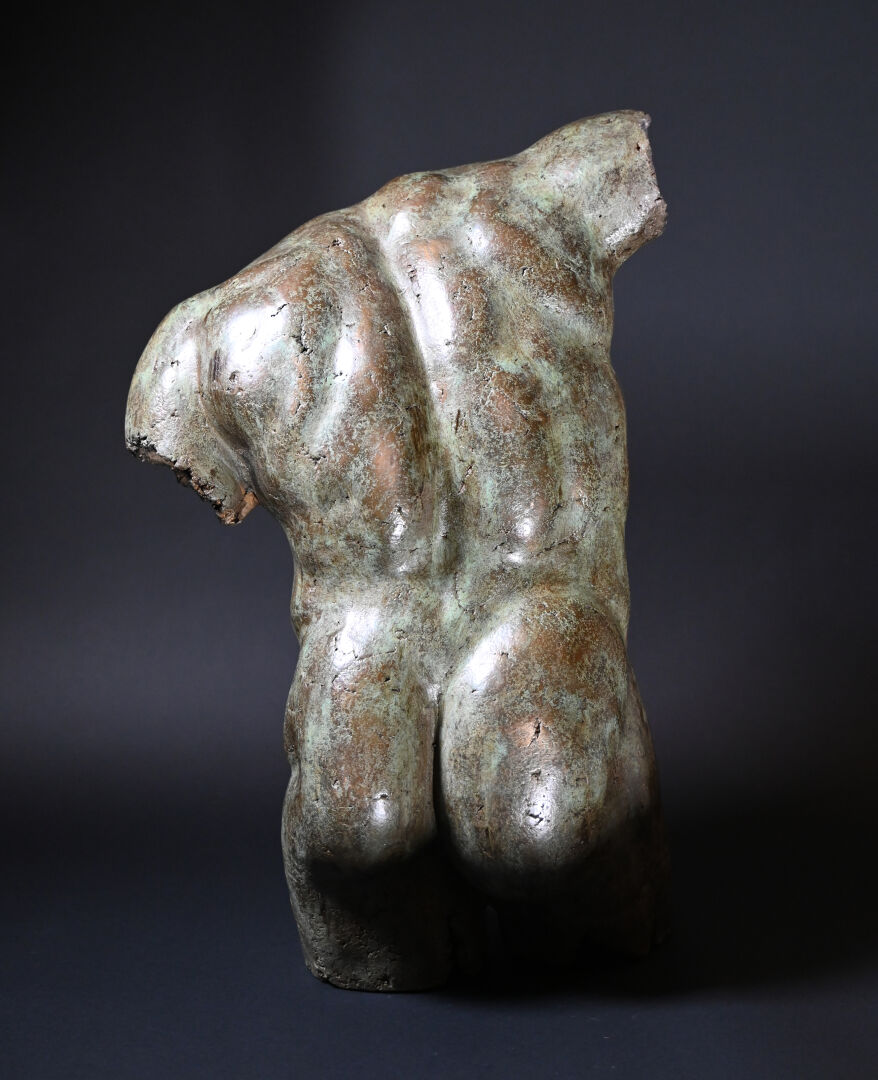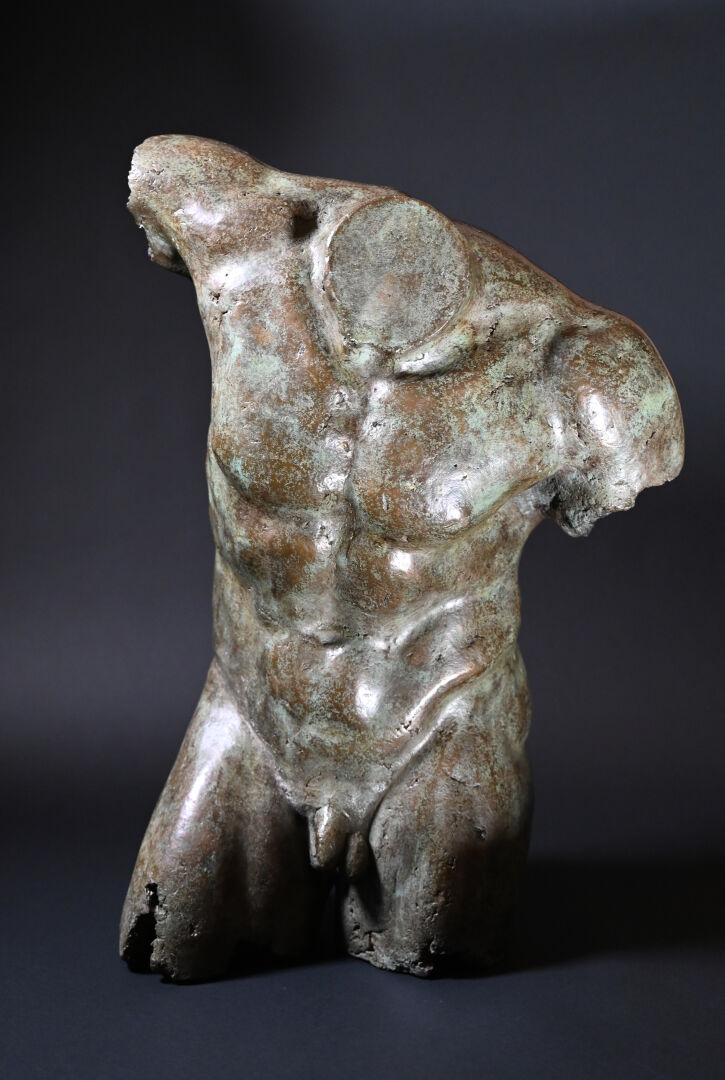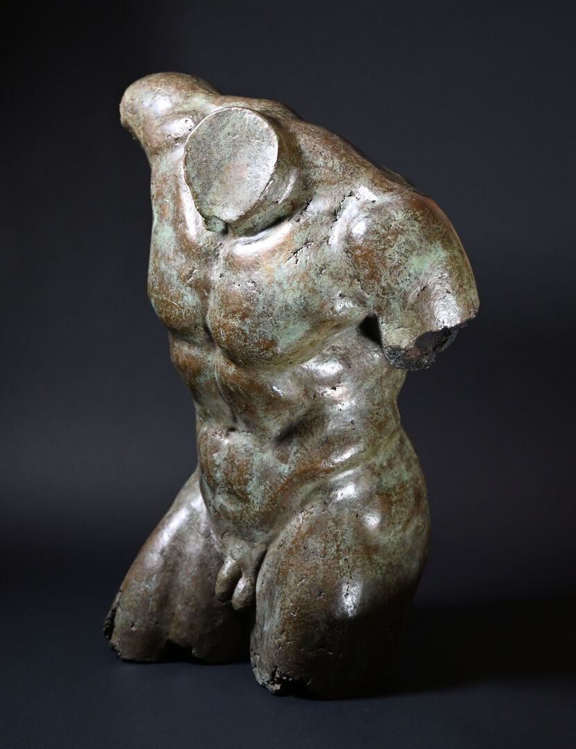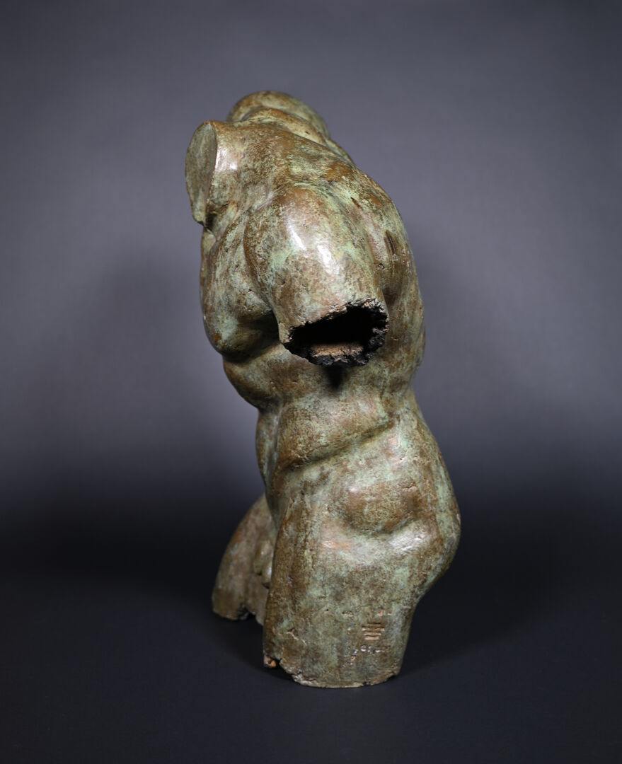 École moderne, fin du XXème siècle – début du XXIème siècle. Torse masculin dans le goût de l’antique. Bronze à patine brun vert. Porte les initiales « JL ». Porte une marque du fondeur en partie illisible « ATELIER / …. / PROVENCE / FRANCE ». Numéroté « 21/200 ». H. 70 x L. 49 x P. 30 cm.