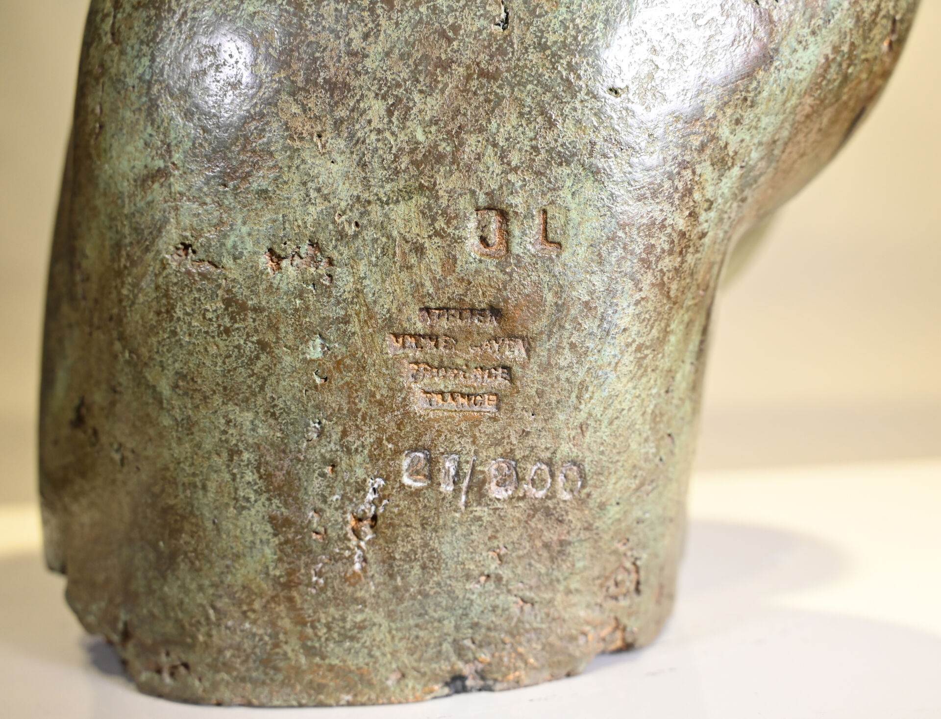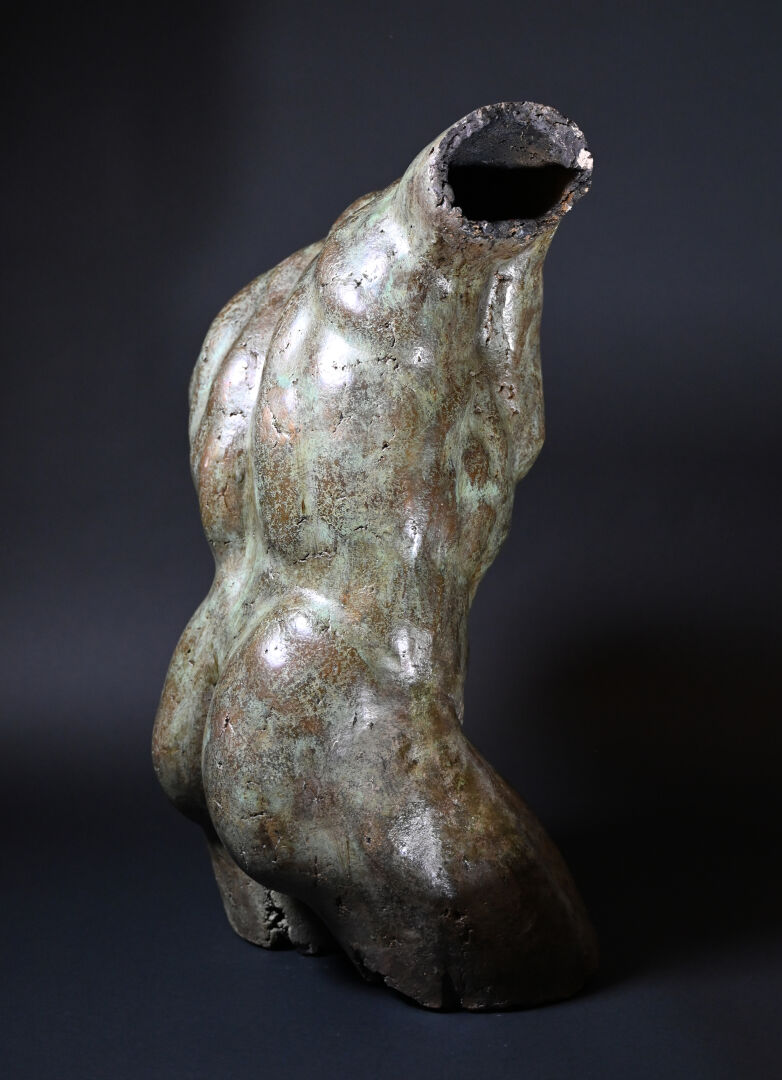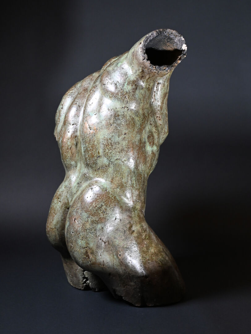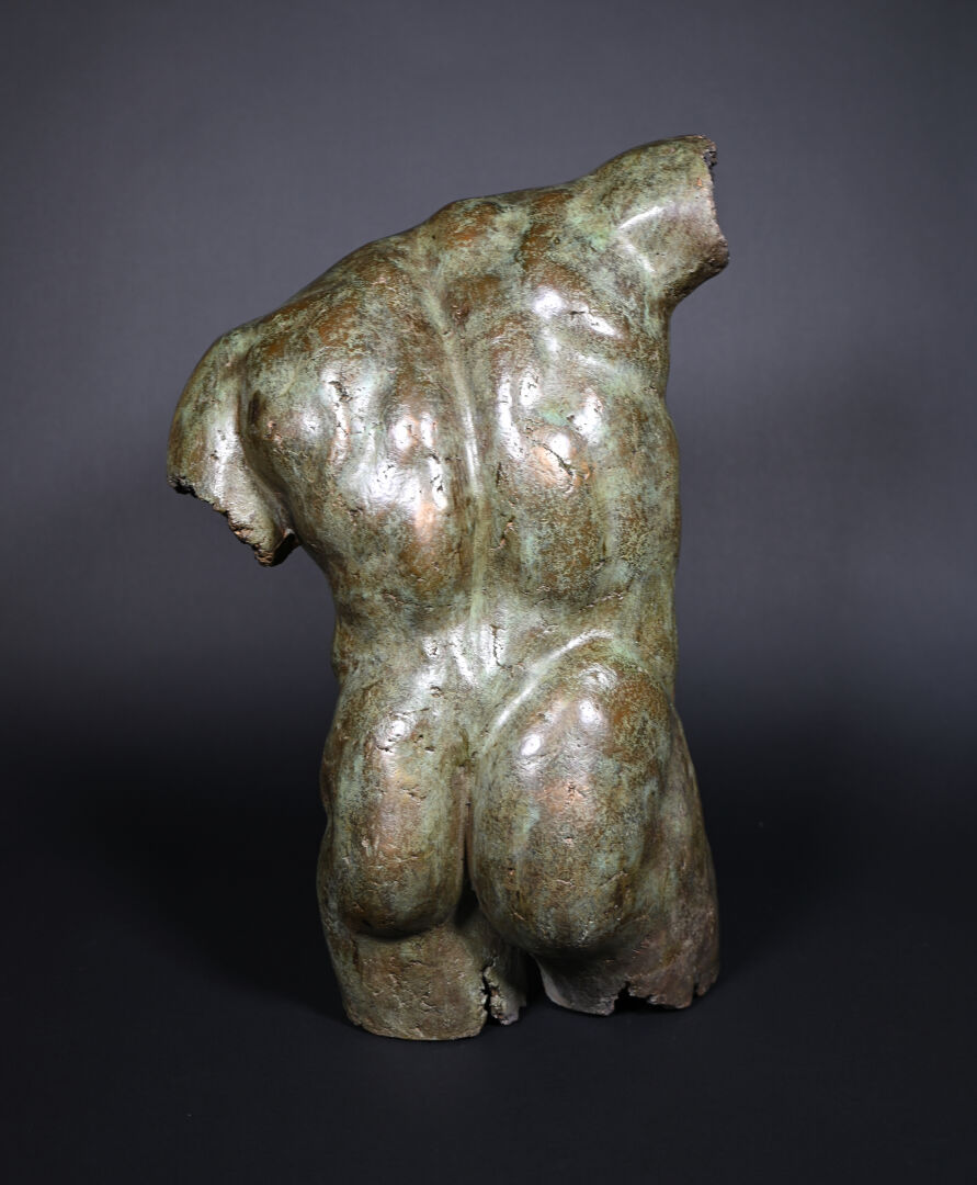 École moderne, fin du XXème siècle – début du XXIème siècle. Torse masculin dans le goût de l’antique. Bronze à patine brun vert. Porte les initiales « JL ». Porte une marque du fondeur en partie illisible « ATELIER / …. / PROVENCE / FRANCE ». Numéroté « 21/200 ». H. 70 x L. 49 x P. 30 cm.
