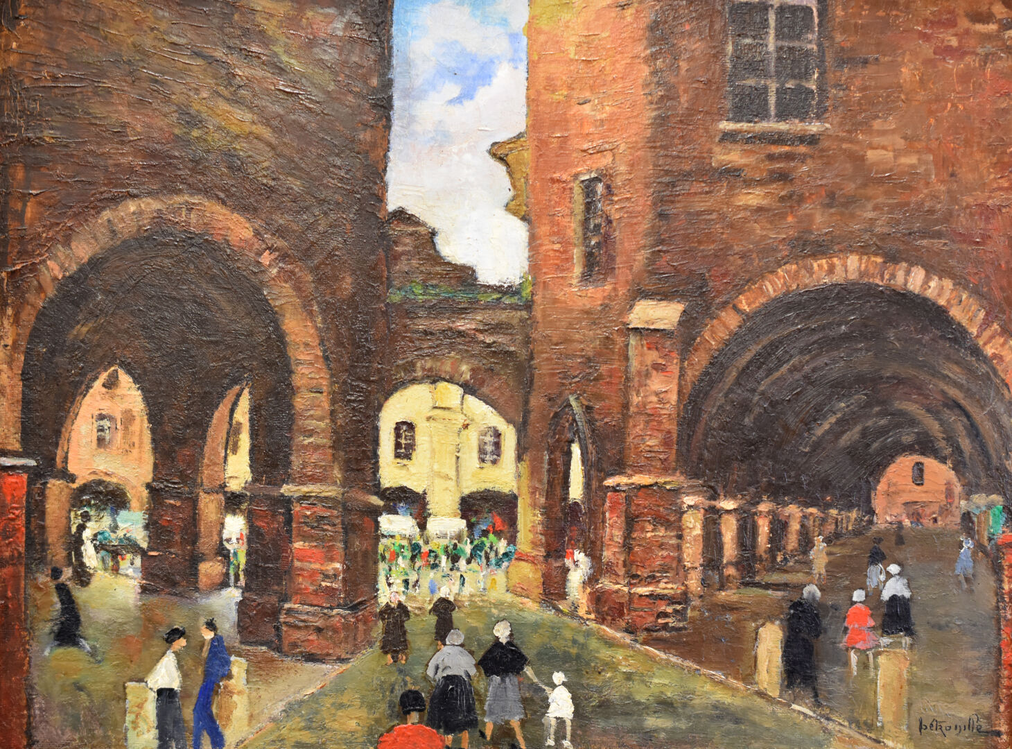 Ecole Montalbanaise du XXe siècle (Bétronille ?). La place Nationale, Montauban. Huile sur carton signée en bas à droite. 50 x 64,5 cm.