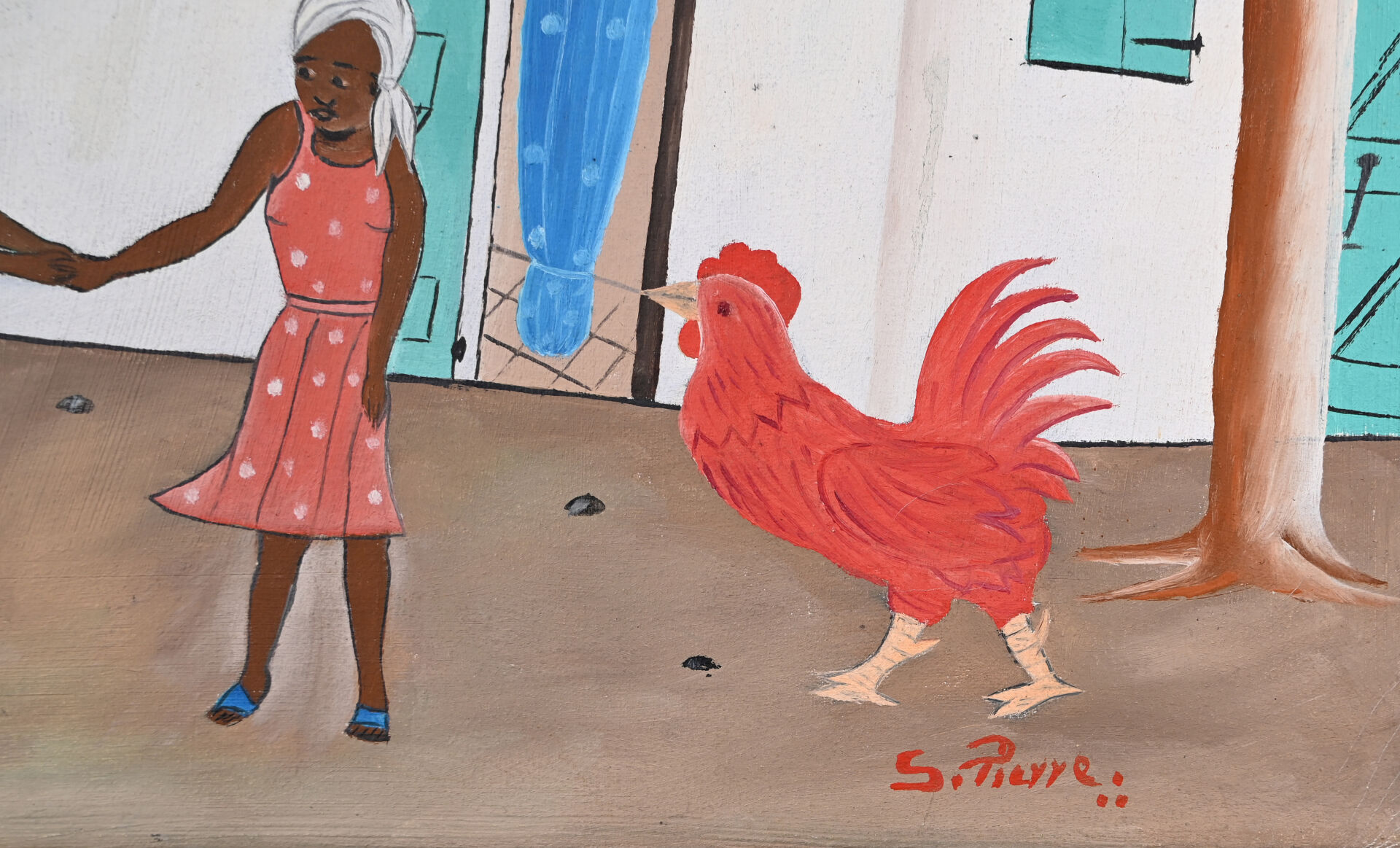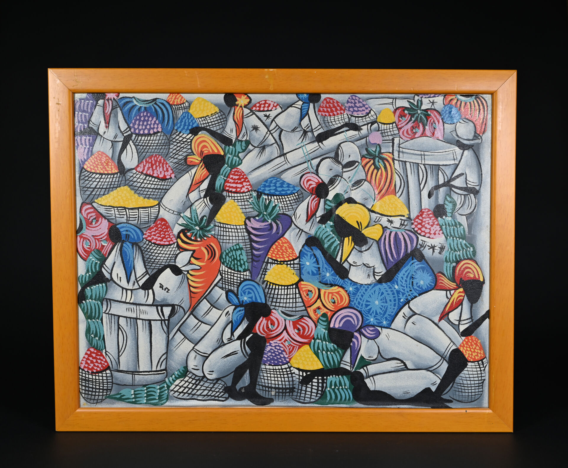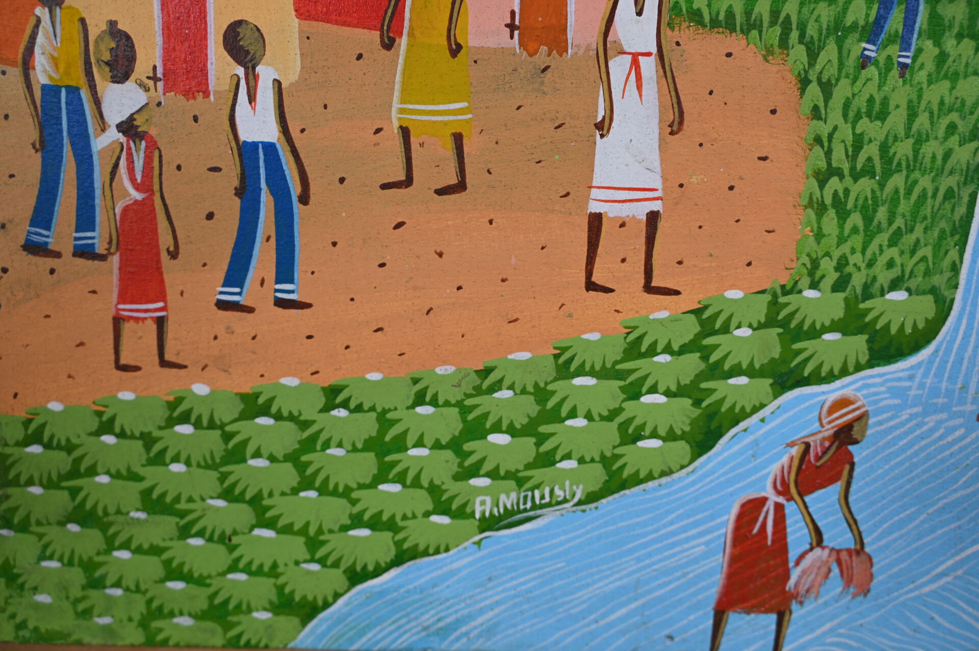 Ecole Naïve du XXe siècle (Haïti). Scènes de vie et paysage. Quatre huiles , 3 sur toile et une sur cartons, signées (quelques usures). Dim. moyennes : 30 x 40 cm.