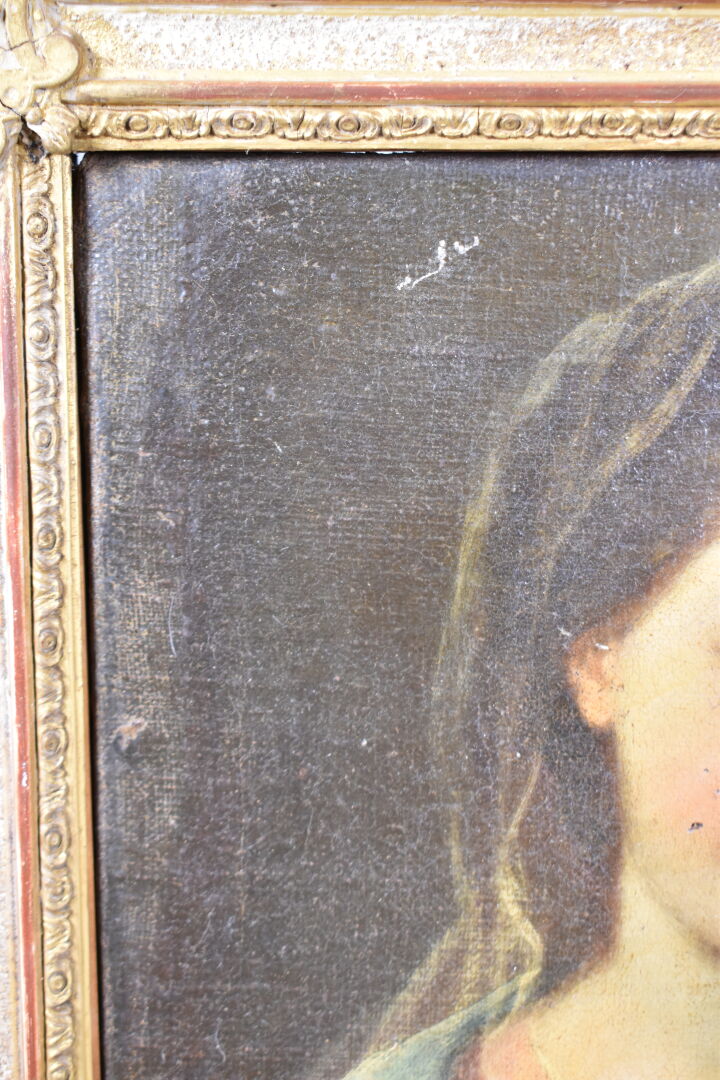 École ROMAINE du XVIIIe siècle, entourage de Carlo MARATTA. Vierge en prière. Huile sur toile (sauts de peinture, griffures). Hauteur : 38,7 cm. Largeur : 29 cm. Cachet de cire au verso Ferdinand …