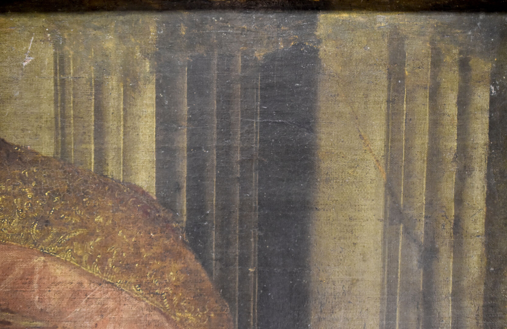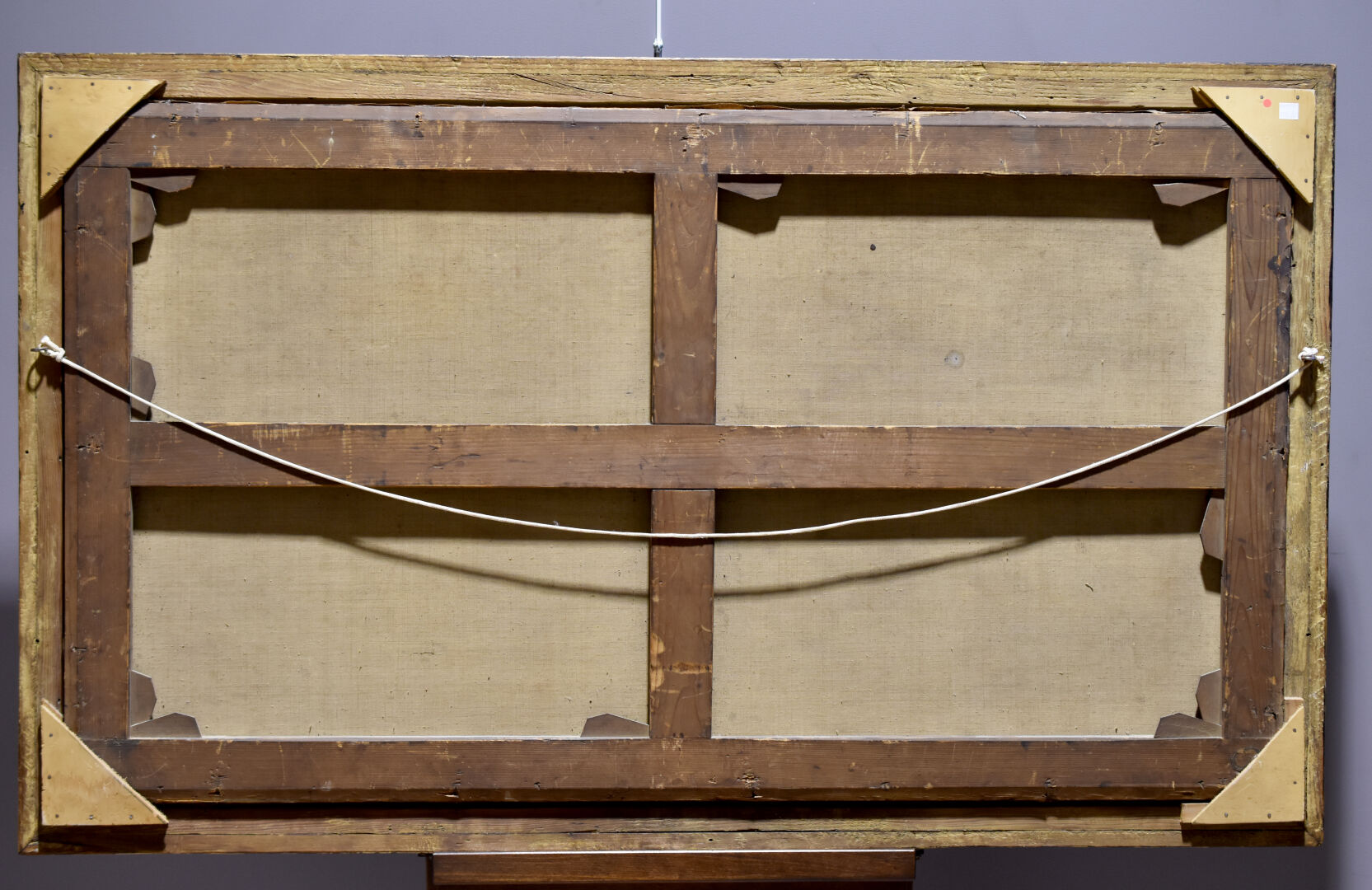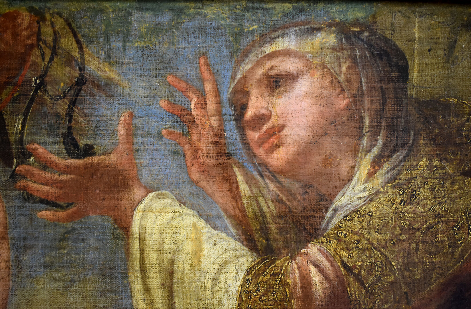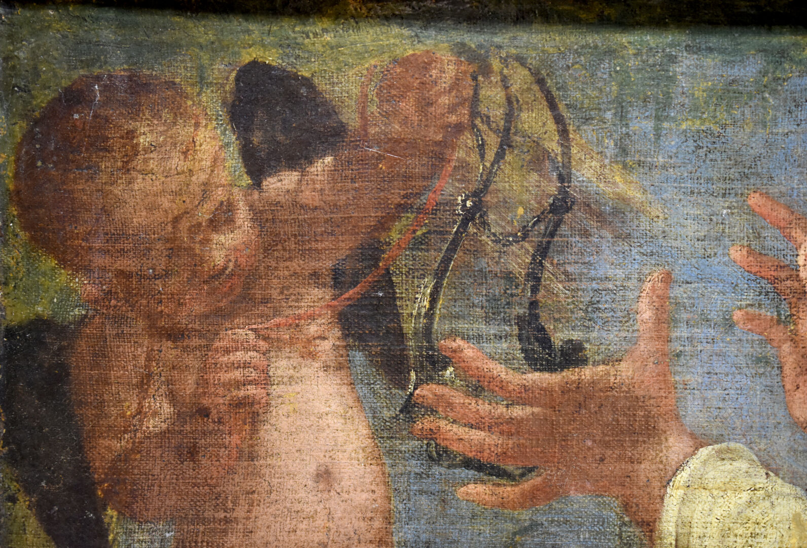École vénitienne vers 1730. Cupidon présentant le mors de la Tempérance à une courtisane. Huile sur toile (restaurations anciennes, rentoilée). 71,5 x 125 cm. La Tempérance, vertu qui modère les passions, est traditionnellement associée au mors qui aide le cavalier à modérer l’allure de son cheval.