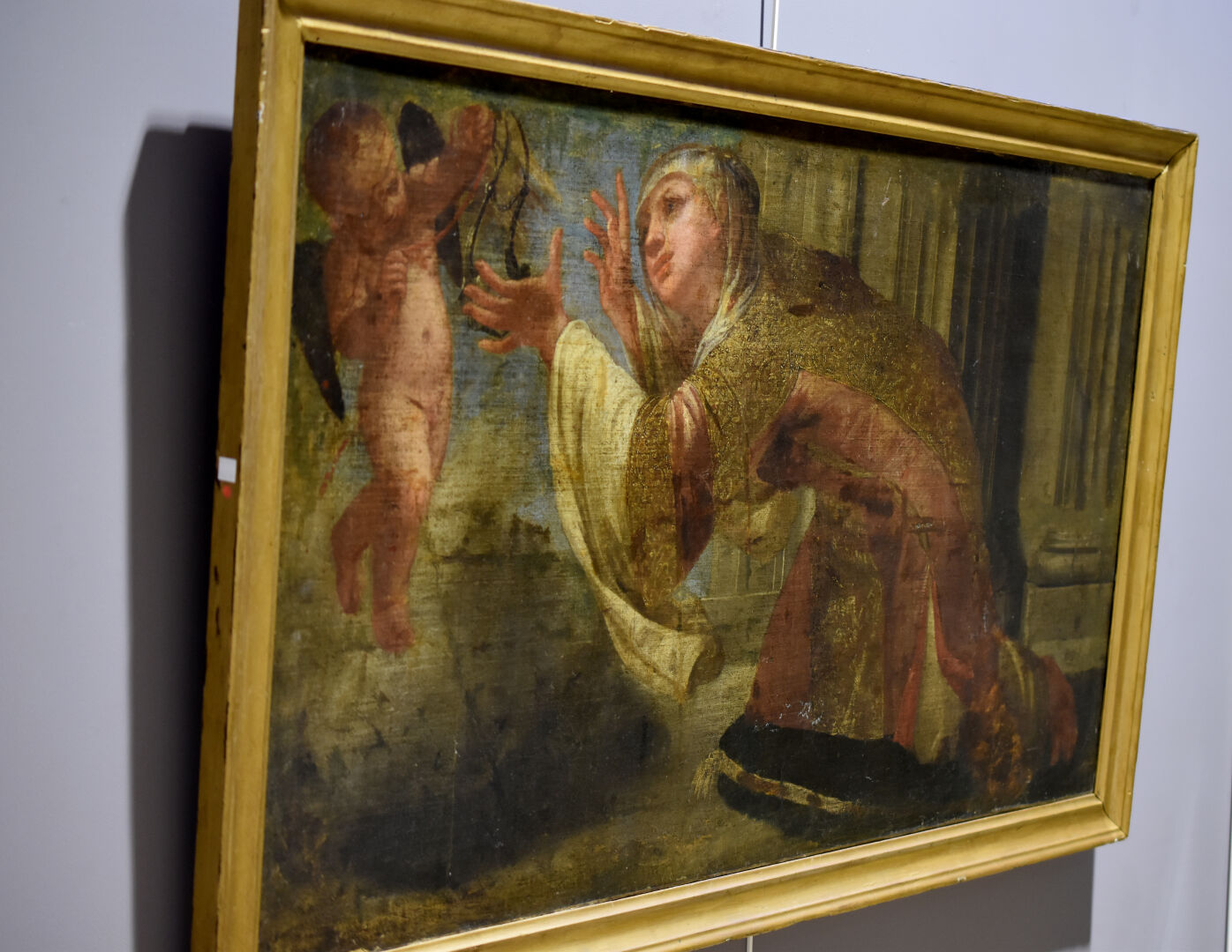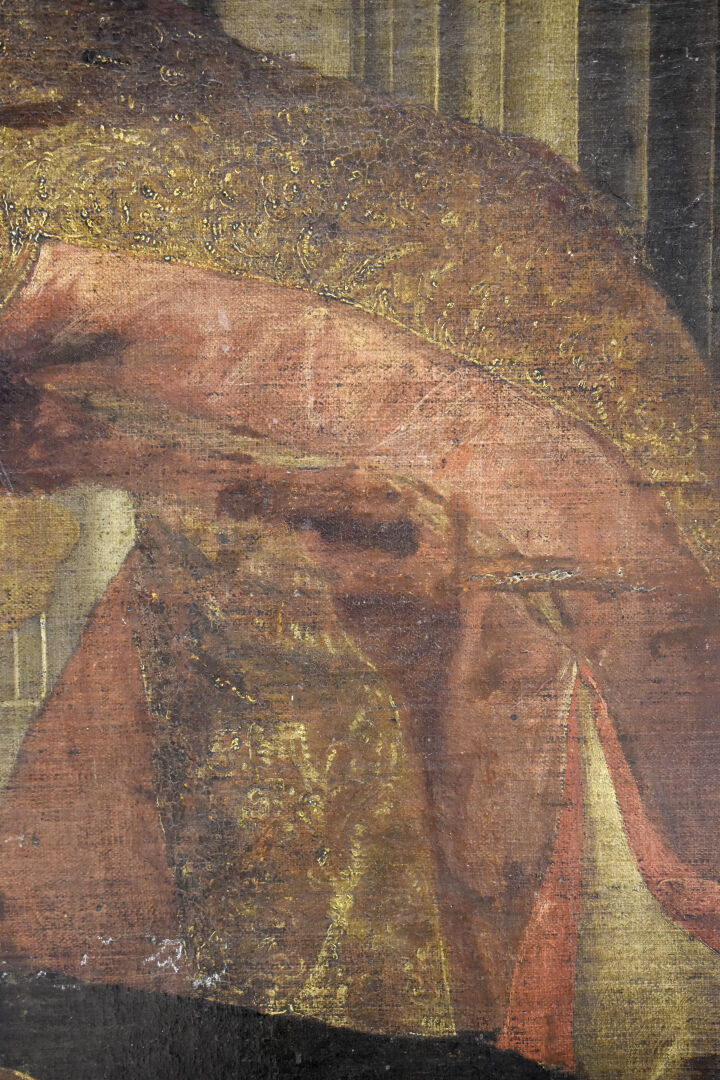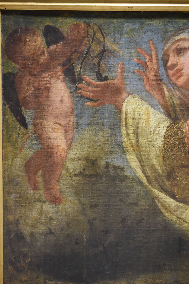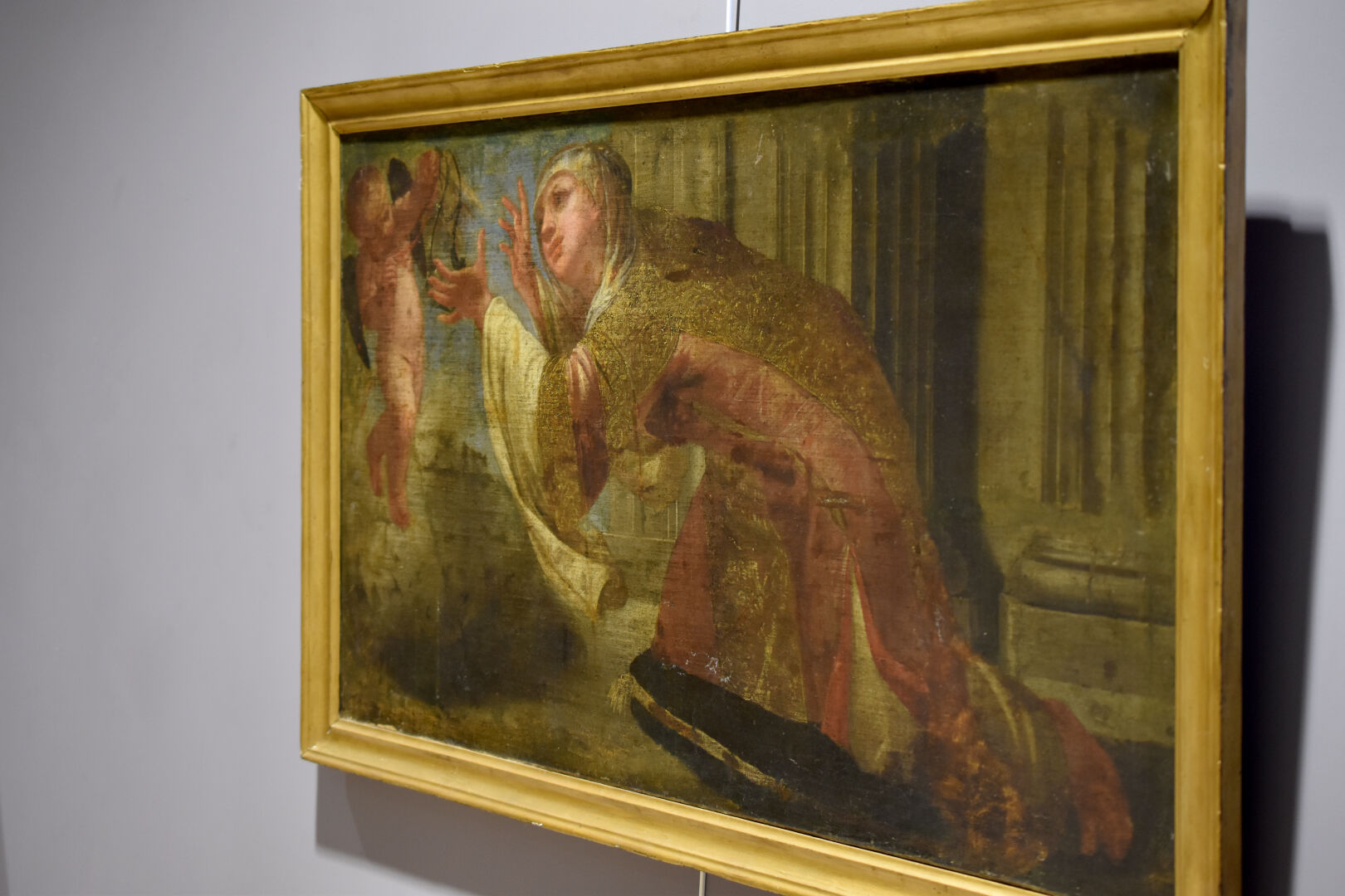 École vénitienne vers 1730. Cupidon présentant le mors de la Tempérance à une courtisane. Huile sur toile (restaurations anciennes, rentoilée). 71,5 x 125 cm. La Tempérance, vertu qui modère les passions, est traditionnellement associée au mors qui aide le cavalier à modérer l’allure de son cheval.