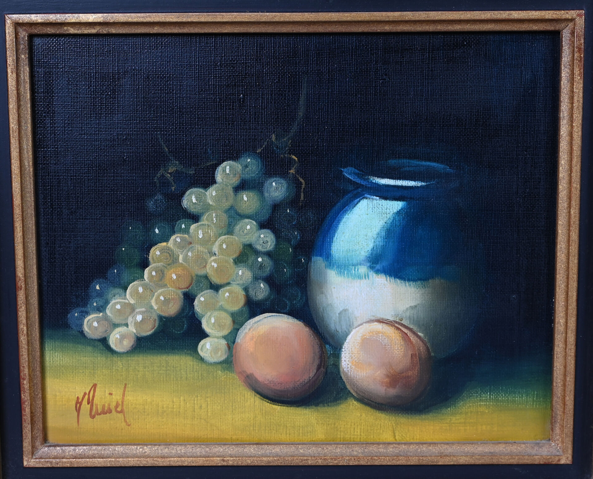 Ecoles du XXe siècle. Nature morte aux raisins, Bouquet de fleurs et Paysage des Pyrénées. 3 huiles, deux sur toile, une sur panneau, signées. 22 x 27 cm (Nature morte) – 19 x 19 cm (à vue pour le bouquet) – 18 x 25 cm (Pyrénées).