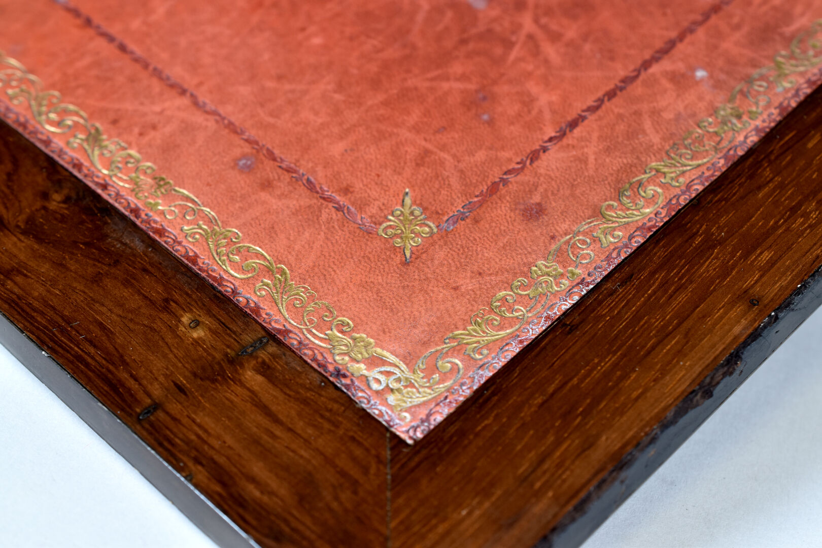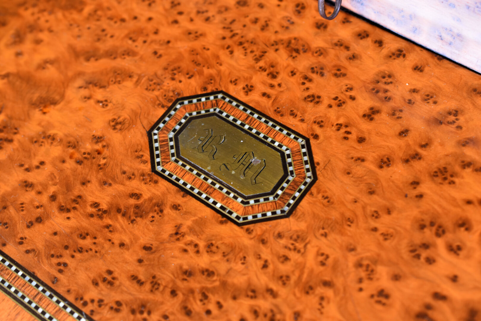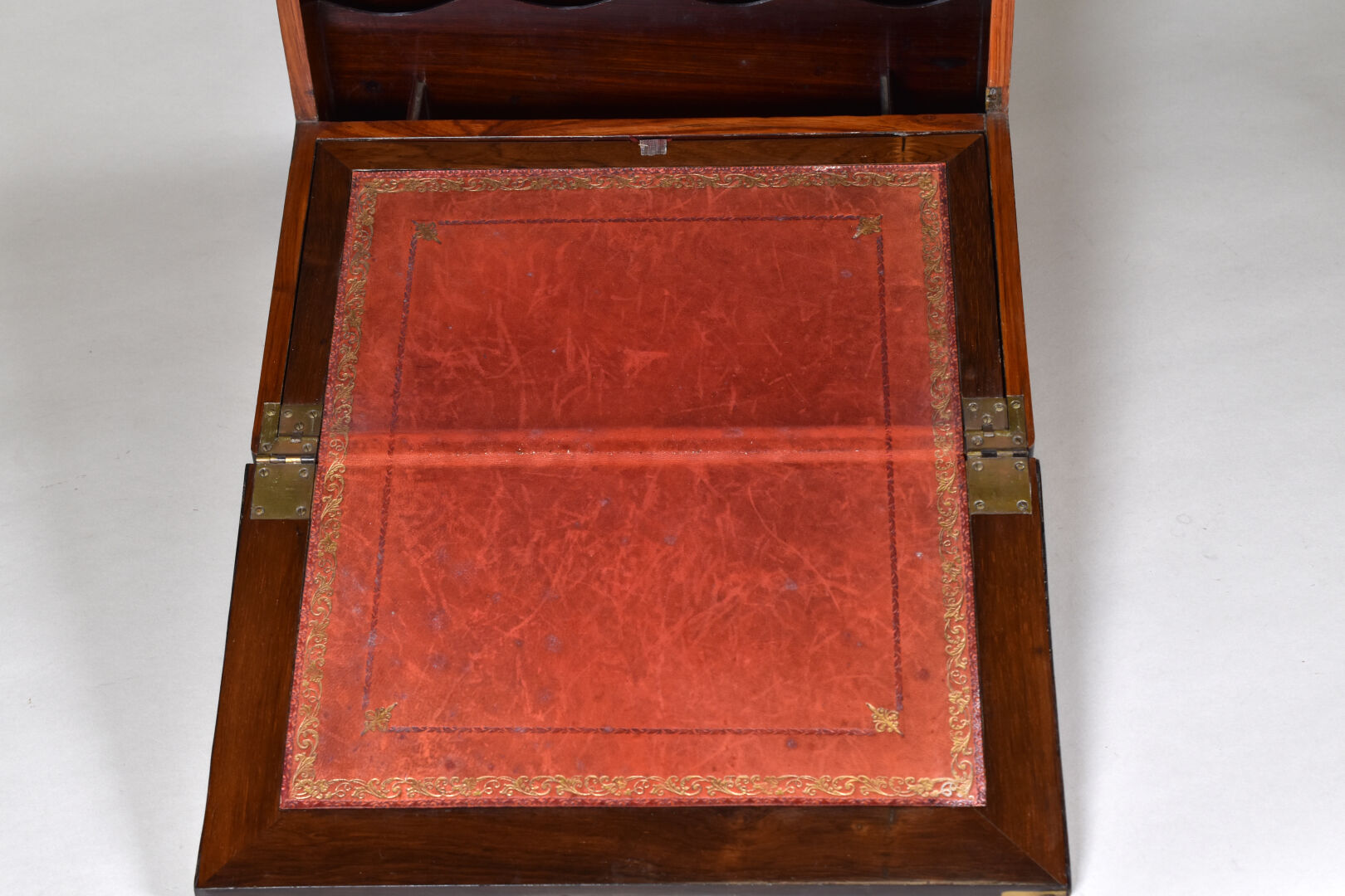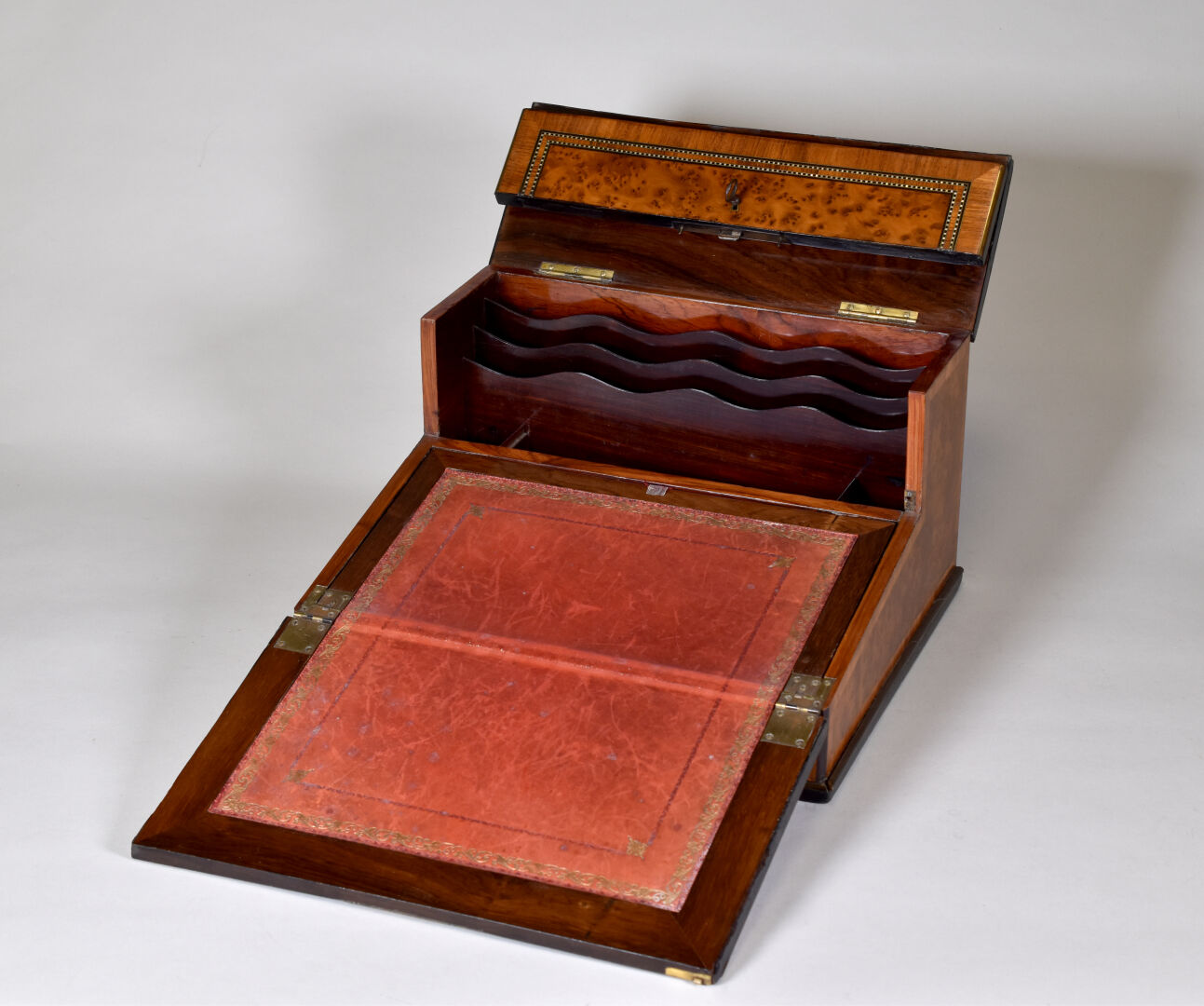 Ecritoire de voyage en placage de loupe de noyer, bois de rose, amarante et palissandre, laiton. Il ouvre à deux abattants découvrant une niche à lettres et un écritoire gainé de cuir rouge doré aux petits fer (usures, éclats, sauts de placage) Le couvercle monogrammé R.M. XIXe siècle. Haut. : 21,5 cm -Larg. : 36 cm – Prof. : 31,5 cm.
