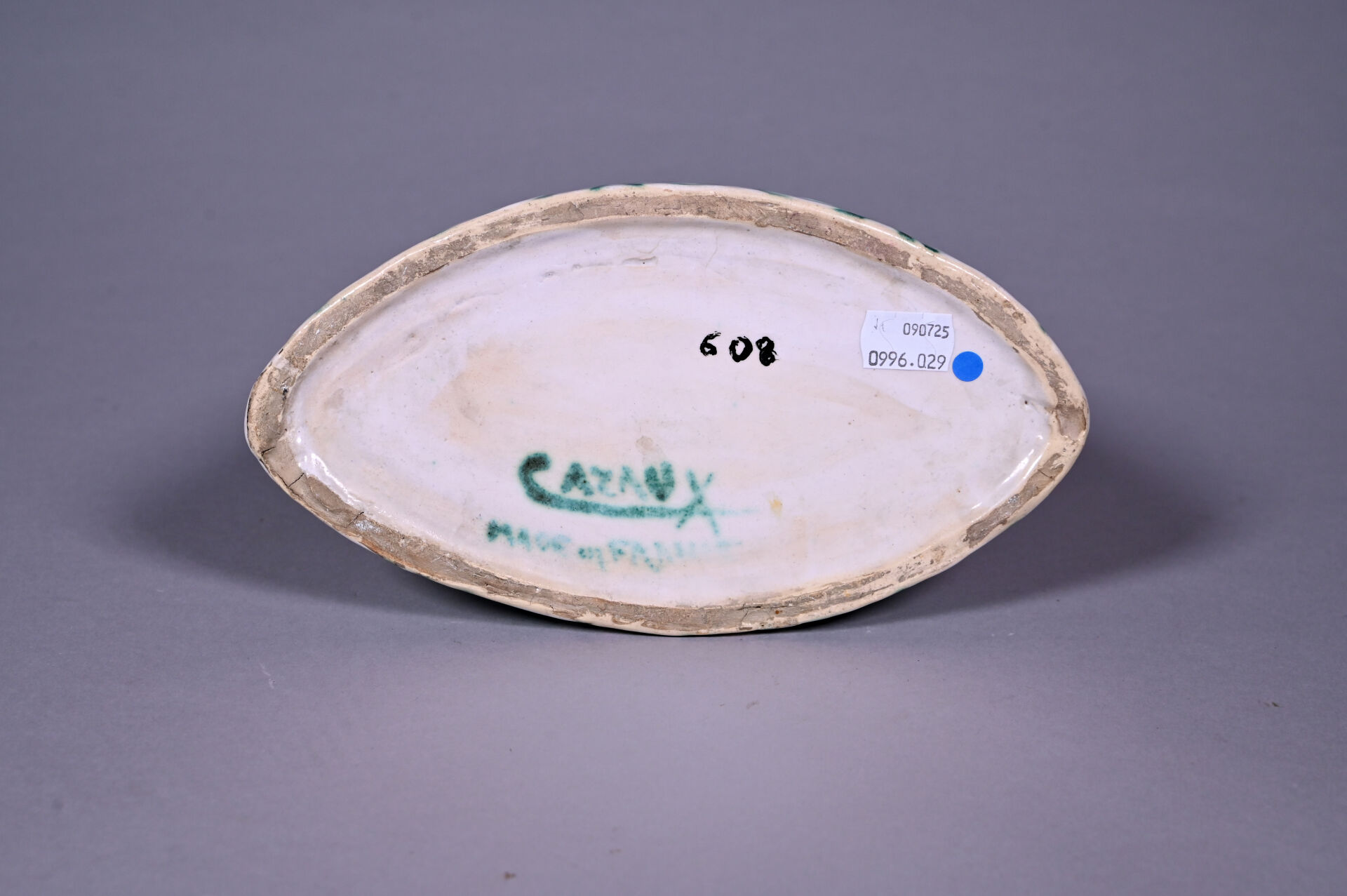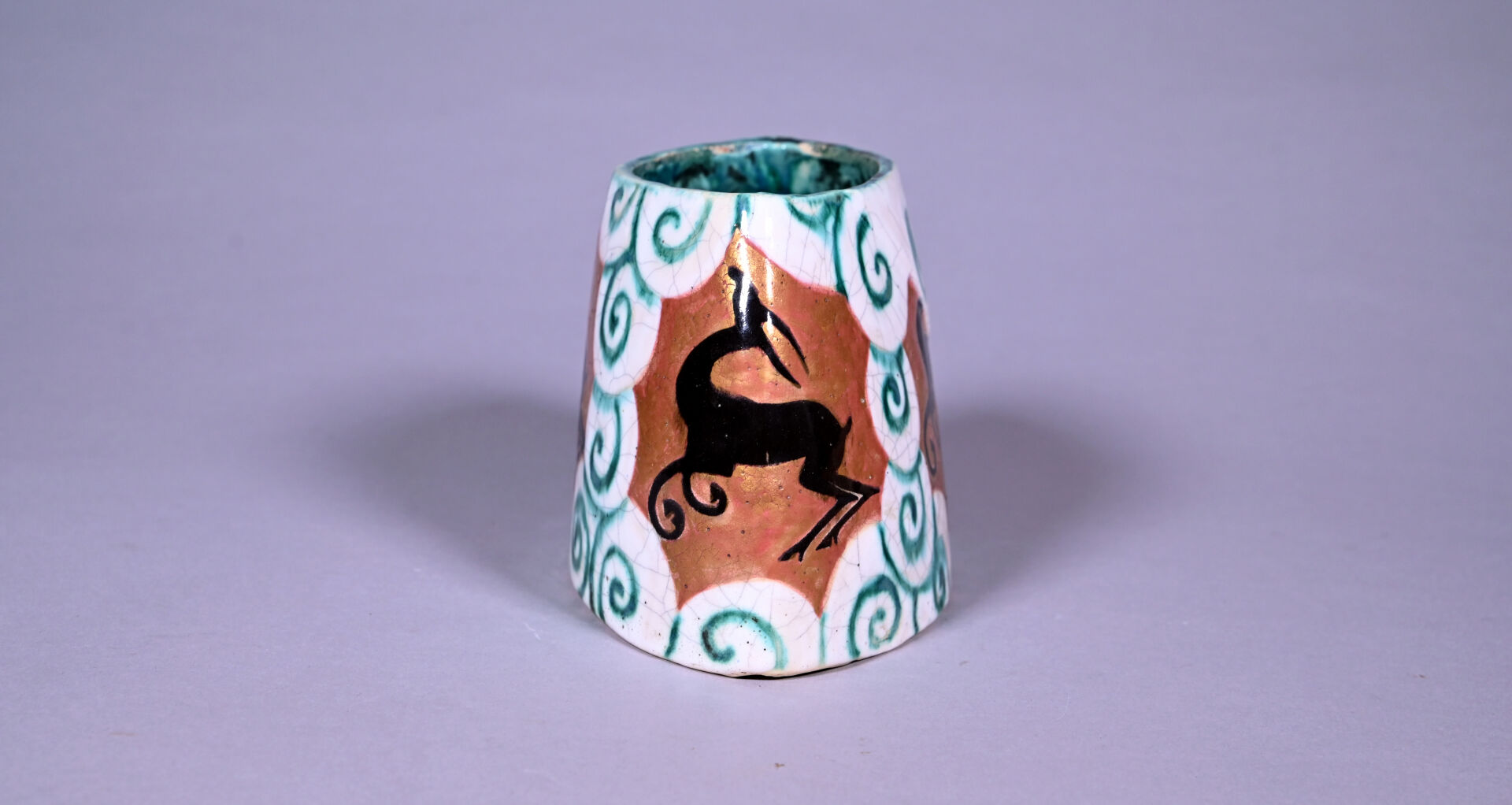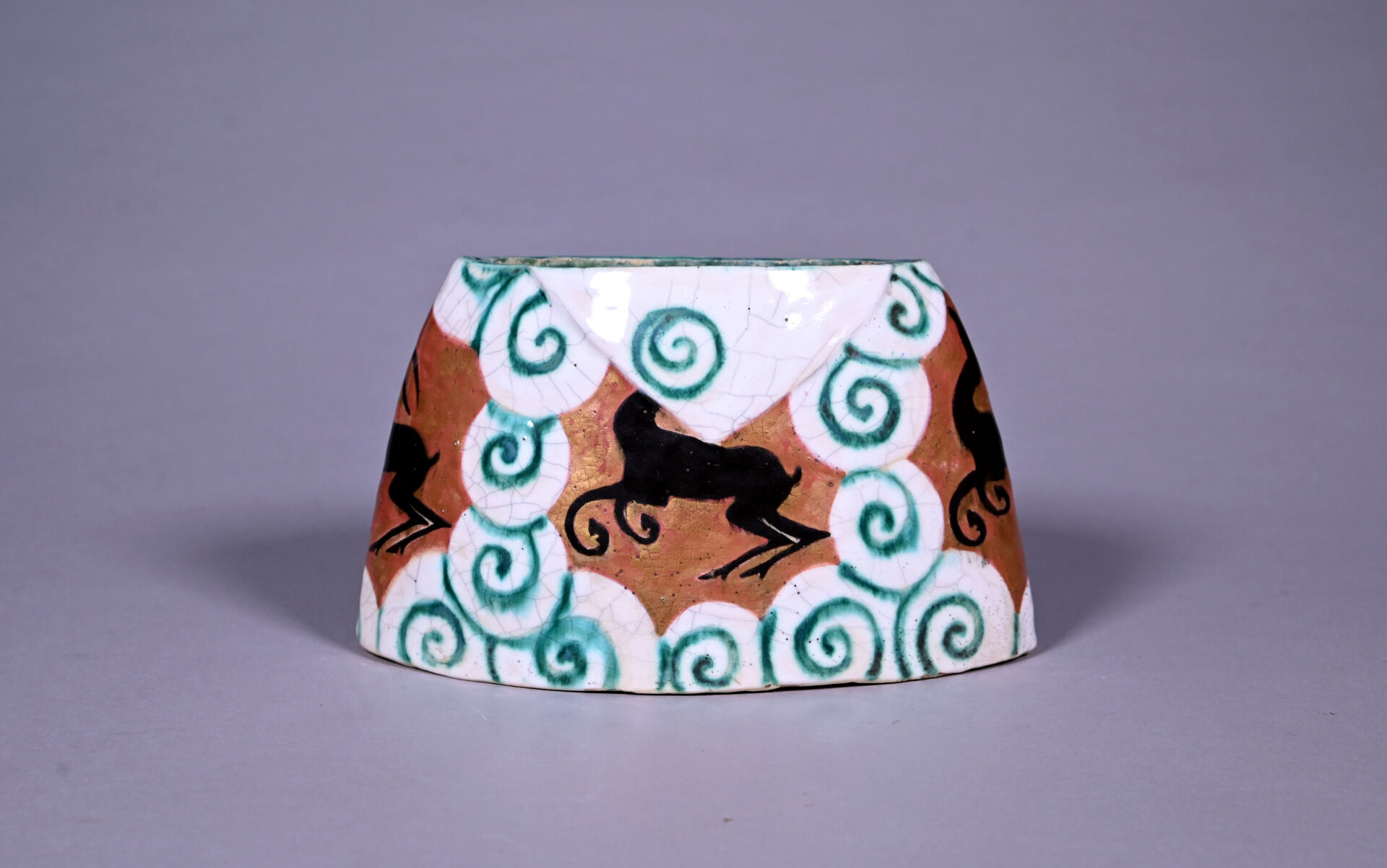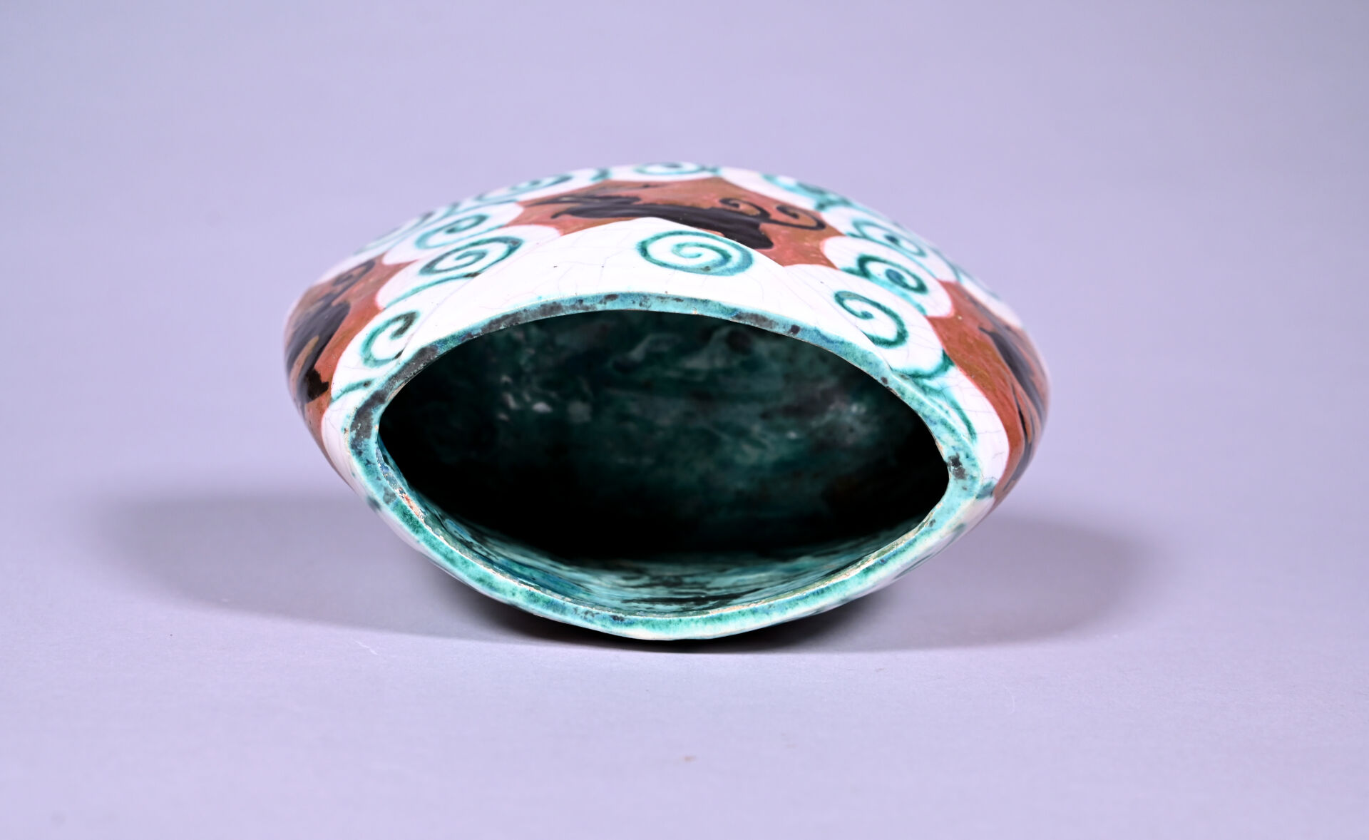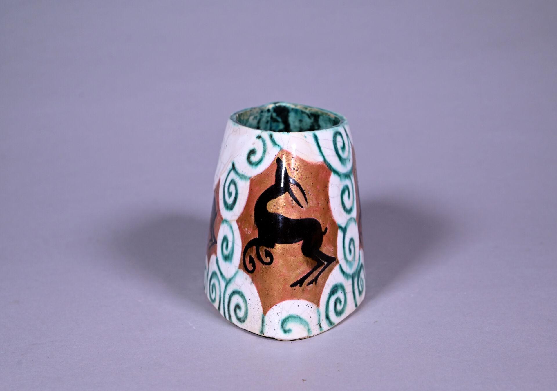Édouard CAZAUX (1889-1974). Vase navette en céramique émaillée d’antilopes en noir sur fond terracota et or et motifs de spirales en vert. Signé et numéroté 608. Haut. : 14 cm.
