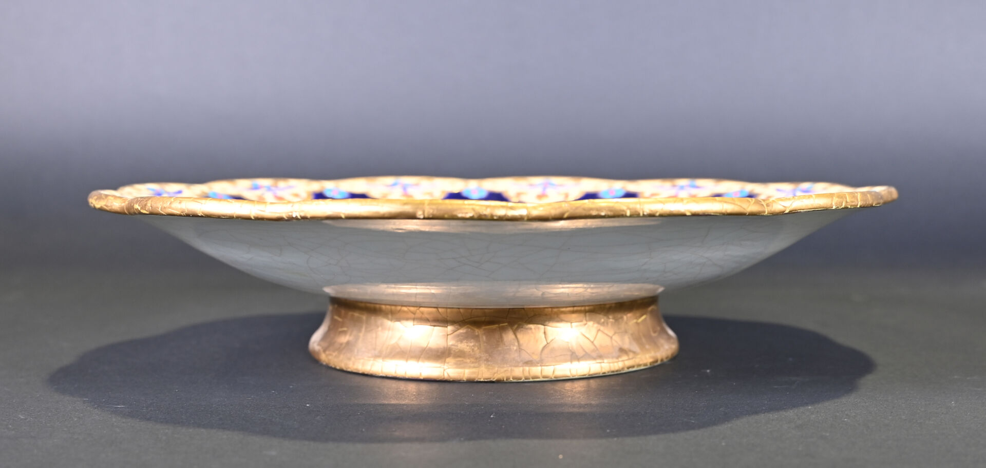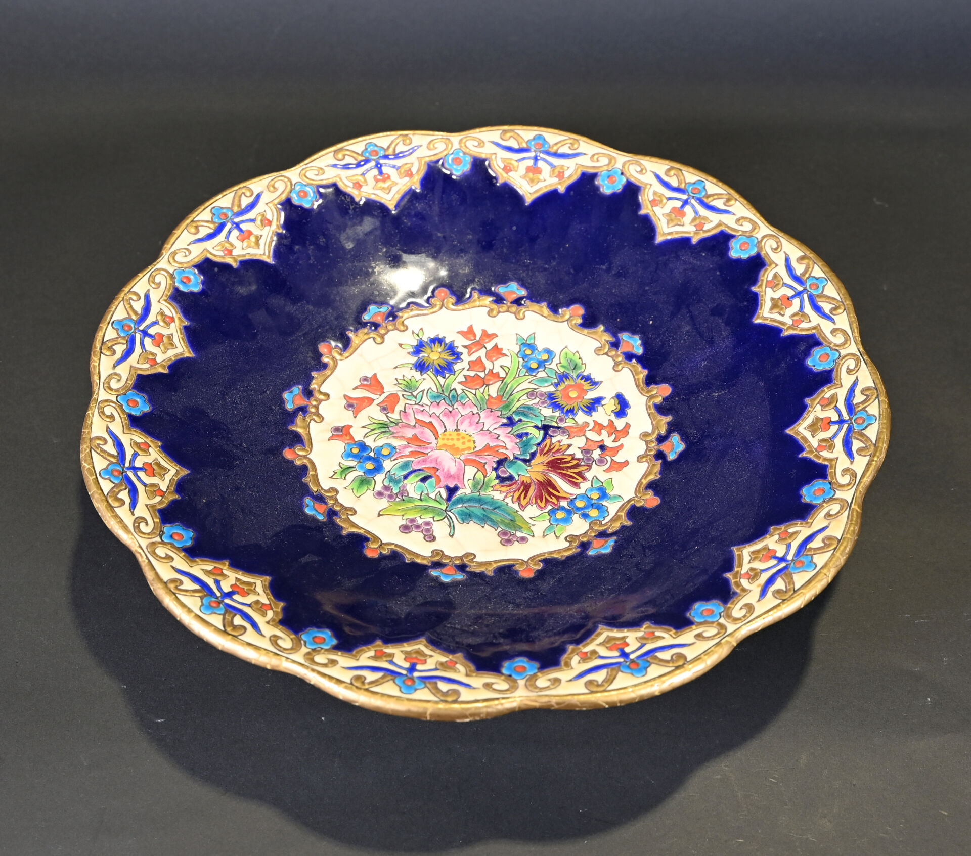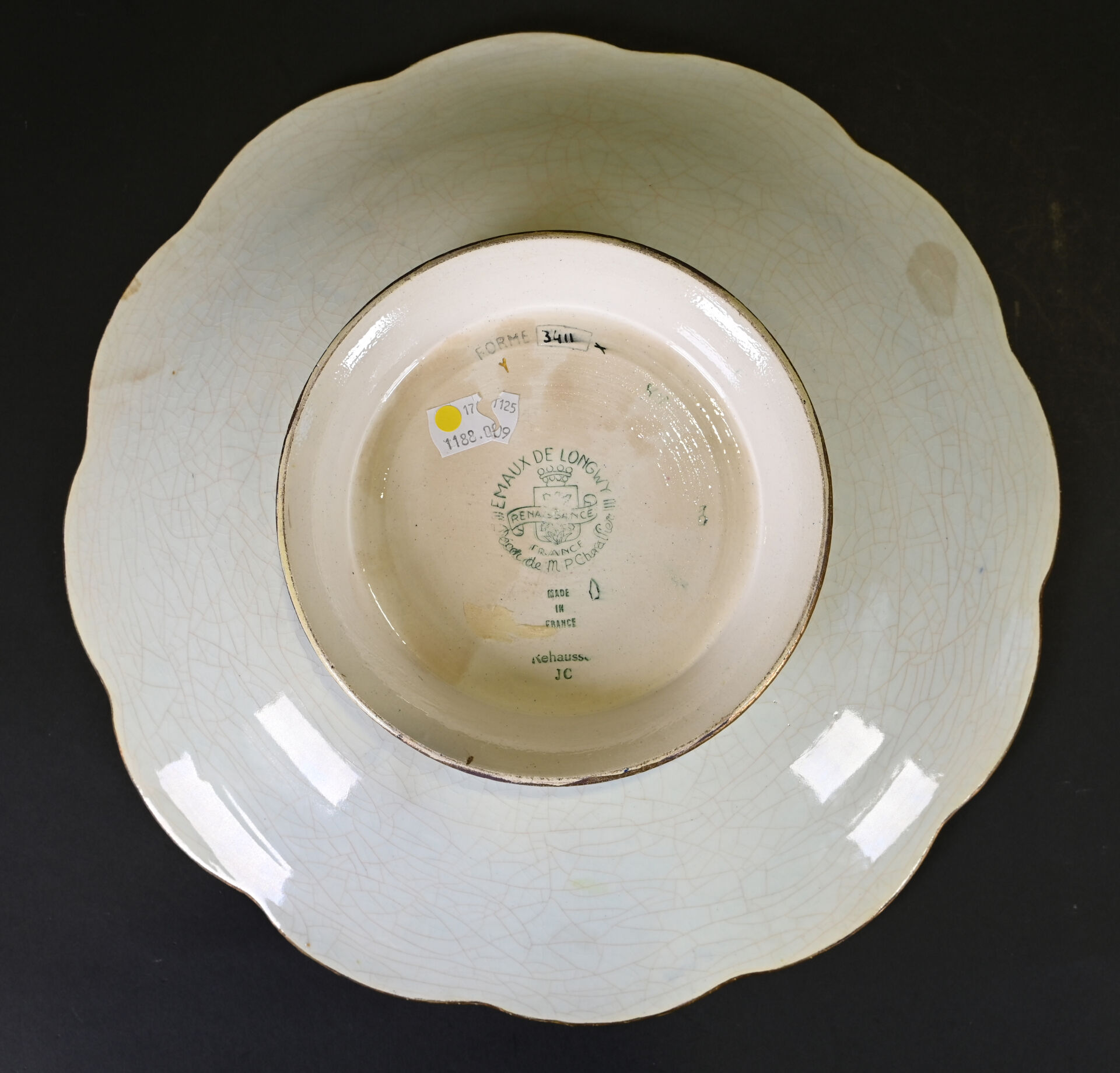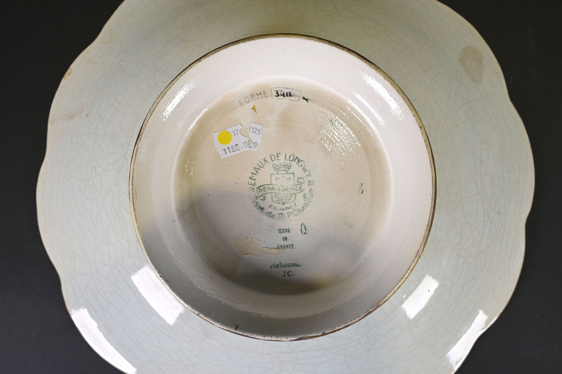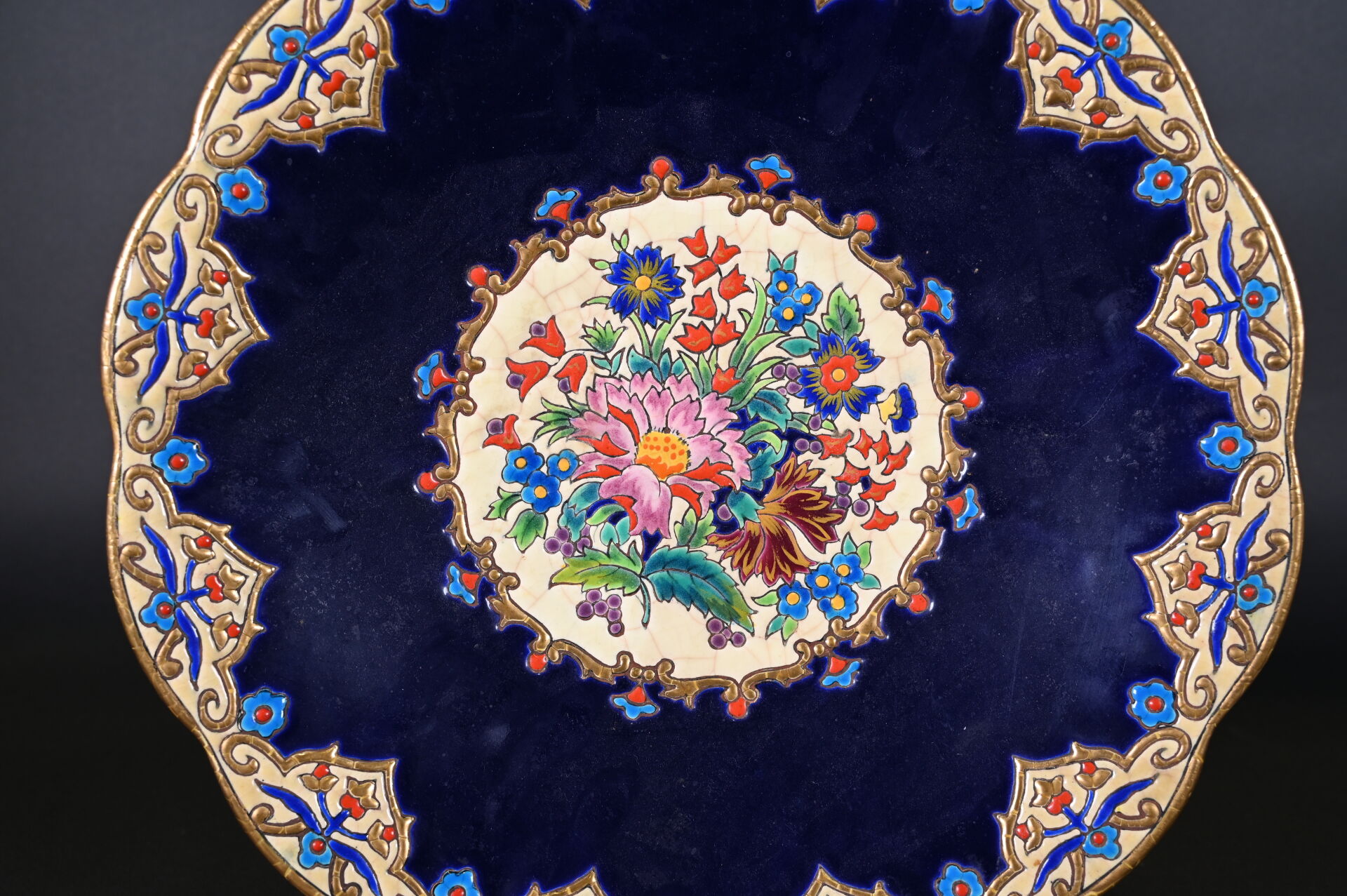 EMAUX DE LONGWY. Coupe sur pied en céramique émaillée en polychromie de fleurs, l’aile en bleu. Marquée au dessous. Haut. : 8 cm – Diam. : 35,5 cm.