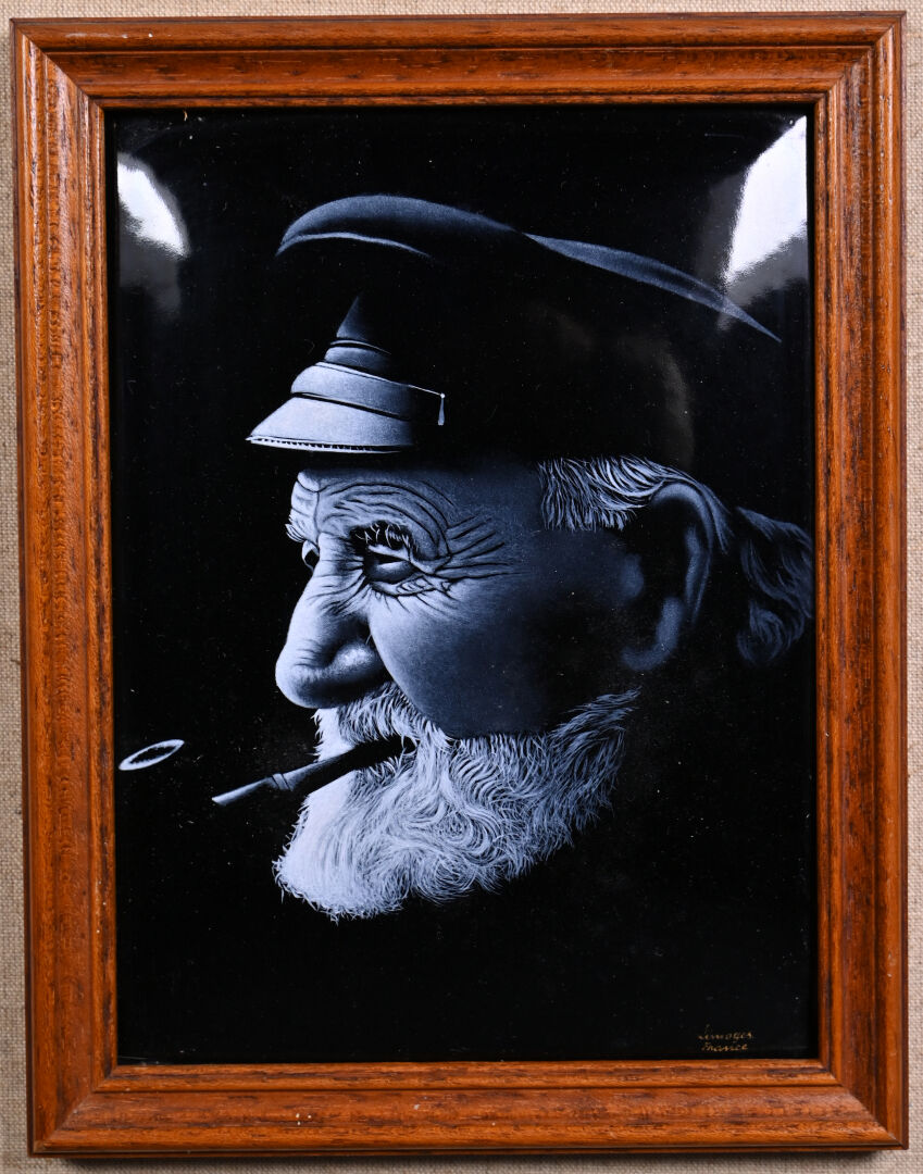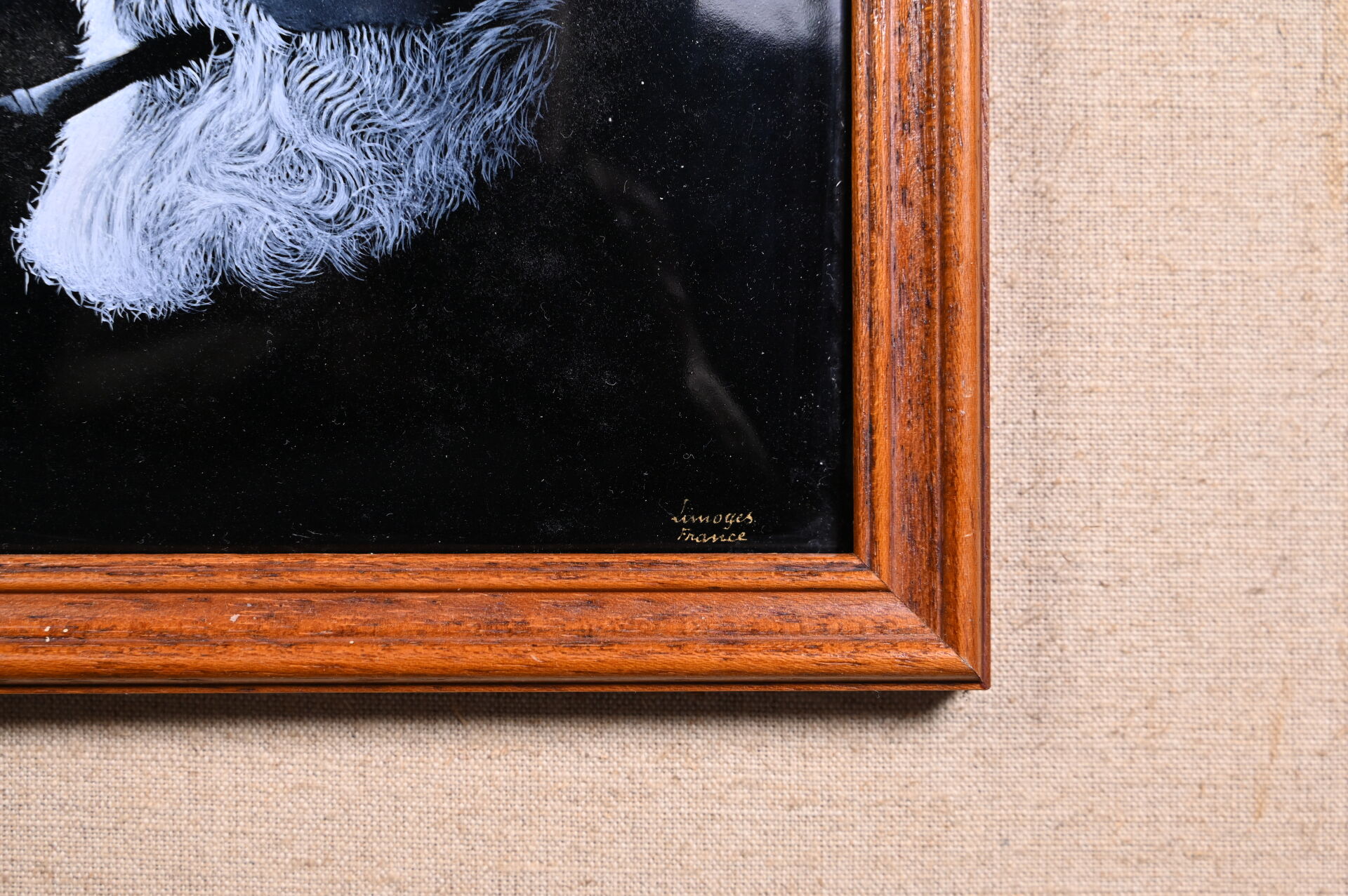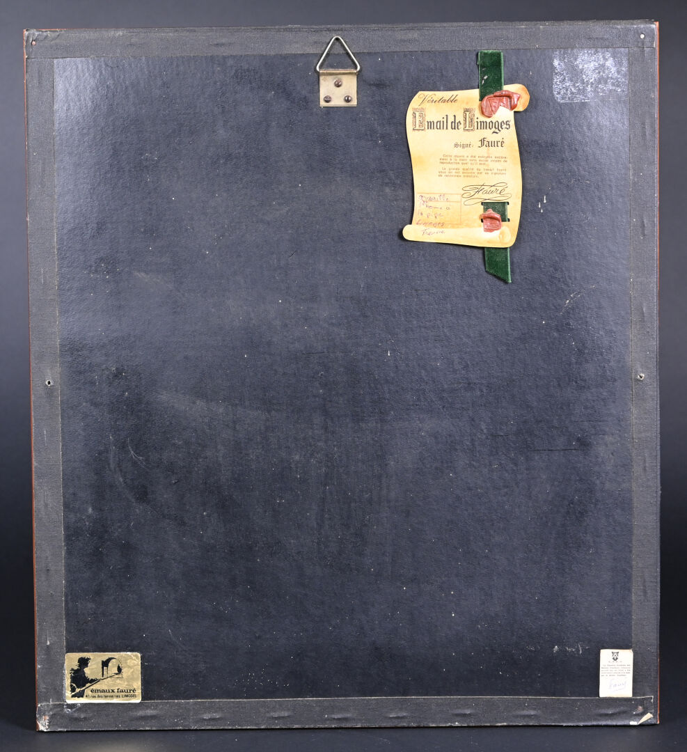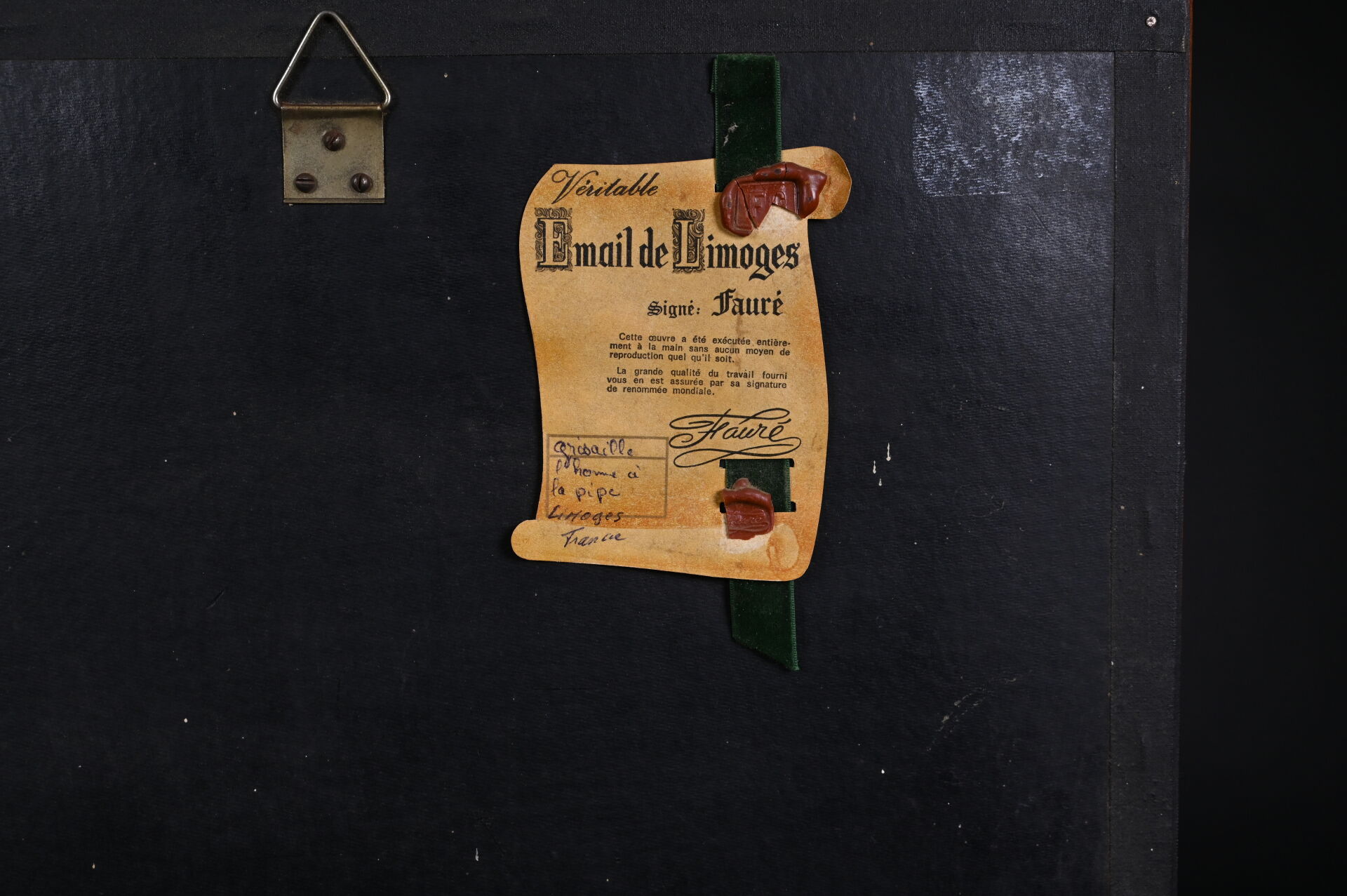 Emaux FAURE – Limoges. Plaque émaillée « Homme à la pipe » en grisaille. Marquée Limoges en bas à droite. Titrée via des étiquettes au dos. 19,5 x 14 cm.
