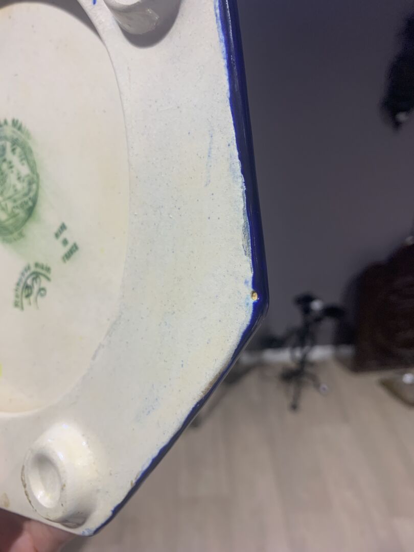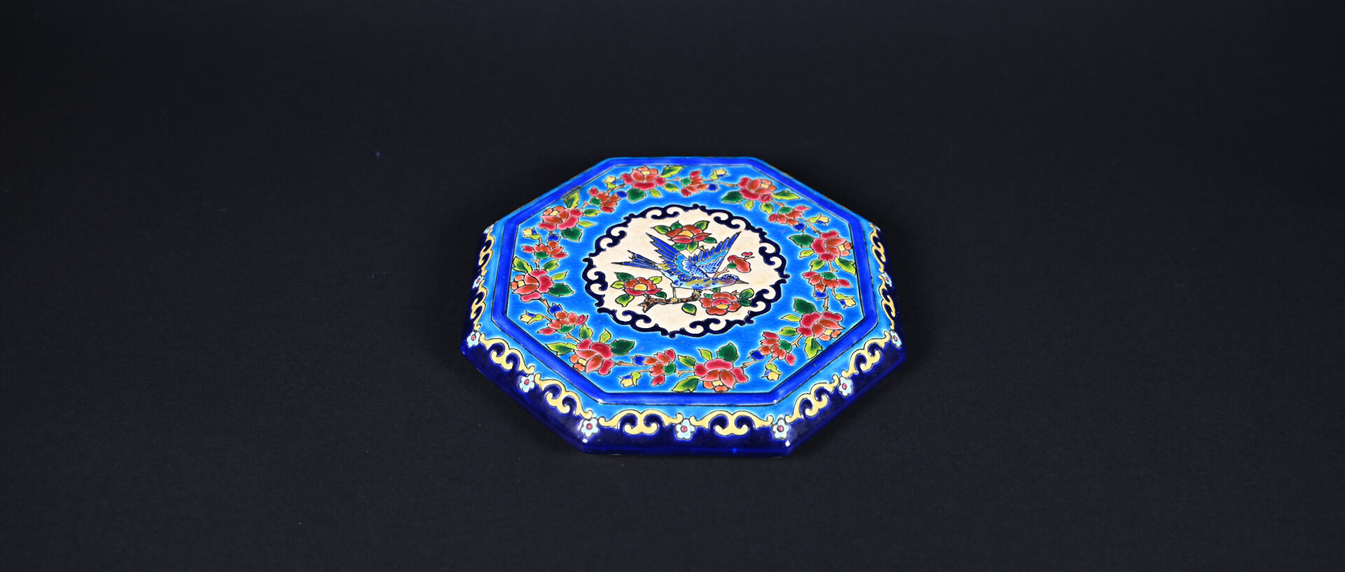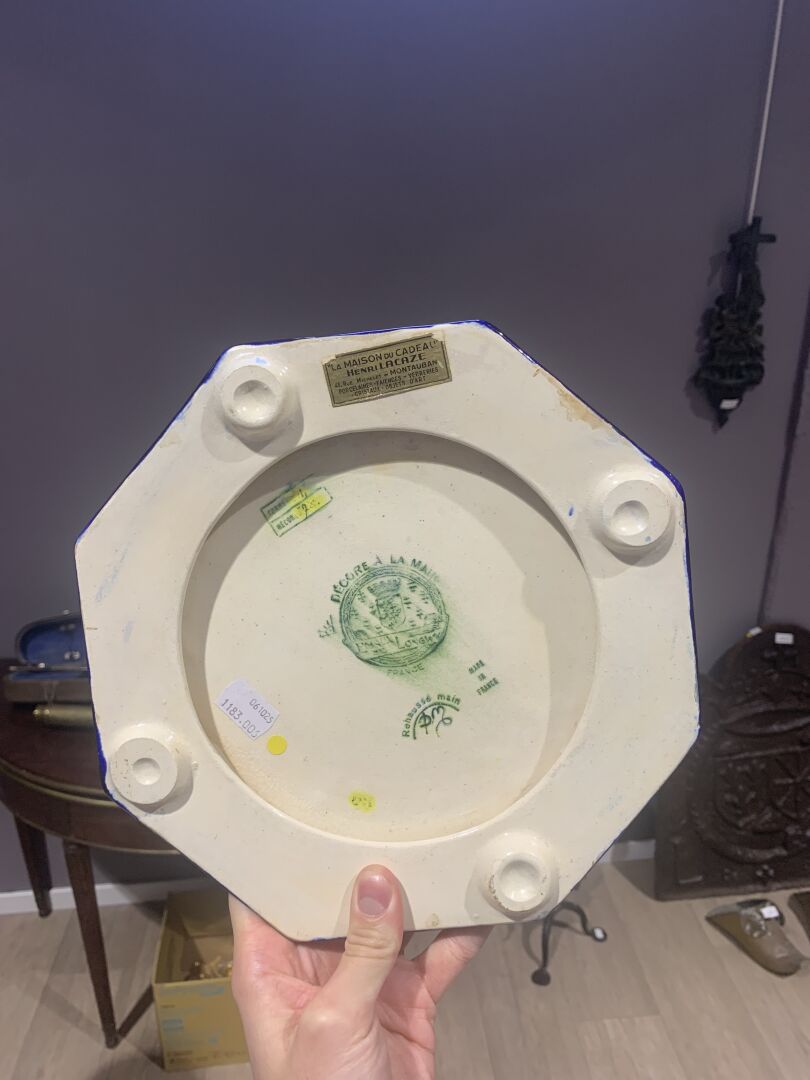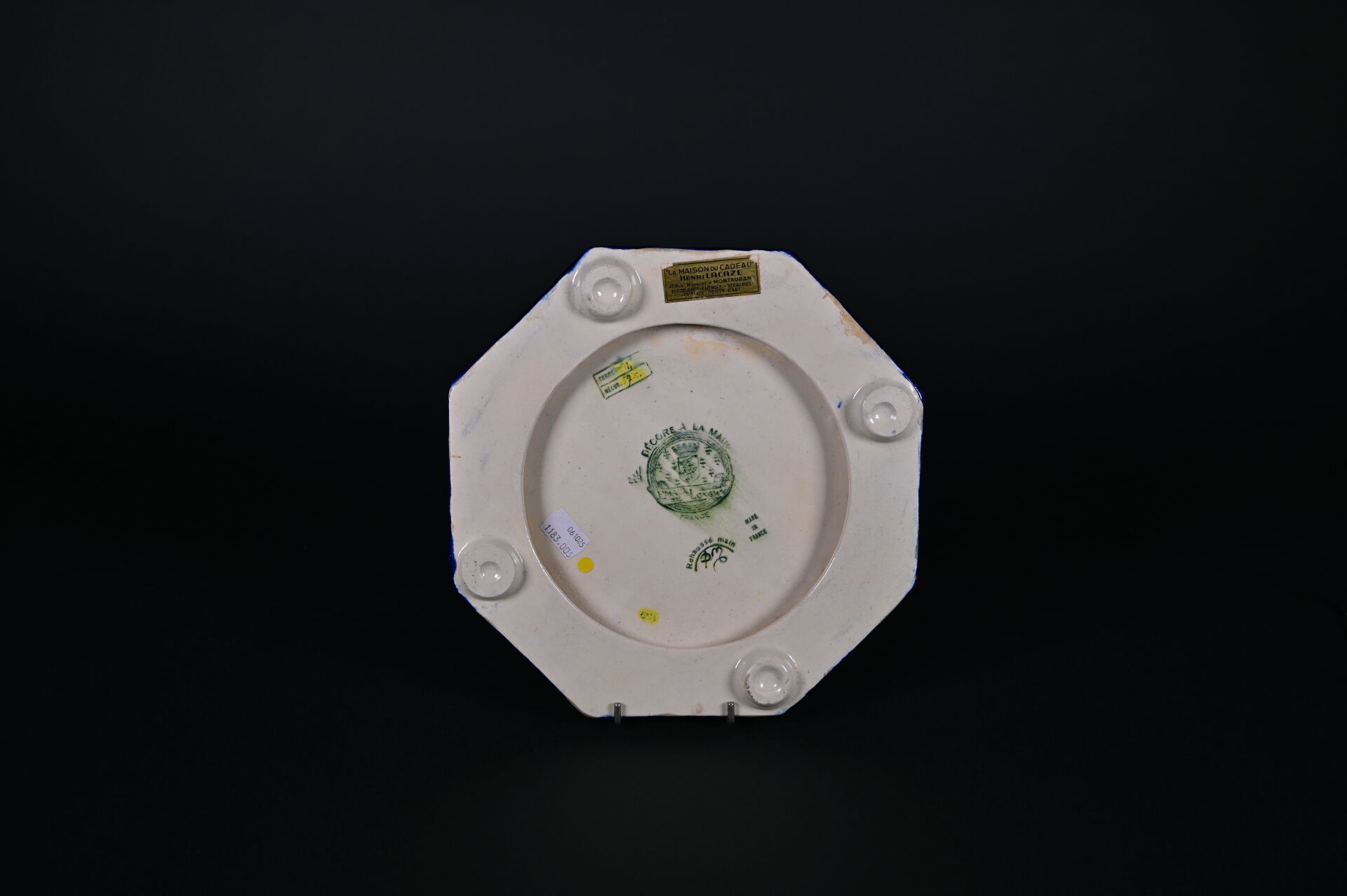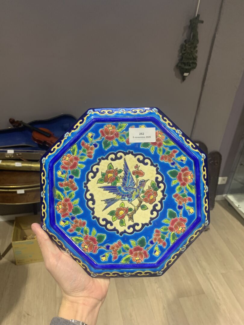 EMAUX GE LONGWY. Dessous de plat octogonal en faïence émaillée en polychromie, le centre à décor d’un oiseau branché (frottements, défauts de cuisson). Marqué au dessous. 25,5 x 25,5 cm.