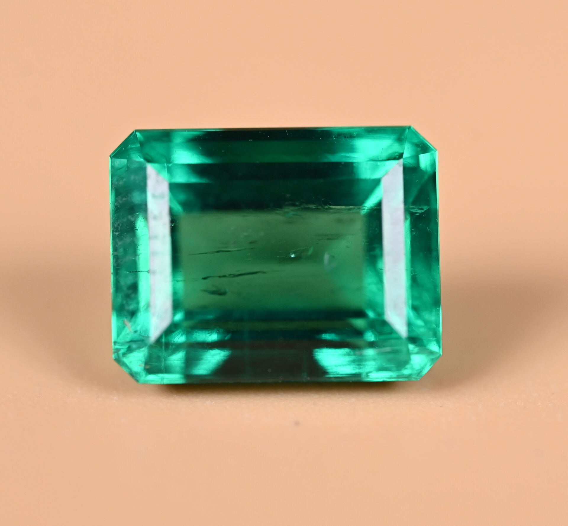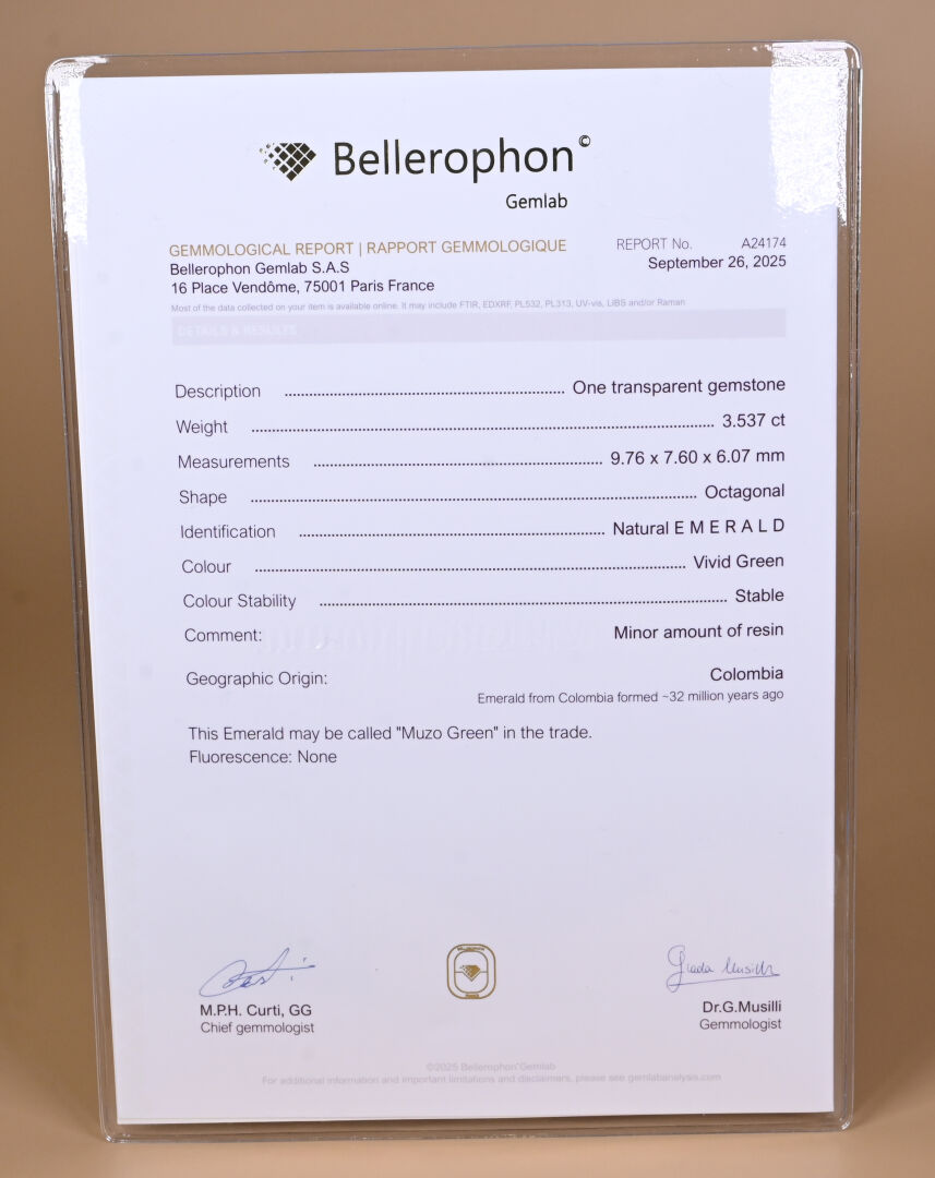 Émeraude sur papier. 3,53 carats. Accompagnée de son rapport de gemmologie (26/09/2025) précisant, selon leur opinion : Dimensions 9,76 x 7,60 x 6,07 mm – Couleur Vivid Green – Origine Colombie (Mine Muzo) – Trace mineur de résine.